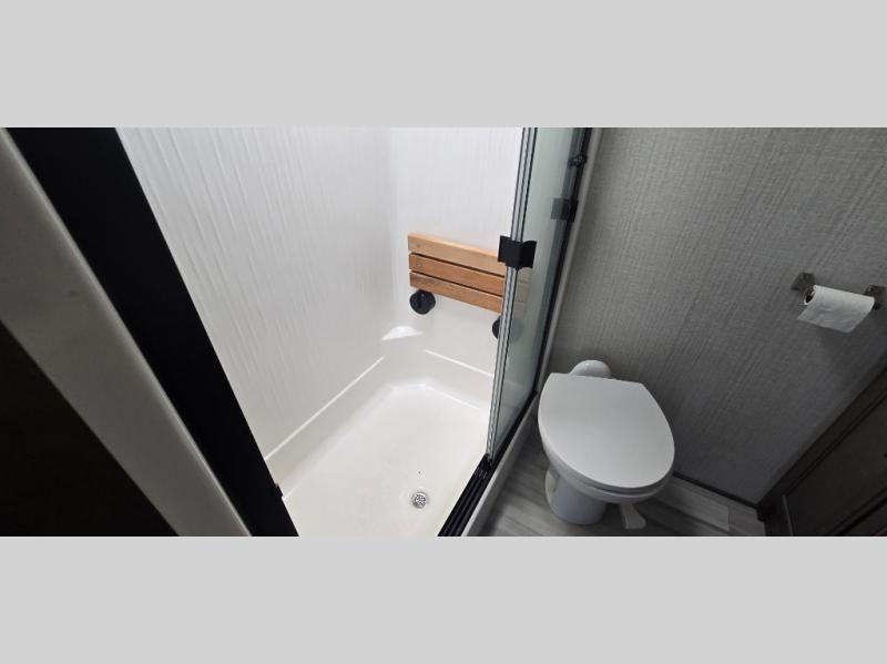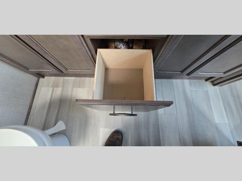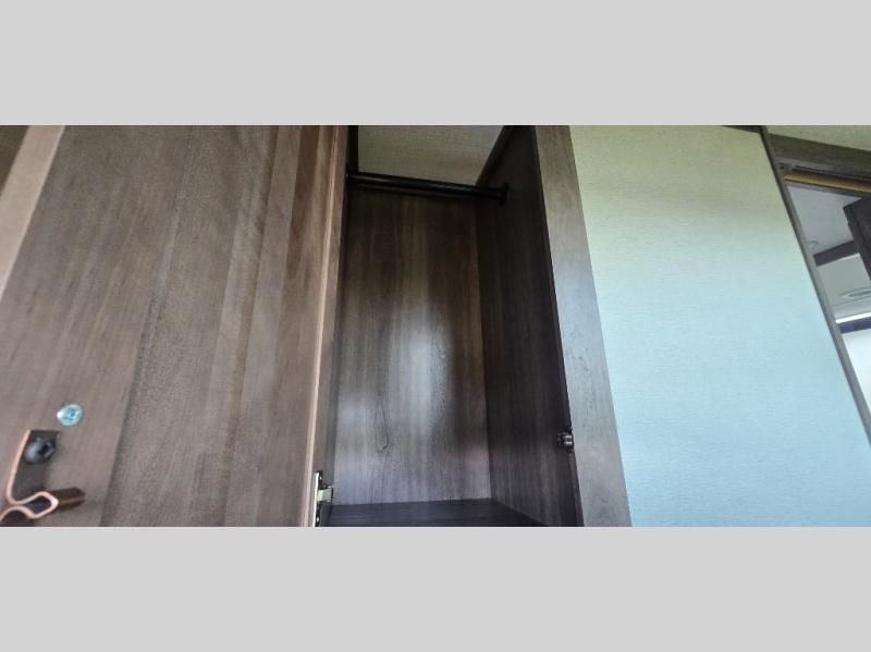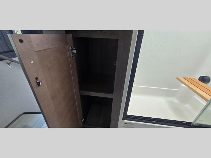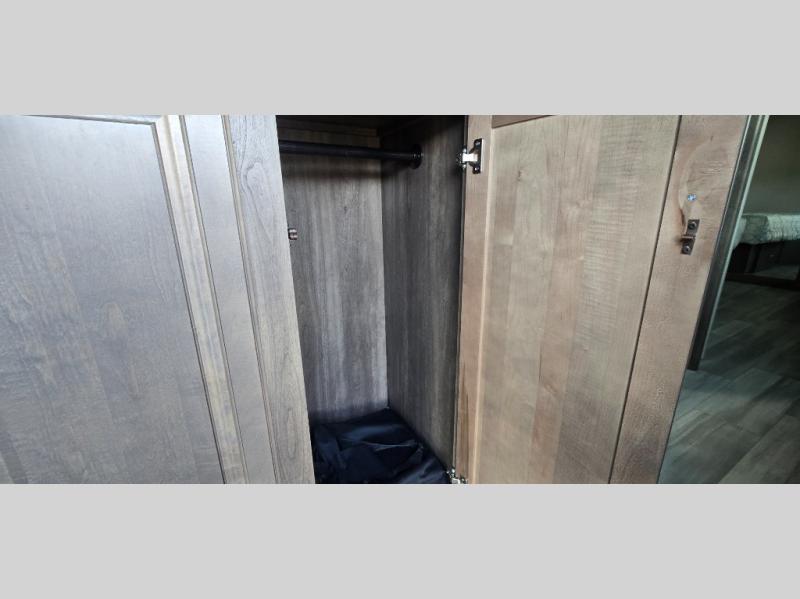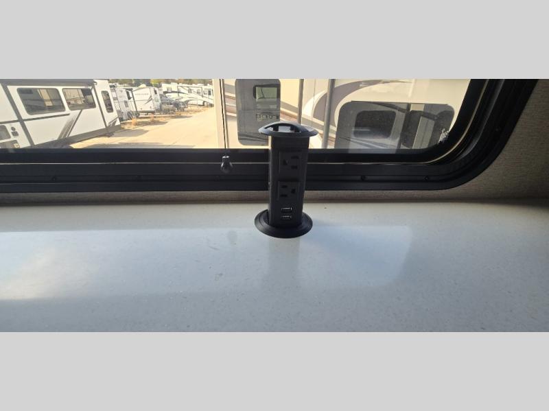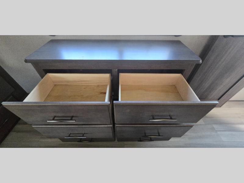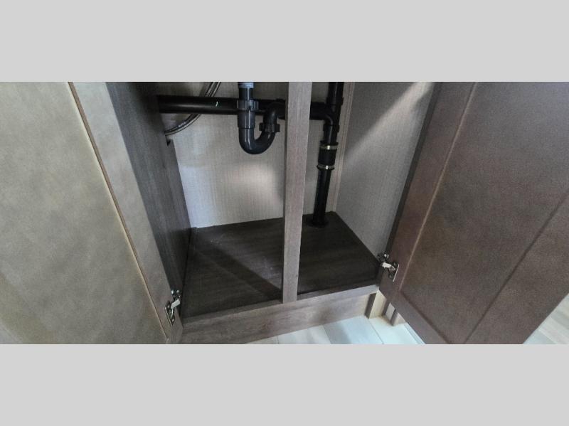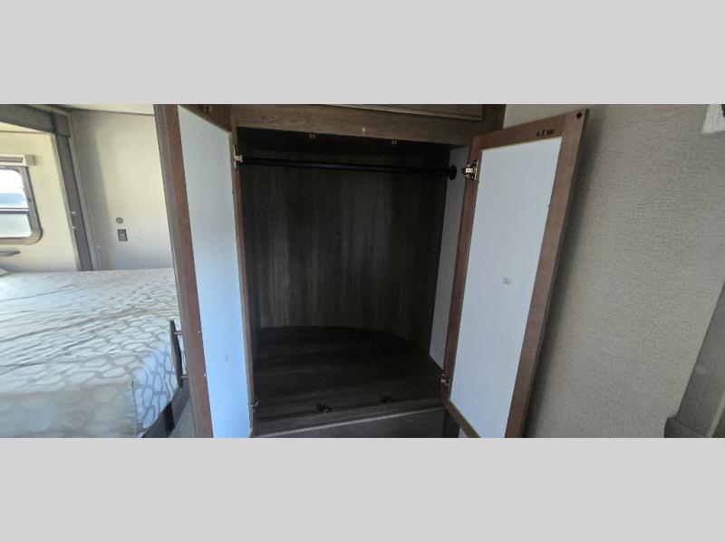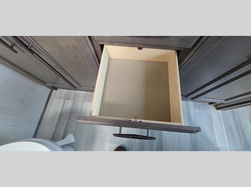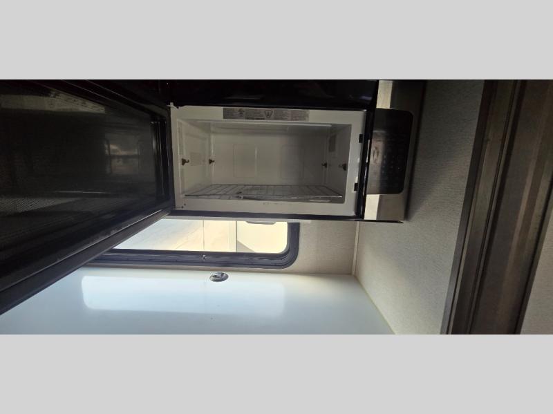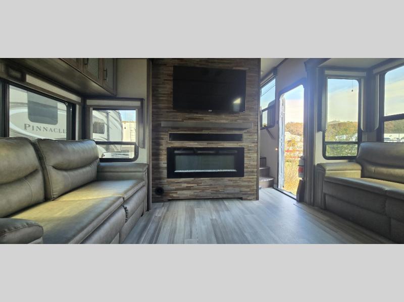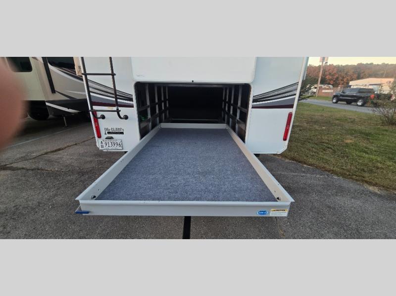 Enjoy each and every vacation, month-long trip or even extended stay at an RV park in this fifth wheel that is spacious from the front to the rear! The raised kitchen gives the cook plenty of room to whip up any type of meal using the stainless steel appliances including the 24" residential oven, the oversized pantry and the raised bar top will provide you even more counter space on top of dining with two chairs that overlook the middle living area. Relaxing is made easy with the two tri-fold sofas and theatre seating while watching the big game on the LED Smart TV and enjoying the fireplace below. Dual sinks in the full bathroom allow two people to easily get ready at once, and the seat in the shower is a nice convenience. At night, retire to your own queen bed slide after sitting on the pull-out ottoman to take your shoes off, and enjoy a show on the LED TV above the flip-top dresser, or wash some linens in the closet with a washer/dryer if you added that option.
