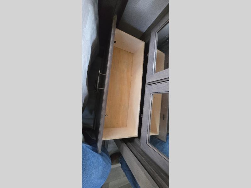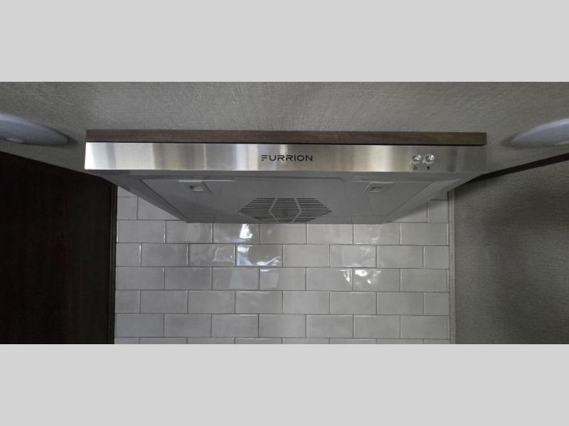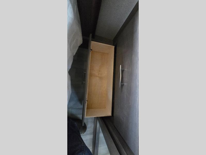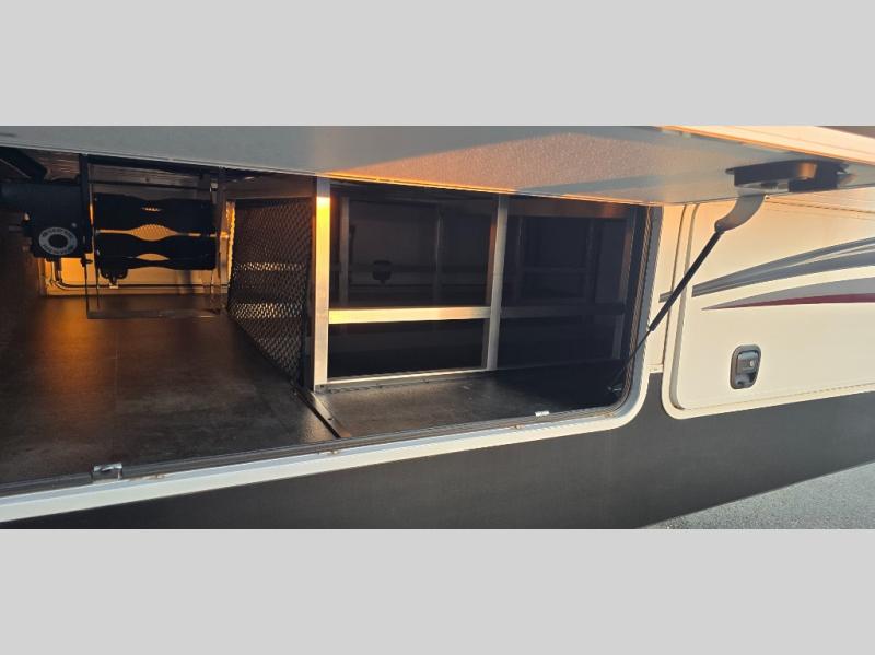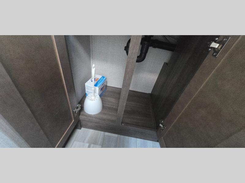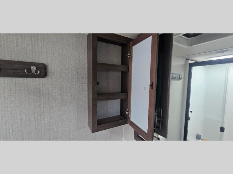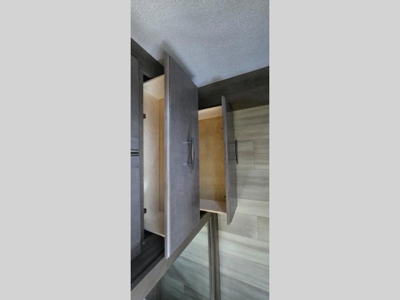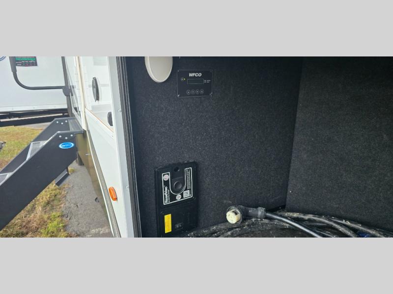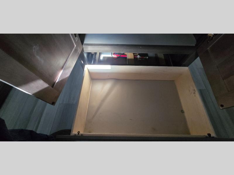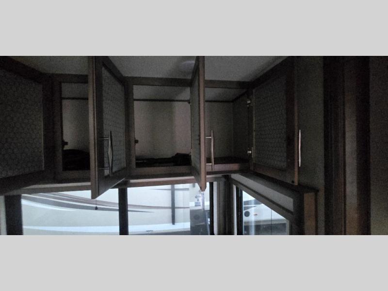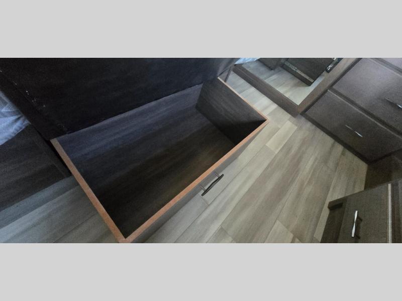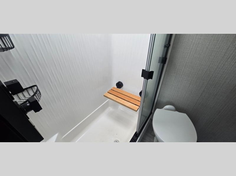 Enjoy each and every vacation, month-long trip or even extended stay at an RV park in this fifth wheel that is spacious from the front to the rear! The raised kitchen gives the cook plenty of room to whip up any type of meal using the stainless steel appliances including the 24" residential oven, the oversized pantry and the raised bar top will provide you even more counter space on top of dining with two chairs that overlook the middle living area. Relaxing is made easy with the two tri-fold sofas and theatre seating while watching the big game on the LED Smart TV and enjoying the fireplace below. Dual sinks in the full bathroom allow two people to easily get ready at once, and the seat in the shower is a nice convenience. At night, retire to your own queen bed slide after sitting on the pull-out ottoman to take your shoes off, and enjoy a show on the LED TV above the flip-top dresser, or wash some linens in the closet with a washer/dryer if you added that option.