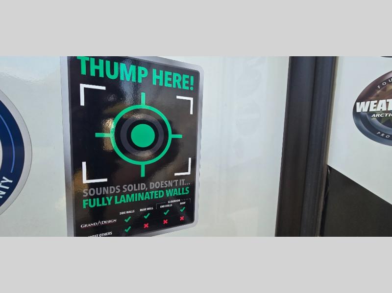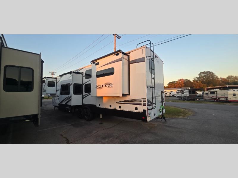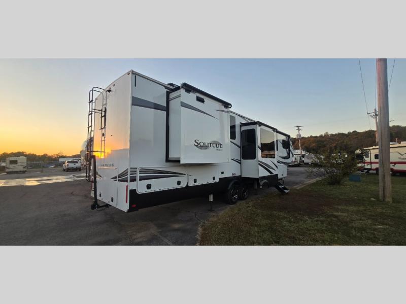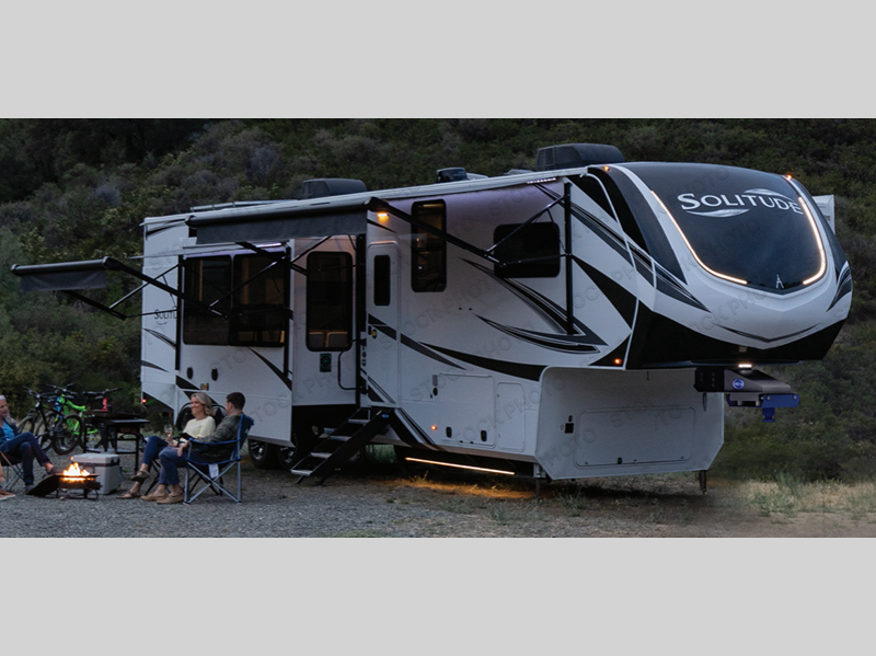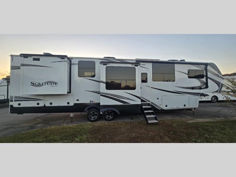 Each Solitude fifth wheel by Grand Design features a 101" wide-body construction, heavy duty 7,000 lb. axles, frameless tinted windows, and high-gloss gel coat sidewalls. You can camp year around thanks to the Weather-Tek Package that includes a 35K BTU high-capacity furnace, an all-in-one enclosed and heated utility center, and a fully enclosed underbelly with heated tanks and storage. Inside, you'll love the premium roller shades, hardwood cabinet doors, solid surface countertops and sinks, plus residential finishes throughout to make you truly feel at home. Each model also includes a MORryde CRE3000 suspension system, self adjusting brakes, and a MORryde pin box that will provide smooth towing from home to campground. Affordable luxury is possible with the Solitude fifth wheels; choose yours today!