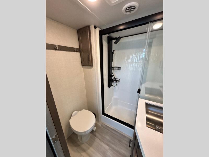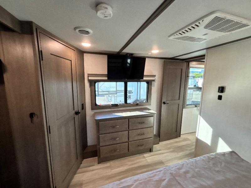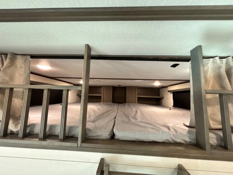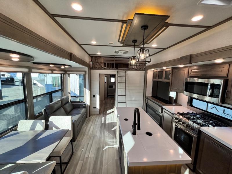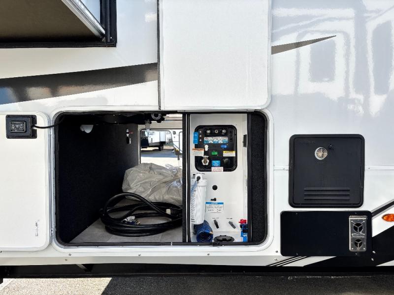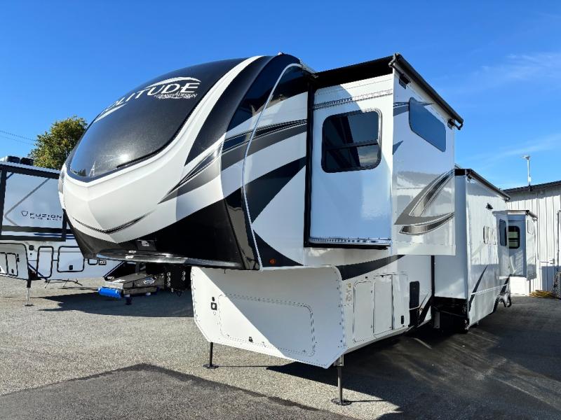 For an affordable luxury extended stay for your family, this Solitude is it! Two private bedrooms plus an overhead Sky Suite loft above the rear bedroom which also has it's own private rear entry/exit door is just the beginning of what is in store for your camping convenience. You will love the spacious feel that the Solitude provides with taller ceilings, larger scenic windows, and an interior width of 8' 5", not to mention FIVE slides in this unit alone. You may not even want to go home once you get a look inside. The upscale kitchen features an island with dishwasher prep, a large single bowl sink, a 12V 20 cu. ft. refrigerator for your perishables, and a 24" residential oven, not to mention you will also enjoy a microwave, pantry, and hutch for your dishes, plus a free standing dinette! You can easily take along extra family and friends with the second private bedroom featuring it's own private bath and entry which is great for another couple, and there is even loft space above this rear private bedroom for added storage or sleeping for children. Both bathrooms feature a shower with skylight, vanity and sink, plus a toilet. And, you will find ample storage for clothing and belongings throughout with nice size closets, overhead cabinets, plus loads of outside storage. Speaking of outside, this unit features a spray port for rinsing off before heading inside, two awnings, a USB charging outlet, and four step aluminum shock assist entry steps at both entrances.