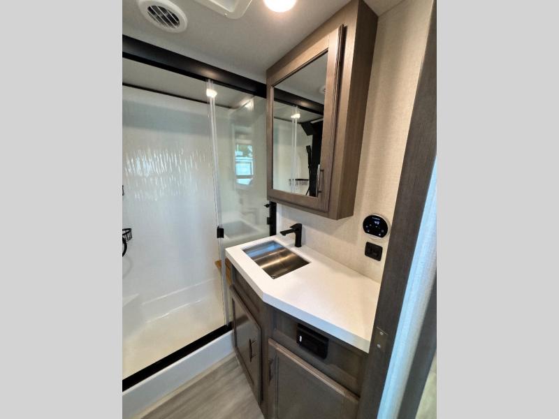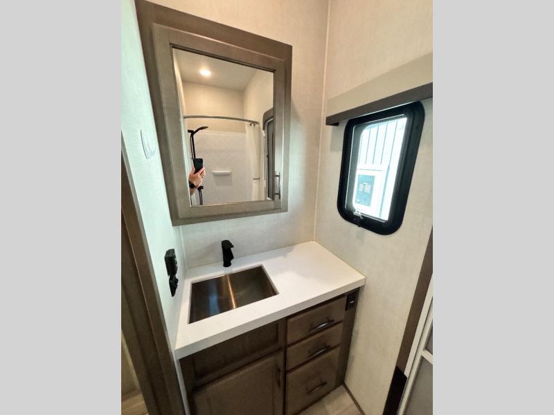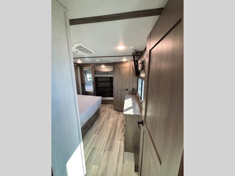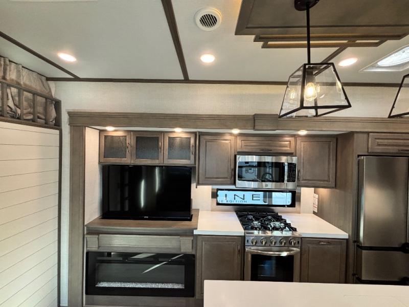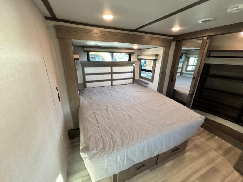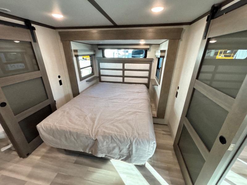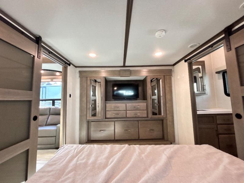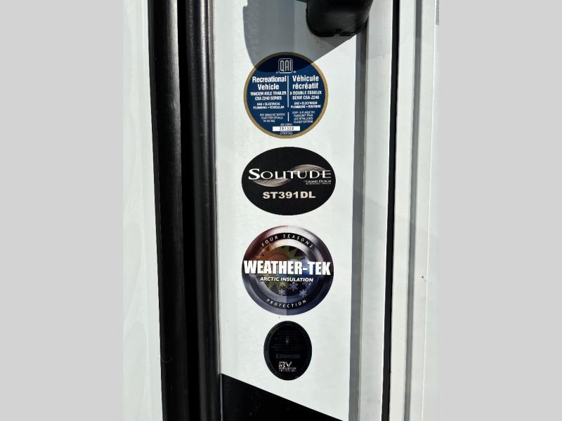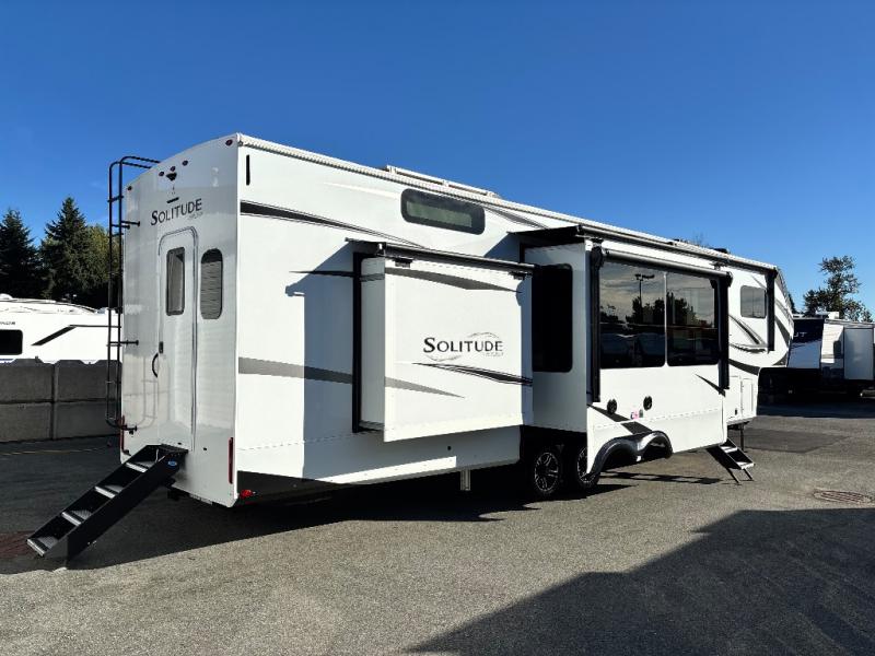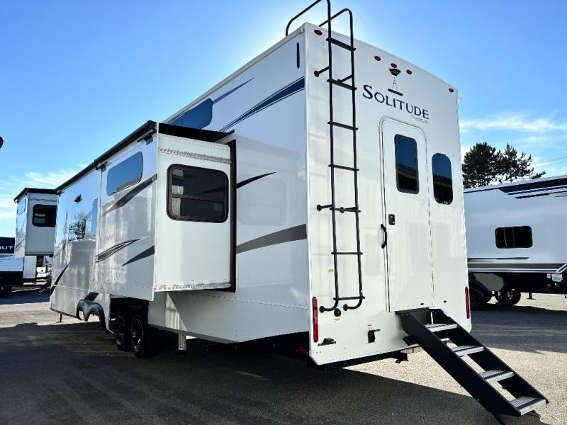 Each Solitude fifth wheel by Grand Design features a 101" wide-body construction, heavy duty 7,000 lb. axles, frameless tinted windows, and high-gloss gel coat sidewalls. You can camp year around thanks to the Weather-Tek Package that includes a 35K BTU high-capacity furnace, an all-in-one enclosed and heated utility center, and a fully enclosed underbelly with heated tanks and storage. Inside, you'll love the premium roller shades, hardwood cabinet doors, solid surface countertops and sinks, plus residential finishes throughout to make you truly feel at home. Each model also includes a MORryde CRE3000 suspension system, self adjusting brakes, and a MORryde pin box that will provide smooth towing from home to campground. Affordable luxury is possible with the Solitude fifth wheels; choose yours today!