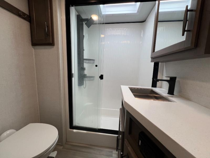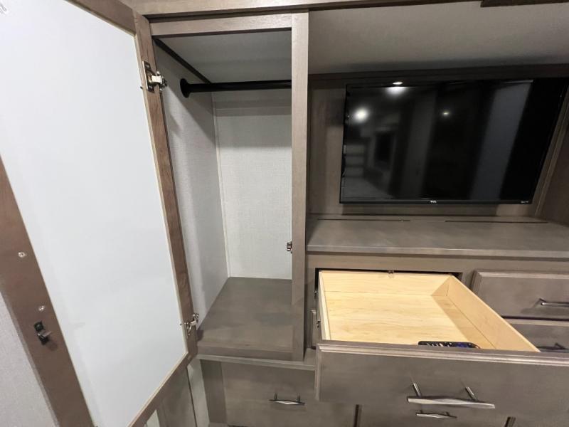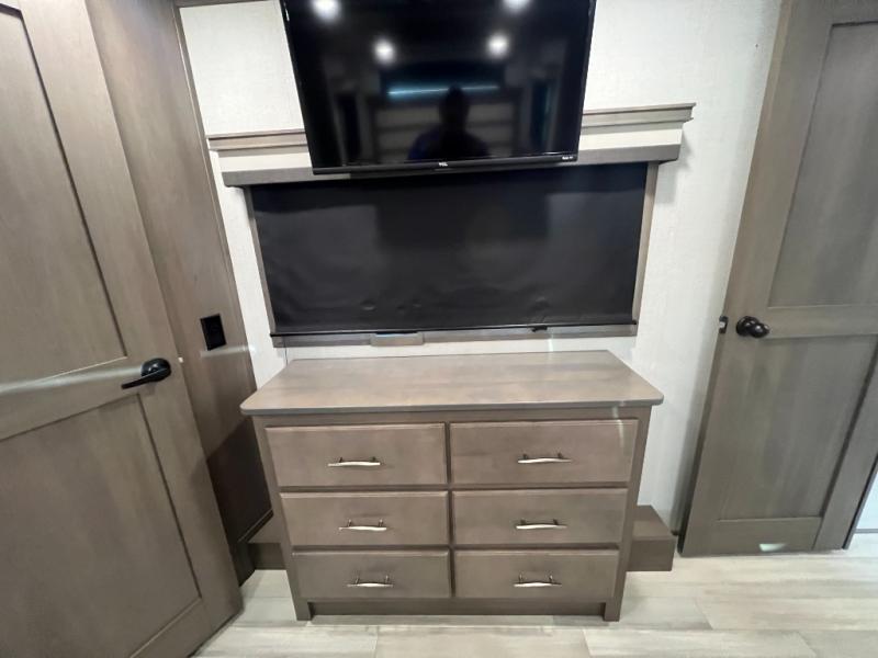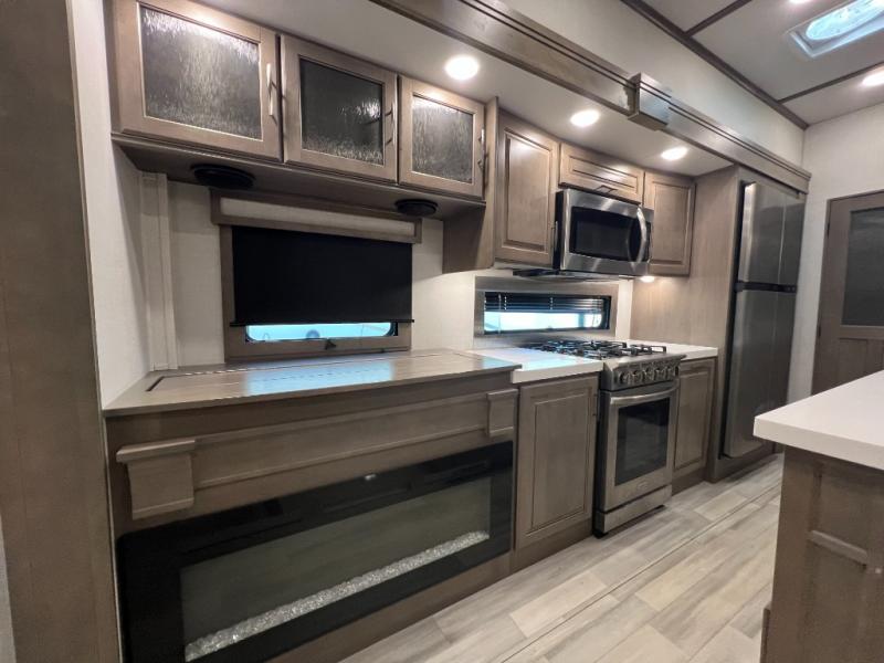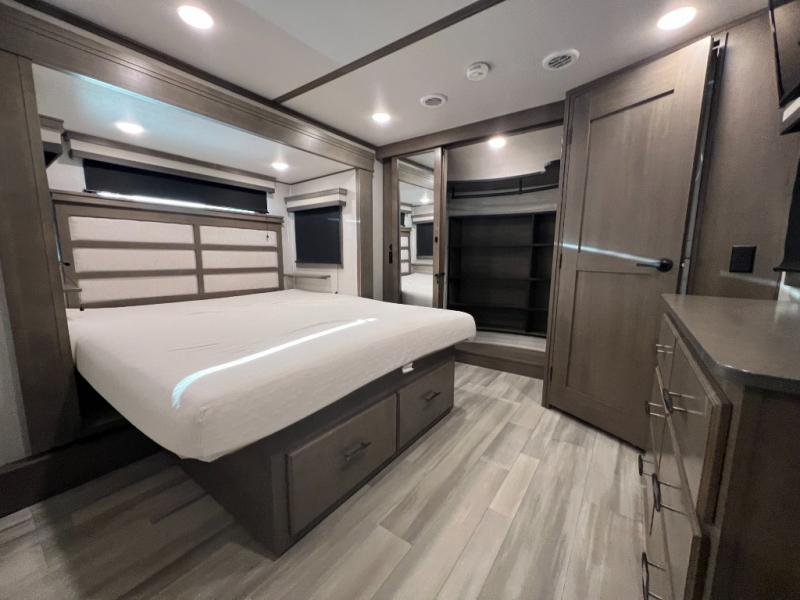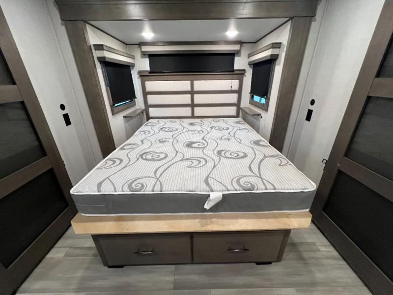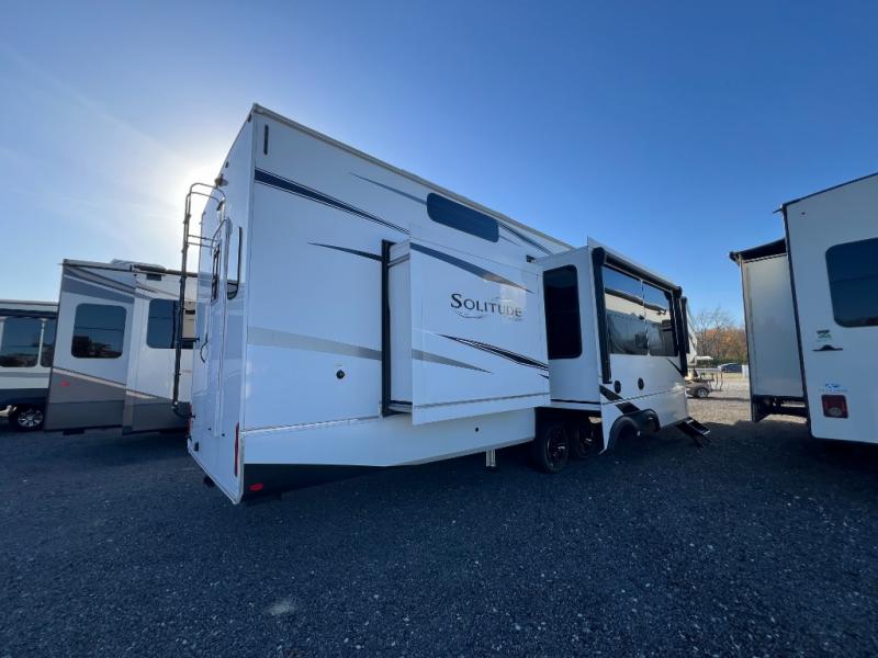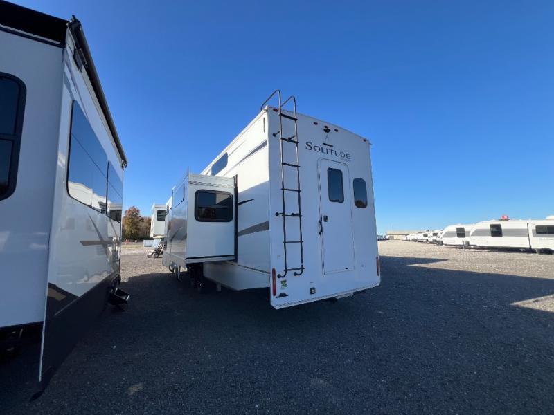 Each Solitude fifth wheel by Grand Design features a 101" wide-body construction, heavy duty 7,000 lb. axles, frameless tinted windows, and high-gloss gel coat sidewalls. You can camp year around thanks to the Weather-Tek Package that includes a 35K BTU high-capacity furnace, an all-in-one enclosed and heated utility center, and a fully enclosed underbelly with heated tanks and storage. Inside, you'll love the premium roller shades, hardwood cabinet doors, solid surface countertops and sinks, plus residential finishes throughout to make you truly feel at home. Each model also includes a MORryde CRE3000 suspension system, self adjusting brakes, and a MORryde pin box that will provide smooth towing from home to campground. Affordable luxury is possible with the Solitude fifth wheels; choose yours today!