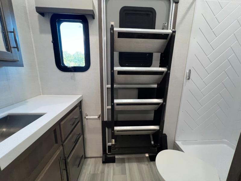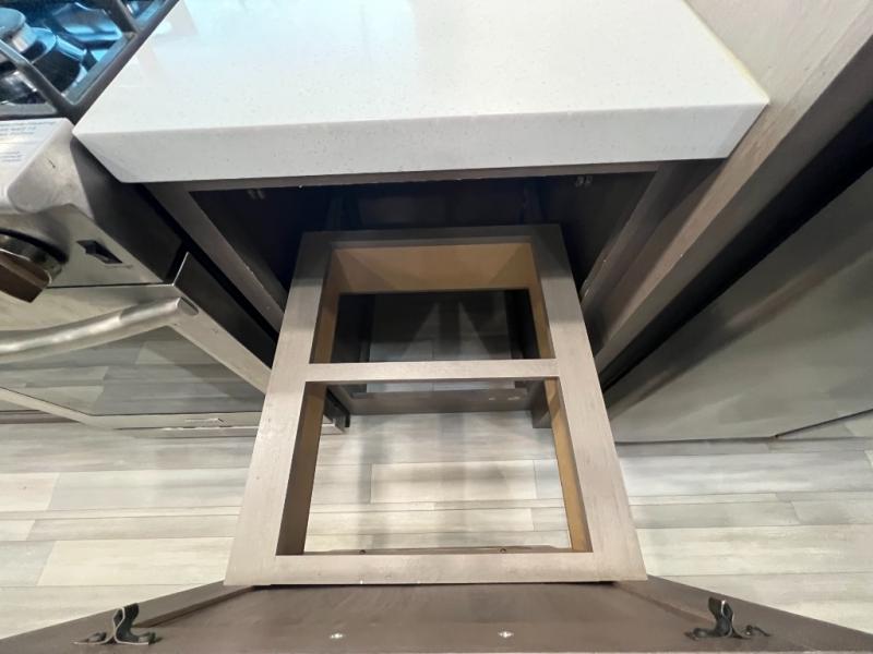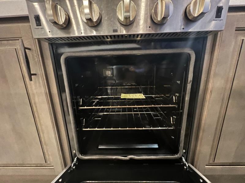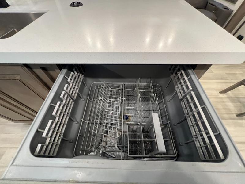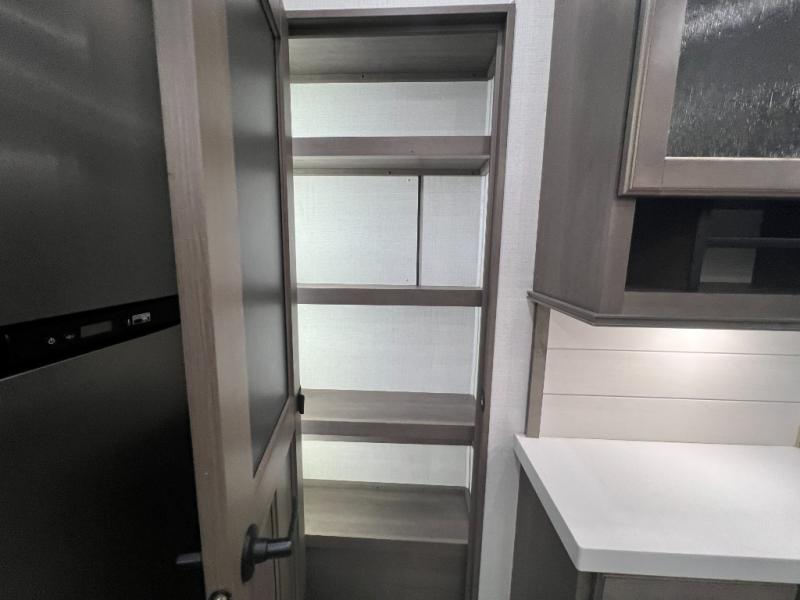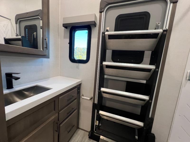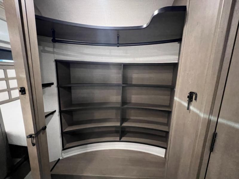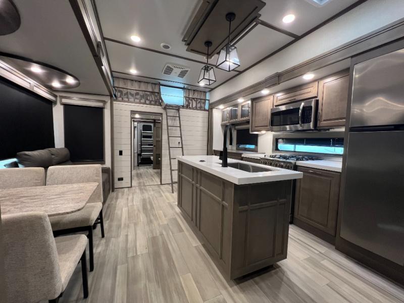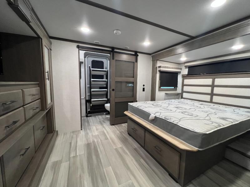 For an affordable luxury extended stay for your family, this Solitude is it! Two private bedrooms plus an overhead Sky Suite loft above the rear bedroom which also has it's own private rear entry/exit door is just the beginning of what is in store for your camping convenience. You will love the spacious feel that the Solitude provides with taller ceilings, larger scenic windows, and an interior width of 8' 5", not to mention FIVE slides in this unit alone. You may not even want to go home once you get a look inside. The upscale kitchen features an island with dishwasher prep, a large single bowl sink, a 12V 20 cu. ft. refrigerator for your perishables, and a 24" residential oven, not to mention you will also enjoy a microwave, pantry, and hutch for your dishes, plus a free standing dinette! You can easily take along extra family and friends with the second private bedroom featuring it's own private bath and entry which is great for another couple, and there is even loft space above this rear private bedroom for added storage or sleeping for children. Both bathrooms feature a shower with skylight, vanity and sink, plus a toilet. And, you will find ample storage for clothing and belongings throughout with nice size closets, overhead cabinets, plus loads of outside storage. Speaking of outside, this unit features a spray port for rinsing off before heading inside, two awnings, a USB charging outlet, and four step aluminum shock assist entry steps at both entrances.
