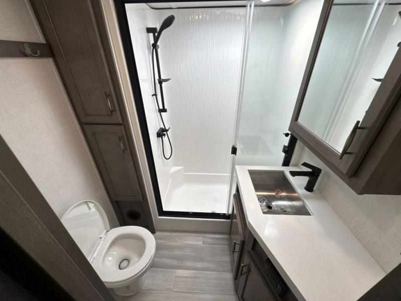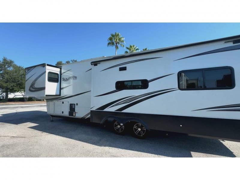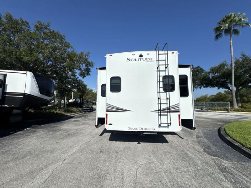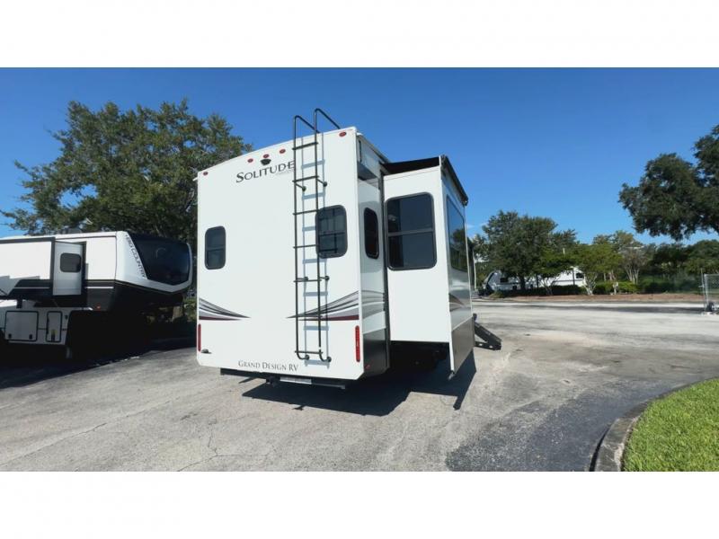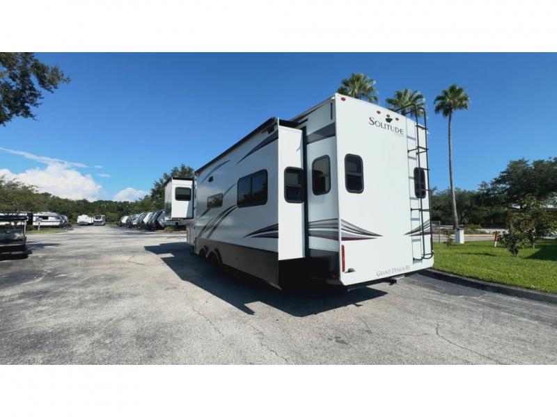 With any Solitude S-Class fifth wheel by Grand Design you will appreciate the Max Built Construction Package that features a 101" wide-body, gel coat exterior sidewalls, heavy-duty 7,000 lb. axles, plus many more durable construction materials. The self-adjusting brakes and the MORryde CRE3000 suspension system will provide a smooth towing experience, and each model includes heavy duty 17.5" H-rated tires with NitroFill. Some of the features you are sure to love are included in the Residential Living Package, like the solid surface countertops and sink covers, the hardwood cabinet doors, the night stands with USB ports, and the Rockford Fosgate stereo entertainment system with HDMI and App controls. These fifth wheels are extended-stay approved thanks to the Weather-Tek Package with a 35,000 BTU high-capacity furnace, the Stealth A/C system, and many high-end residential finishes to make you feel like you taken home with you!