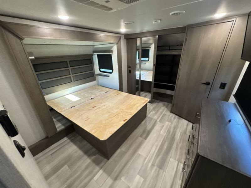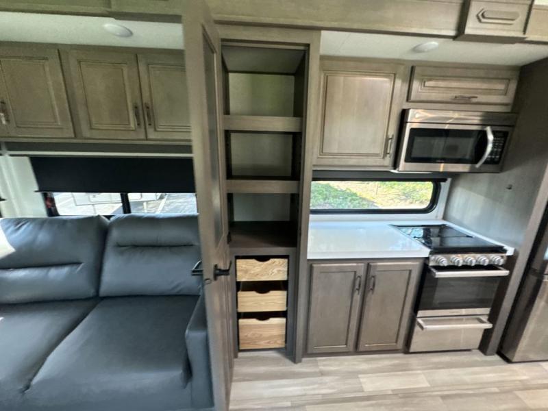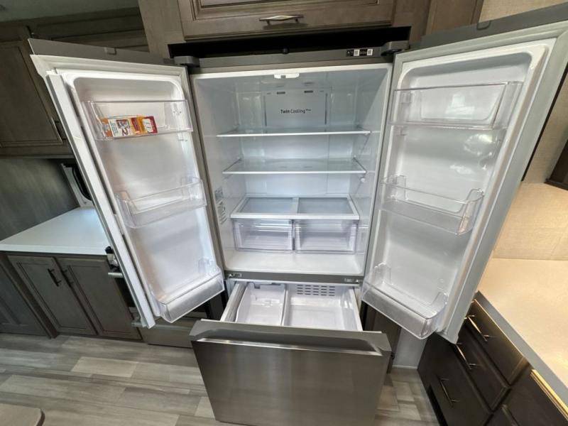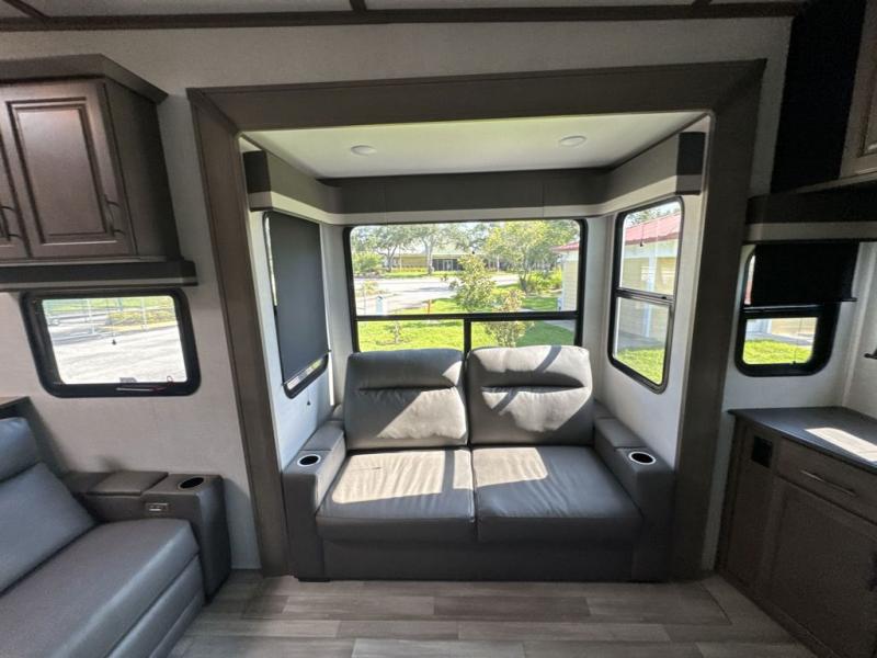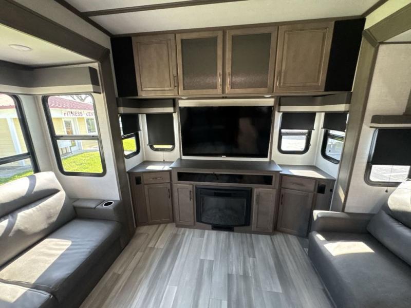 You'll feel right at home in this spacious fifth wheel with triple slides, a front master bedroom, and a kitchen island with extra counter space. The theatre seating is right across from the LED TV and fireplace, and there is a rear tri-fold sofa if you have any guests stay over. This model includes a hutch in the kitchen with cabinets above to store you nice dishes, plus there is a large pantry with washer and dryer prep if you plan to go full-time. Head to the dual entry bath that includes a linen closet and a spacious shower with a skylight, and check out the front master bedroom with its queen bed, slide out wardrobe, and 32" LED TV!