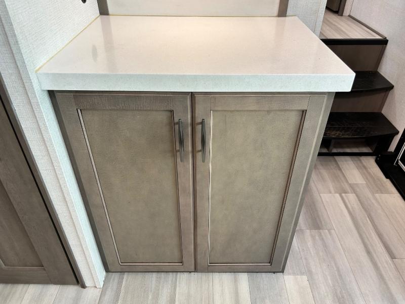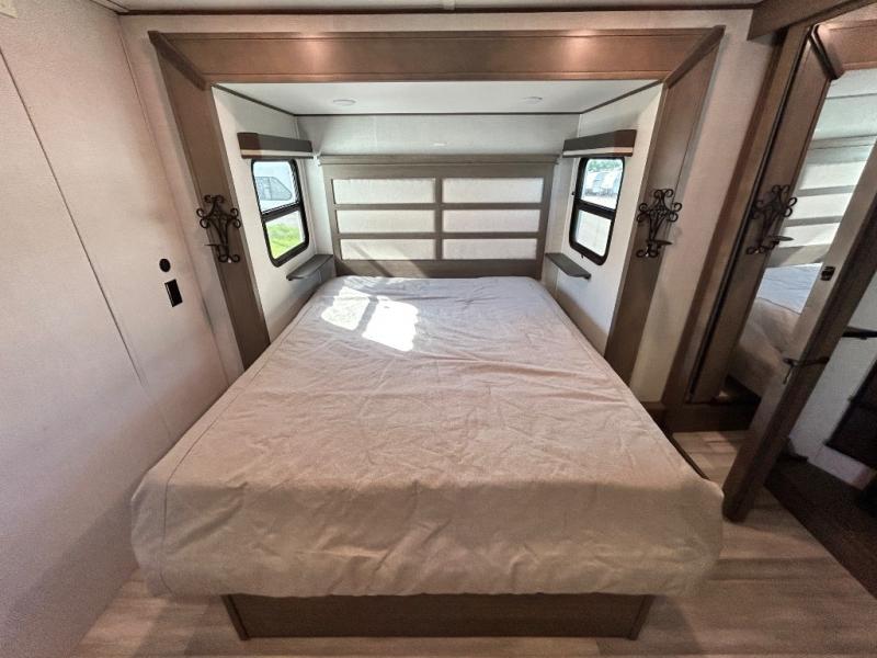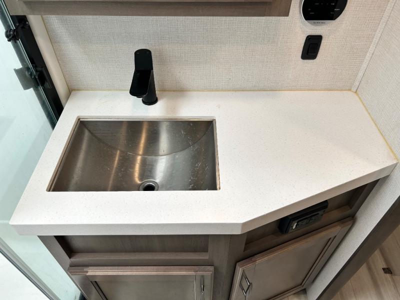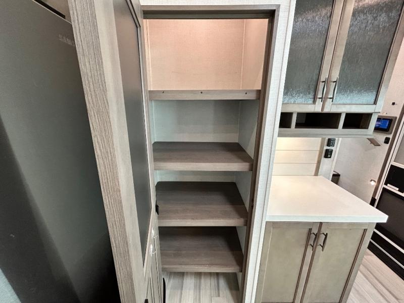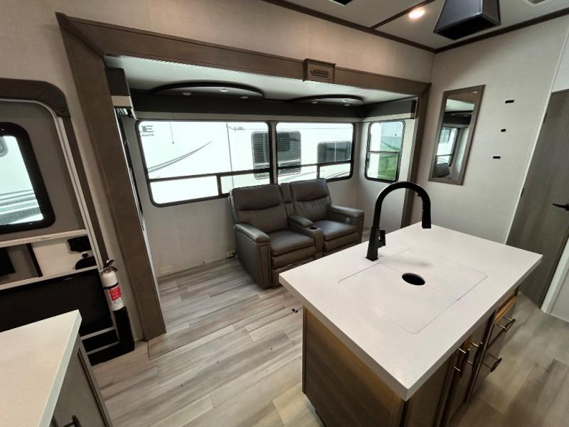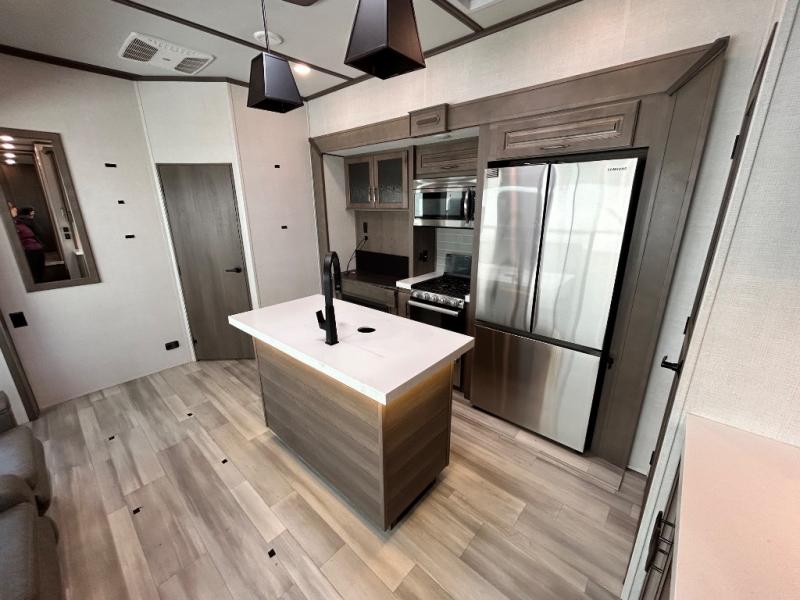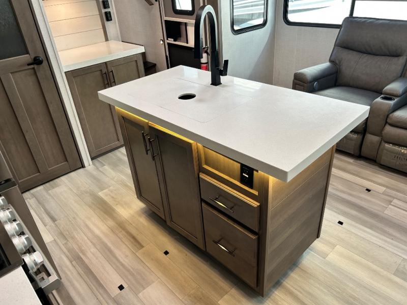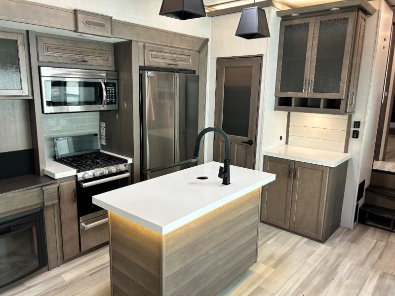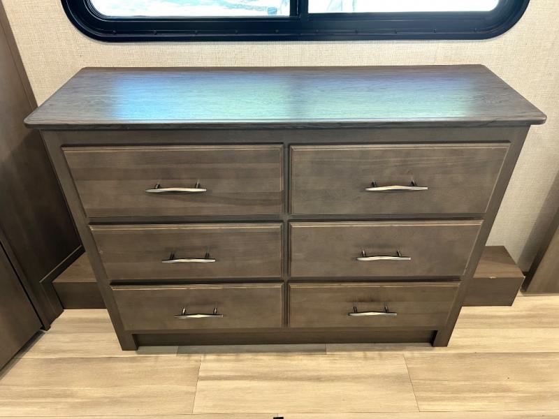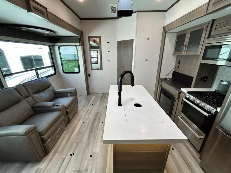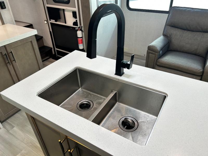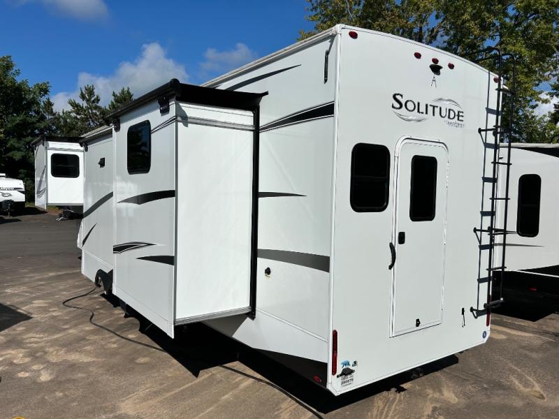 With any Solitude S-Class fifth wheel by Grand Design you will appreciate the Max Built Construction Package that features a 101" wide-body, gel coat exterior sidewalls, heavy-duty 7,000 lb. axles, plus many more durable construction materials. The self-adjusting brakes and the MORryde CRE3000 suspension system will provide a smooth towing experience, and each model includes heavy duty 17.5" H-rated tires with NitroFill. Some of the features you are sure to love are included in the Residential Living Package, like the solid surface countertops and sink covers, the hardwood cabinet doors, the night stands with USB ports, and the Rockford Fosgate stereo entertainment system with HDMI and App controls. These fifth wheels are extended-stay approved thanks to the Weather-Tek Package with a 35,000 BTU high-capacity furnace, the Stealth A/C system, and many high-end residential finishes to make you feel like you taken home with you!