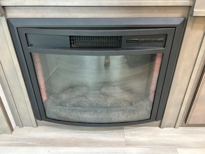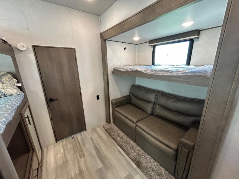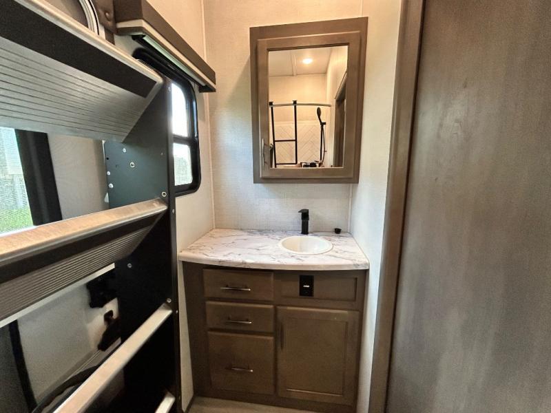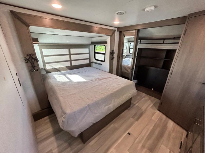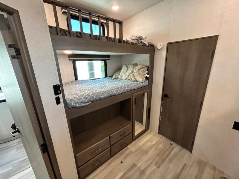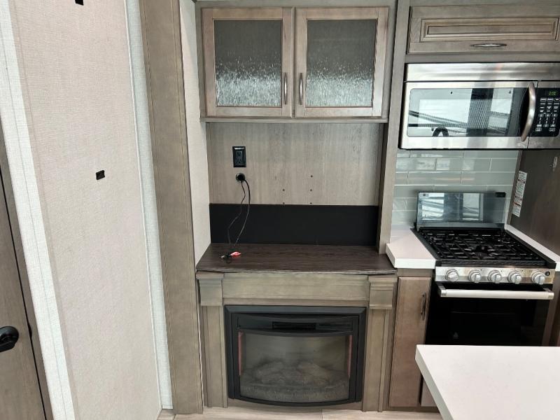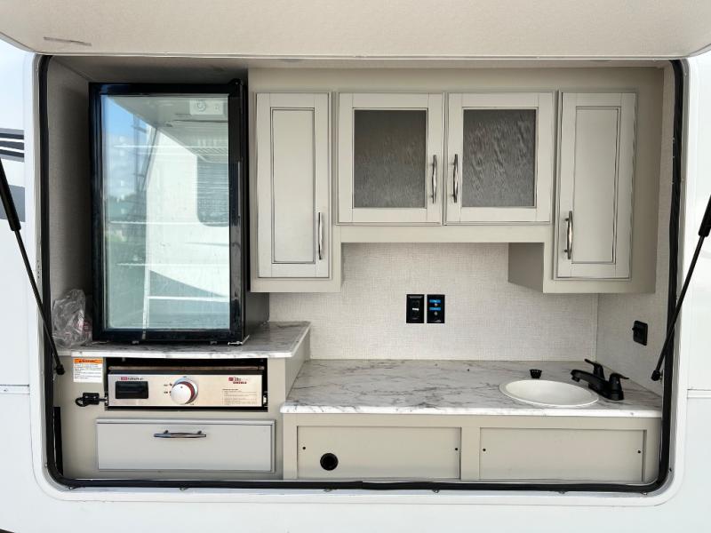 One look at this spacious fifth wheel and you'll be hooked! There are two full baths; one up front by the private bedroom, and one in the private bunkhouse. The rear bath also features a unique rear entry door for convenience. The chef of your group will love the outdoor kitchen that includes a beverage cooler, a sink, and an outdoor griddle for hot dogs and burgers. If the weather is raining on your parade, take the conversations inside to relax on the theatre seating or play a game at the free-standing dinette. There is also an LED TV here and a fireplace. This model includes plenty of storage space, including a large bedroom closet, a pantry in the kitchen, plus an exterior pass-through storage for larger camp gear!