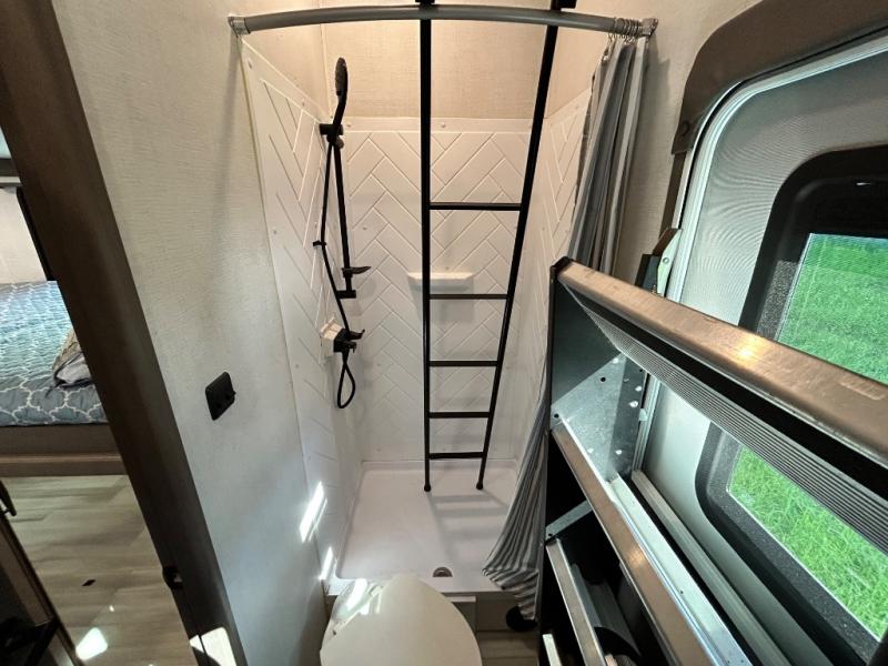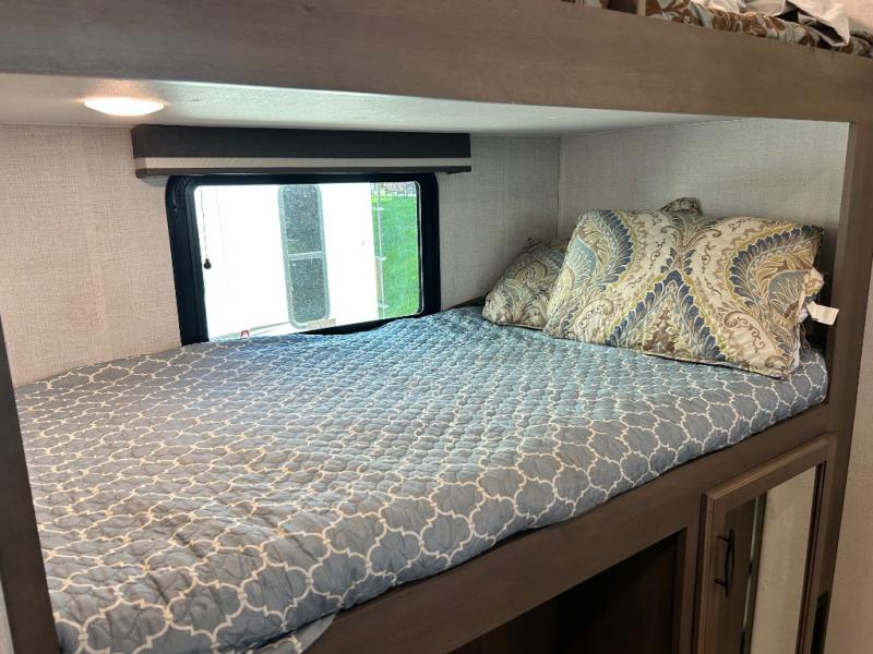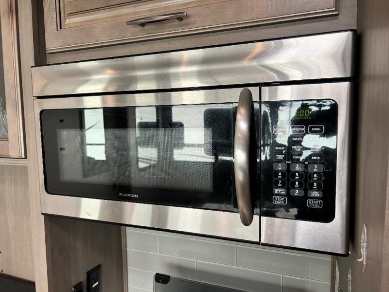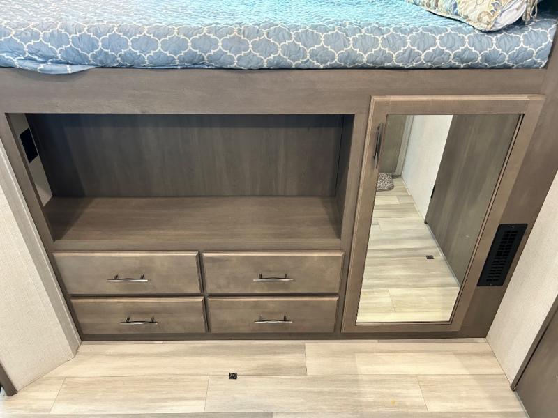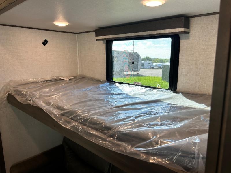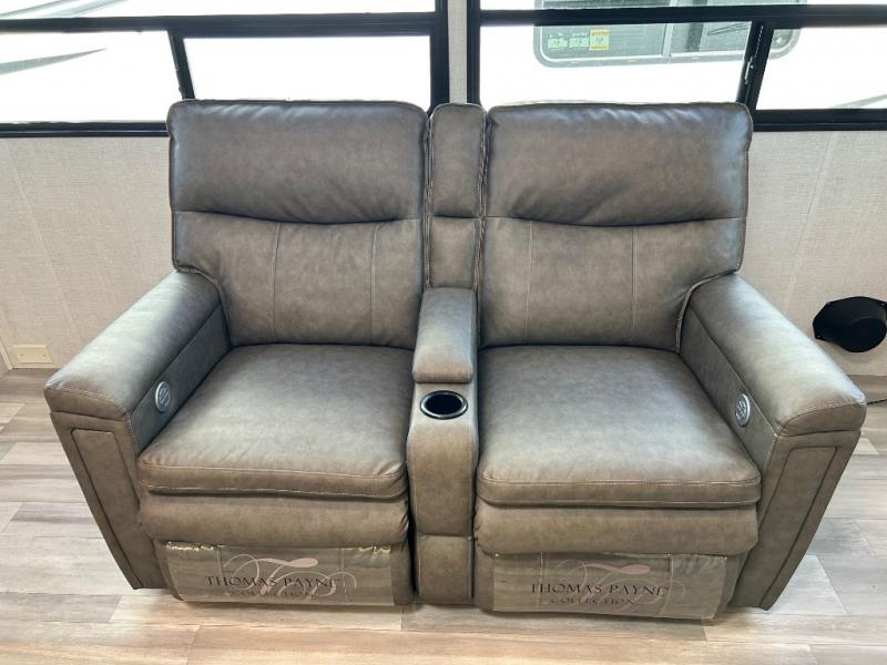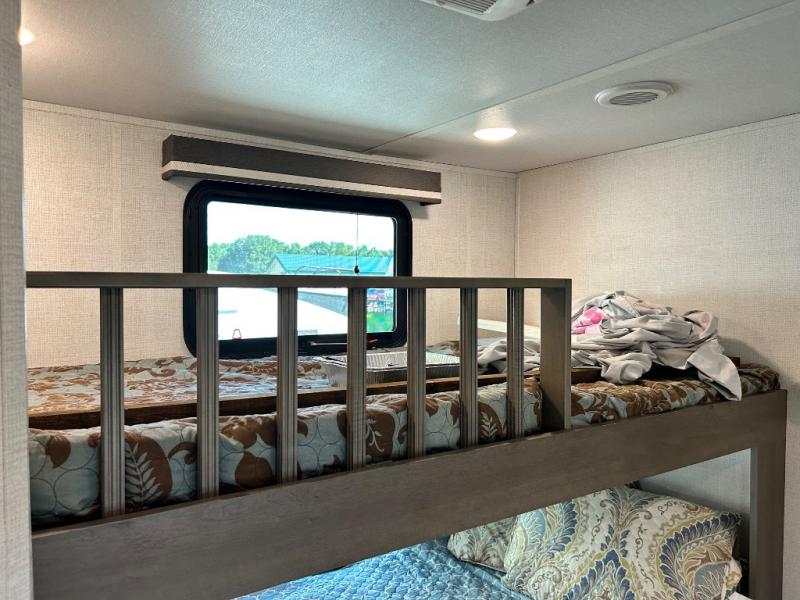 One look at this spacious fifth wheel and you'll be hooked! There are two full baths; one up front by the private bedroom, and one in the private bunkhouse. The rear bath also features a unique rear entry door for convenience. The chef of your group will love the outdoor kitchen that includes a beverage cooler, a sink, and an outdoor griddle for hot dogs and burgers. If the weather is raining on your parade, take the conversations inside to relax on the theatre seating or play a game at the free-standing dinette. There is also an LED TV here and a fireplace. This model includes plenty of storage space, including a large bedroom closet, a pantry in the kitchen, plus an exterior pass-through storage for larger camp gear!