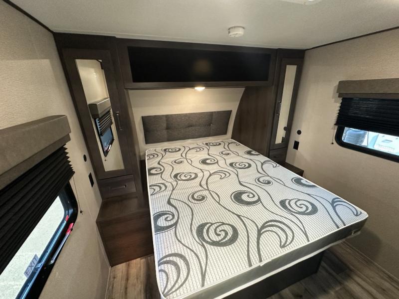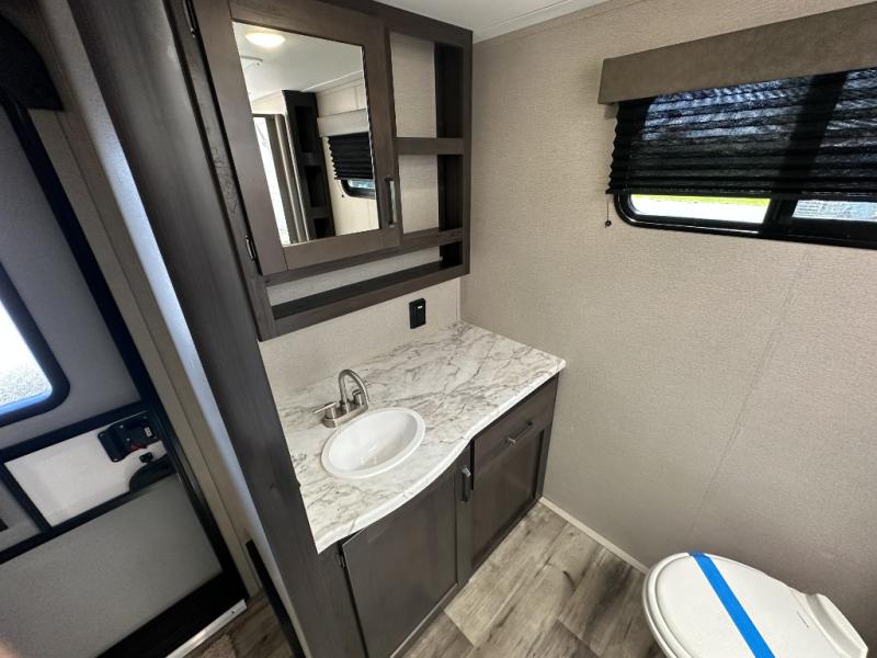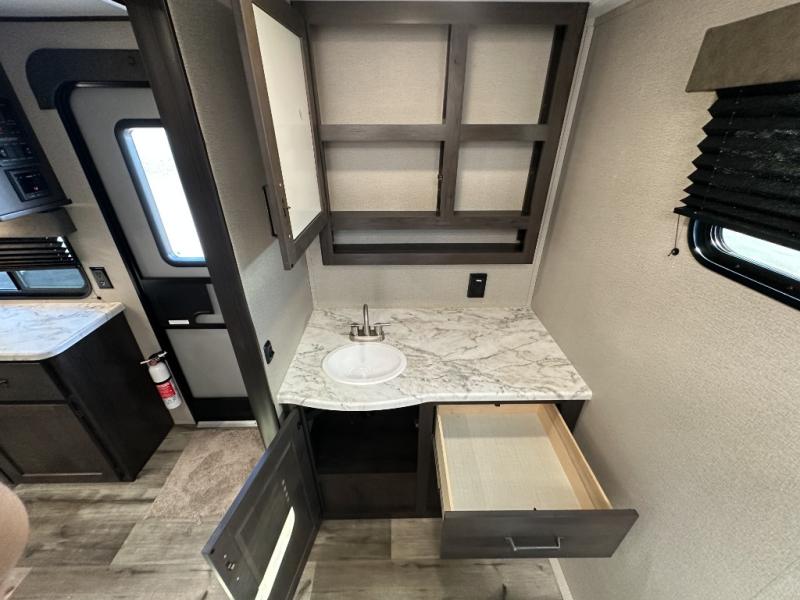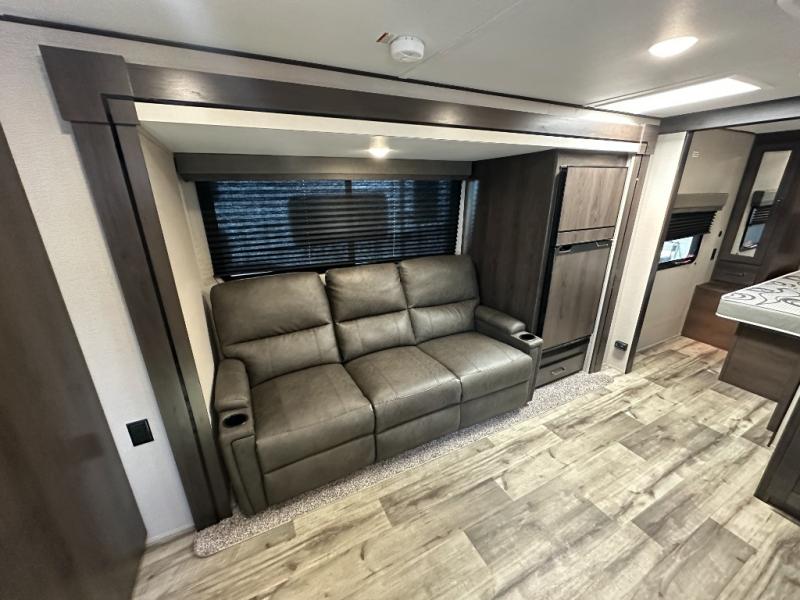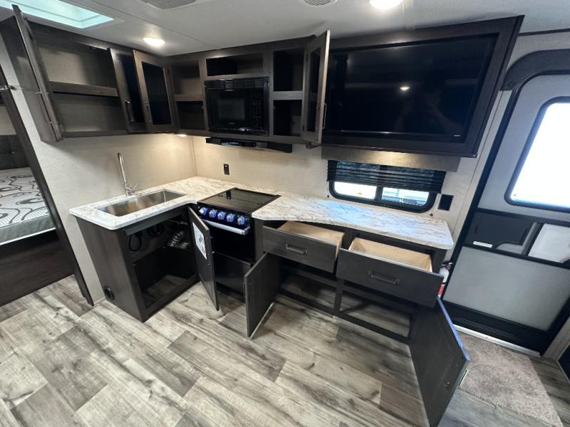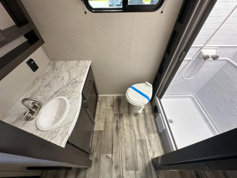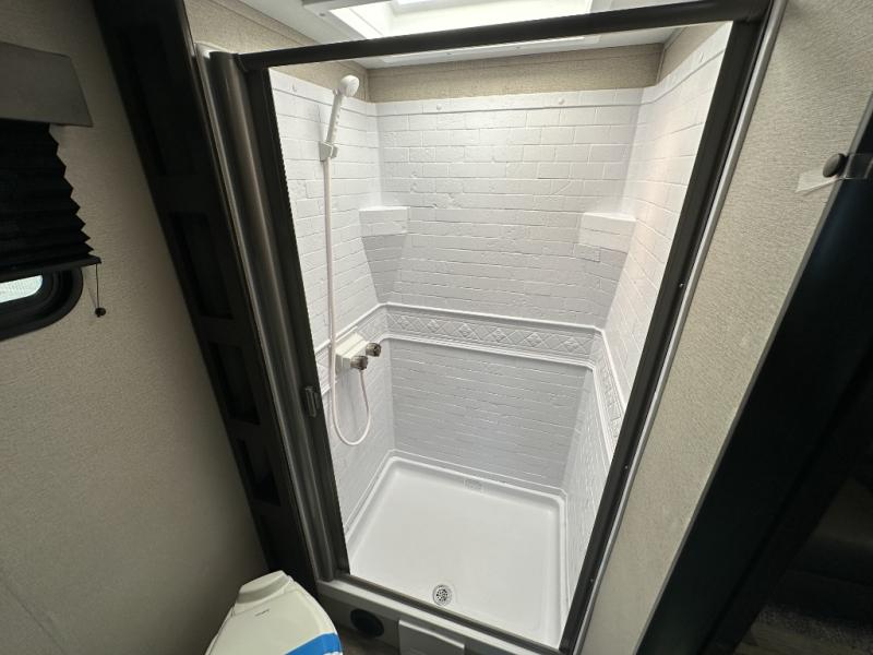 This travel trailer will feel just like home with its private bedroom that includes a queen bed, overhead storage, and TV prep if you choose to bring along your own television. The full rear bath is both spacious and tucked away for privacy, and the main living area includes a slide out for added space. Here, you'll enjoy dining around the U-shaped dinette or relaxing on the optional theater seats if you go that way. Whether you're cooking dinner in the spacious kitchen, relaxing under the 17' power awning, or cleaning up in the walk-in shower, you will always have a good time in this travel trailer!