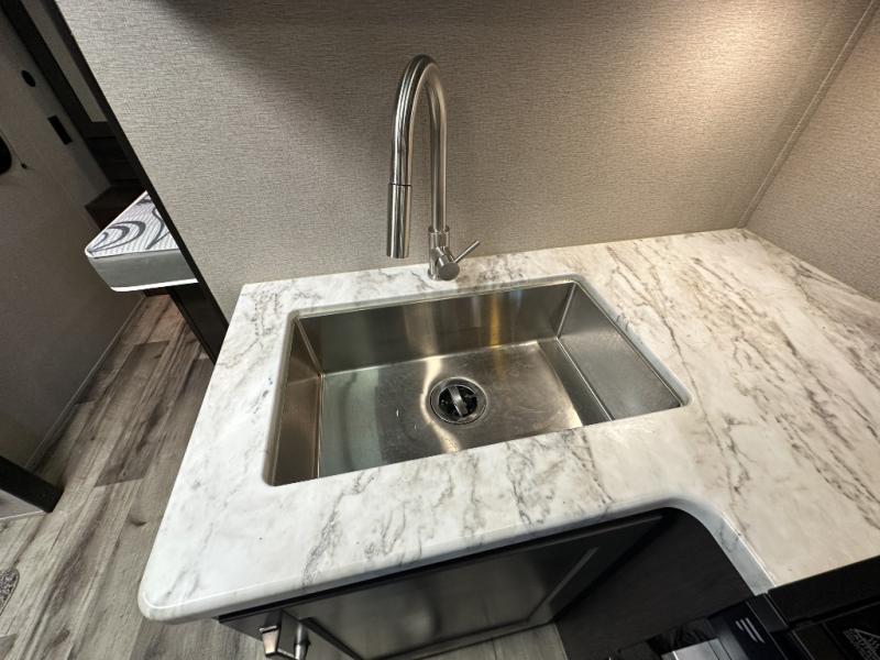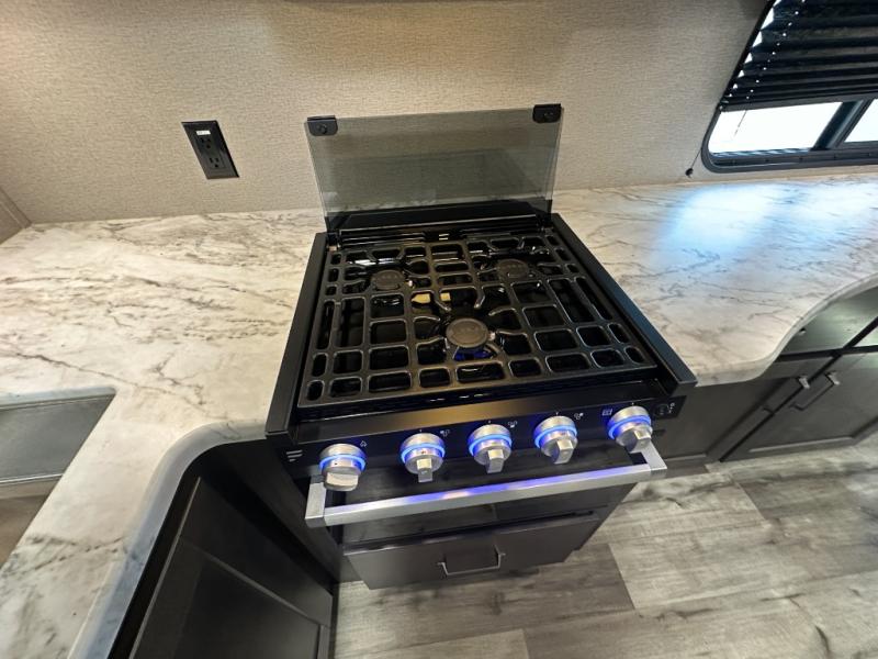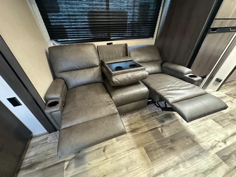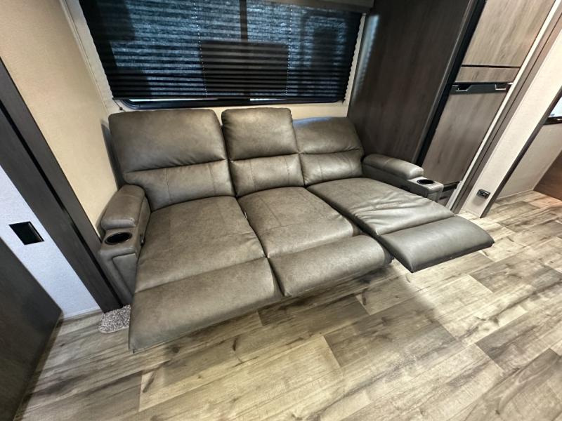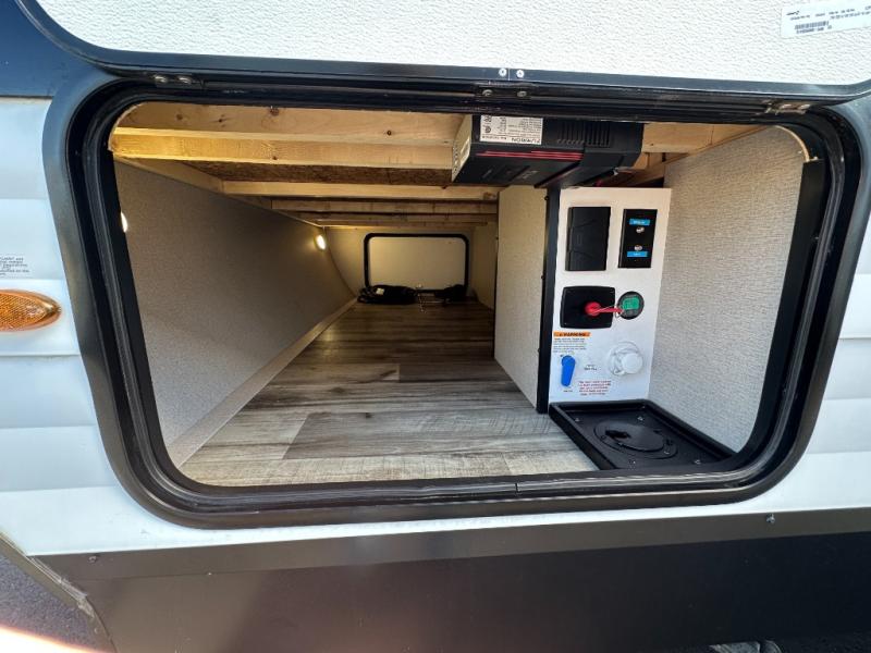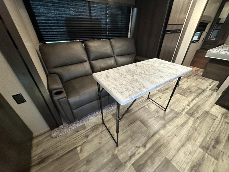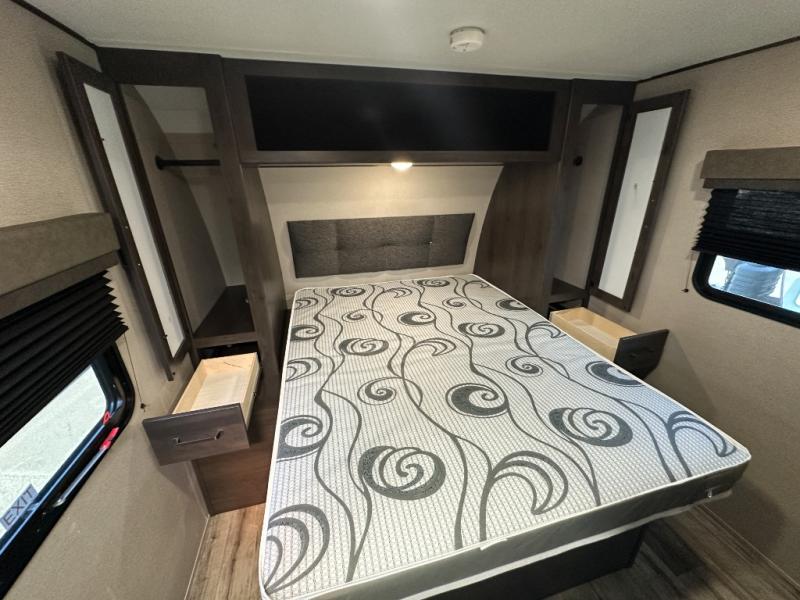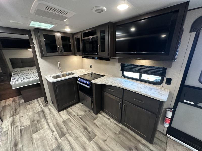 This travel trailer will feel just like home with its private bedroom that includes a queen bed, overhead storage, and TV prep if you choose to bring along your own television. The full rear bath is both spacious and tucked away for privacy, and the main living area includes a slide out for added space. Here, you'll enjoy dining around the U-shaped dinette or relaxing on the optional theater seats if you go that way. Whether you're cooking dinner in the spacious kitchen, relaxing under the 17' power awning, or cleaning up in the walk-in shower, you will always have a good time in this travel trailer!