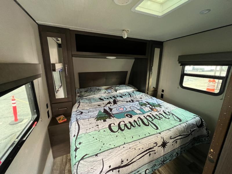 The front bedroom provides a restful retreat with a queen-sized bed and wardrobe storage to keep things organized, and additional storage is available throughout for all your gear. Outside you’ll find an electric awning that instantly creates outdoor living space and integrates seamlessly with your campsite setup. If you’re looking for a travel trailer that’s smartly designed, comfortable, and ready to roll for weekend getaways or extended trips, this 2023 Transcend Xplor 221RB is a choice worth seeing.