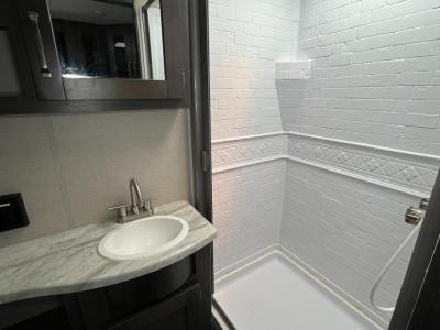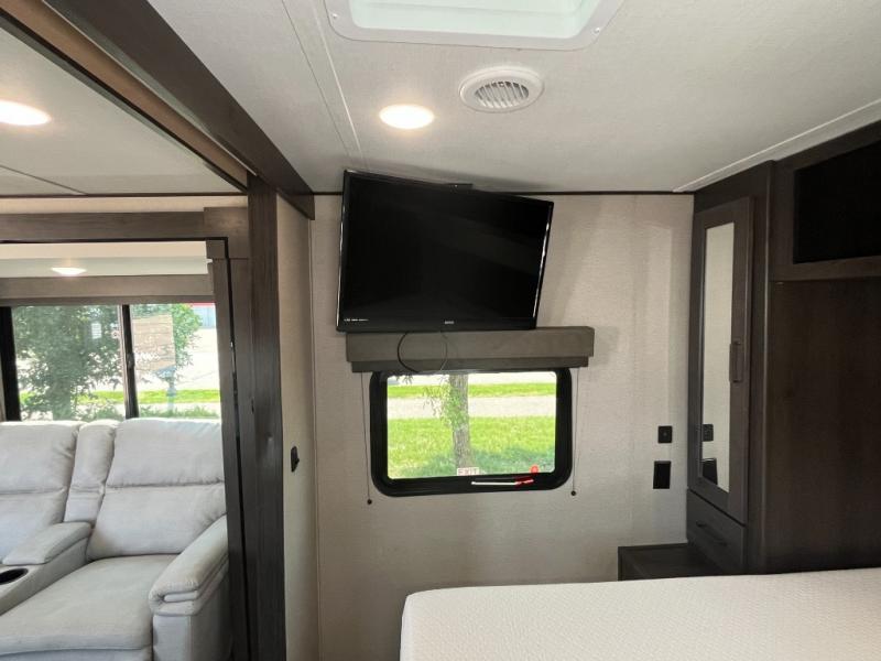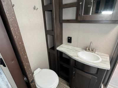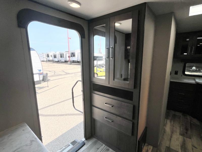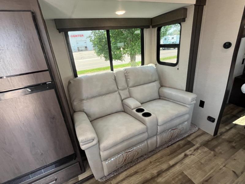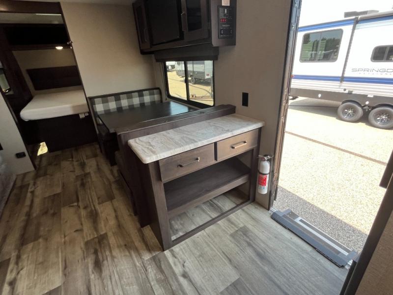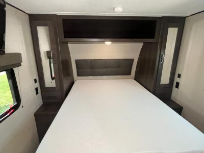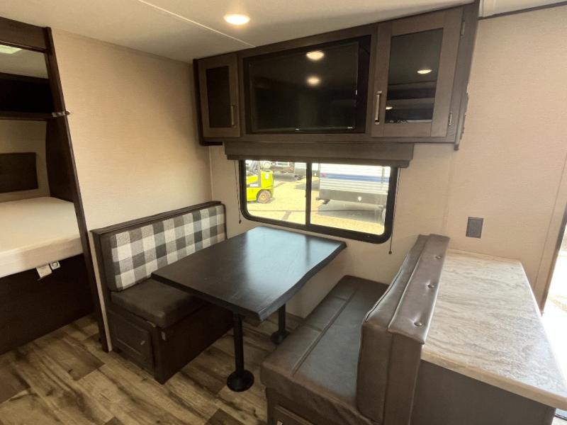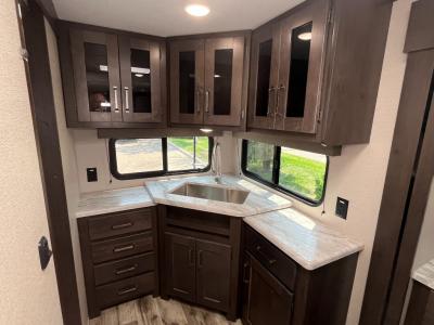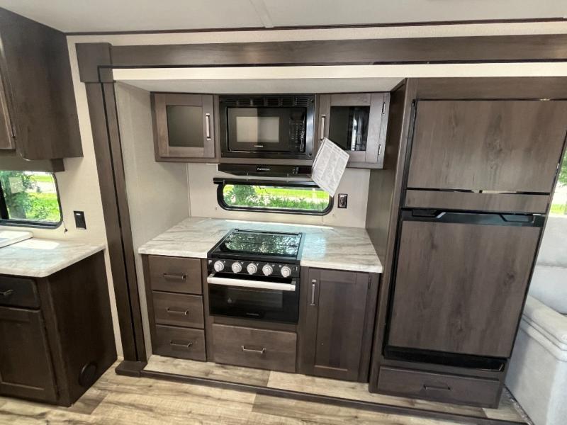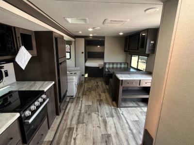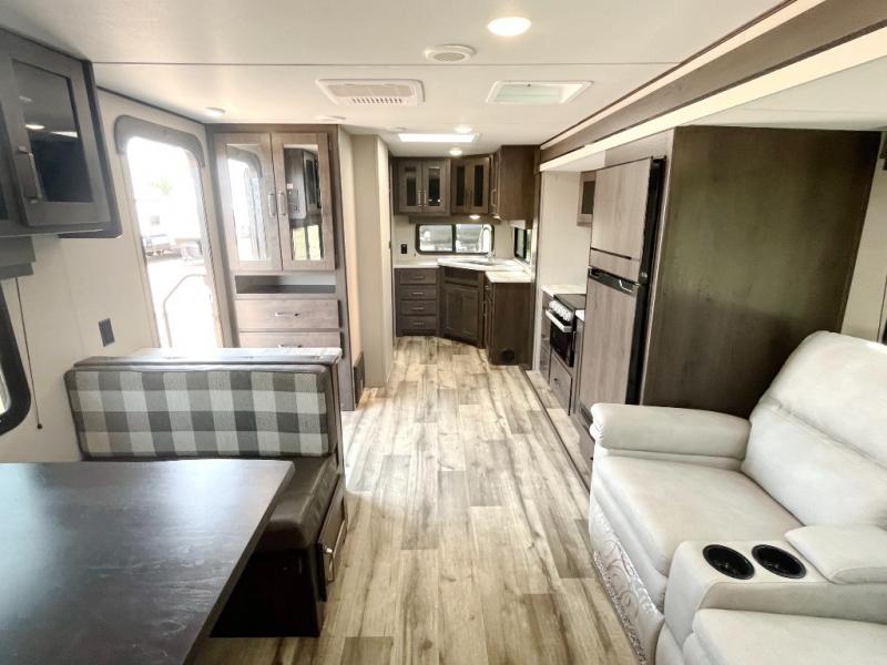 Relaxing weekends to the lake just got sweeter in this spacious travel trailer. Prepare lunch on the three-burner cooktop, and you can enjoy it at the booth dinette. There is also a 60" tri-fold sofa, or you can choose the optional theater seating in place of the sofa if you don't need the extra sleeping space. This model includes plenty of storage space, including a pantry/wardrobe just as you enter the unit, overhead compartments, and even a pet drawer for food and water!