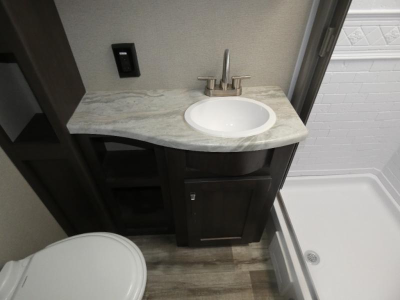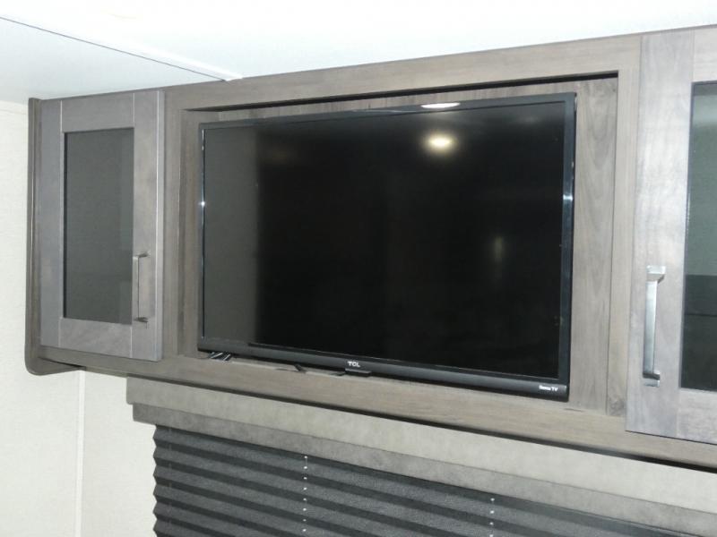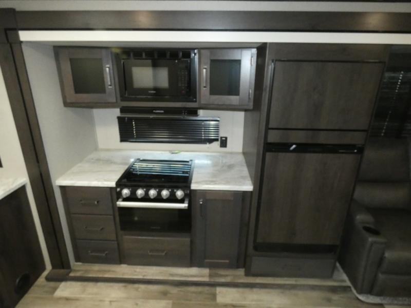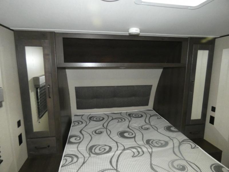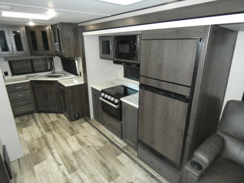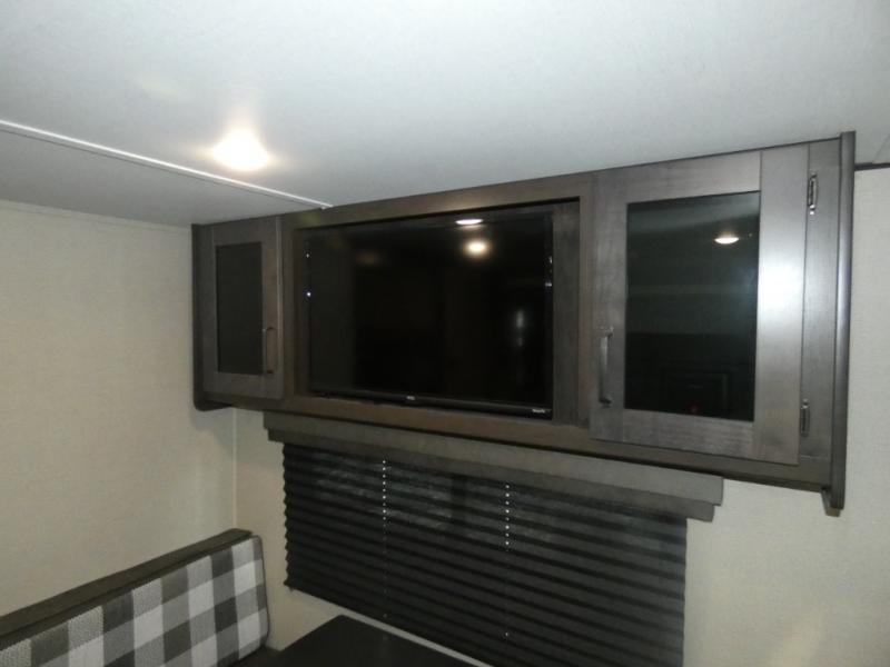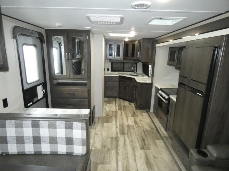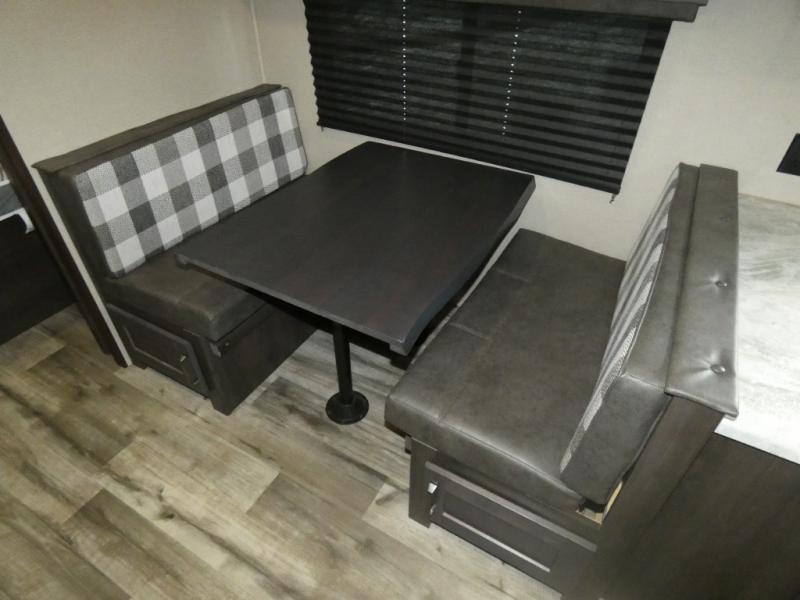 Relaxing weekends to the lake just got sweeter in this spacious travel trailer. Prepare lunch on the three-burner cooktop, and you can enjoy it at the booth dinette.This model includes plenty of storage space, including a pantry/wardrobe just as you enter the unit, overhead compartments, and even a pet drawer for food and water!