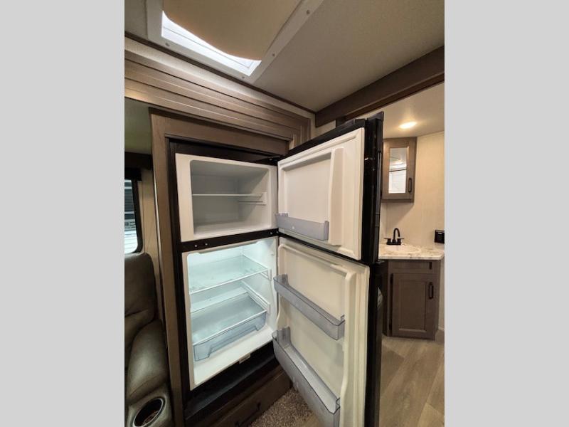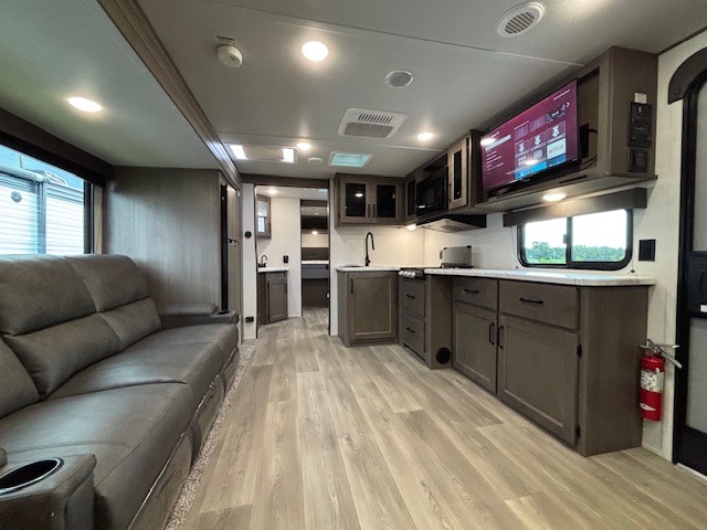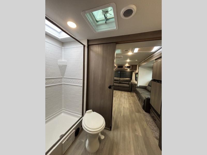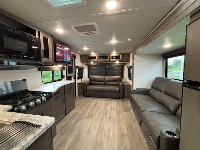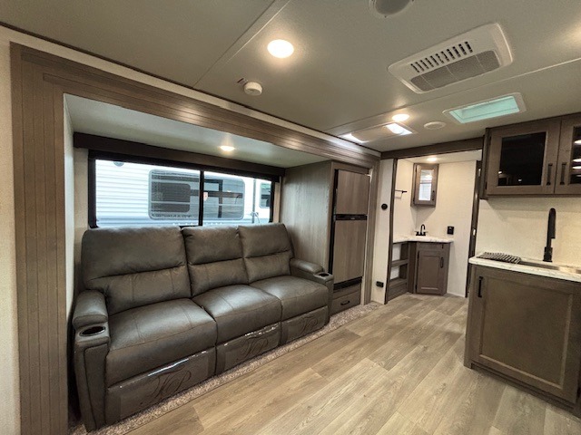 Grand design says it all for this RV. Weighs 632 and is 30 feet 8 inches long and sleeps 4 to 5. This is a used coach, but you would think it is new because it is in Like new condition. The entry door is toward the back. Enter that door and to your left is a sofa that opens into a double bed and straight ahead is three plush reclining chairs all together so three persons can recline at the same time. Across from the reclining chairs is the TV. To the left of the TV ia a full kitchen with a microwave, 3-burner stove with Oven, large frig and freezer, and a single large sink so you can wash big pots. Keep going toward the front and you enter a large bathroom with a very large shower, toilet, and small counter area. Medicine chest with mirror, and a vanity with a sink and storage underneath. Keep going toward the front and you are in the min bedroom with a Queen plush mattress, and a hanging clothes closet on each side of the bed. Outside there is a large storage area, Power Awning, Power tongue jack, power stabilizer jacks, and a spare Tire.
