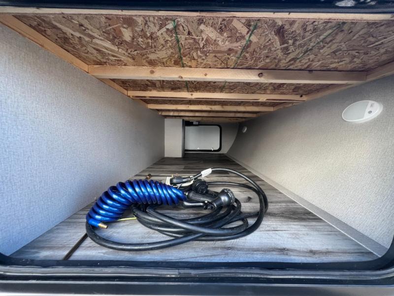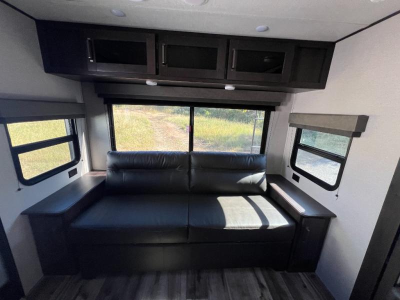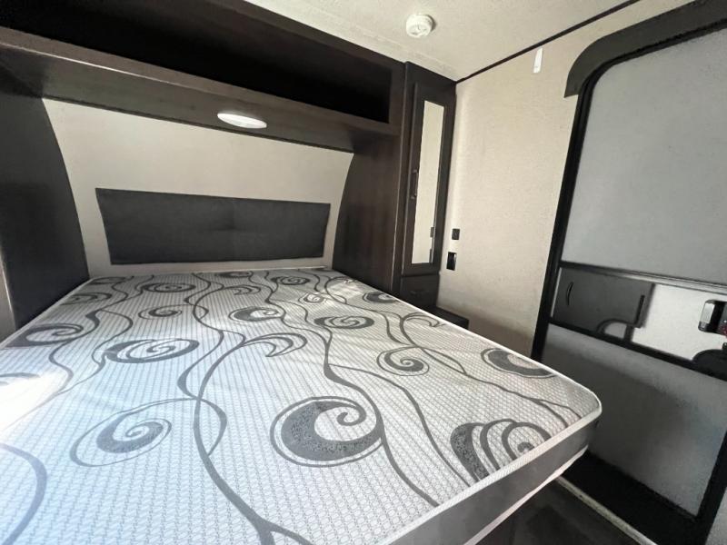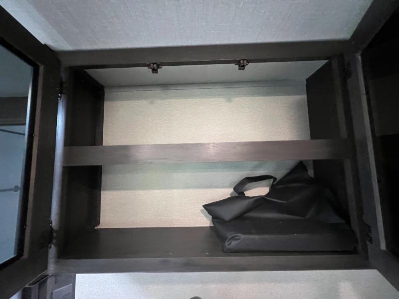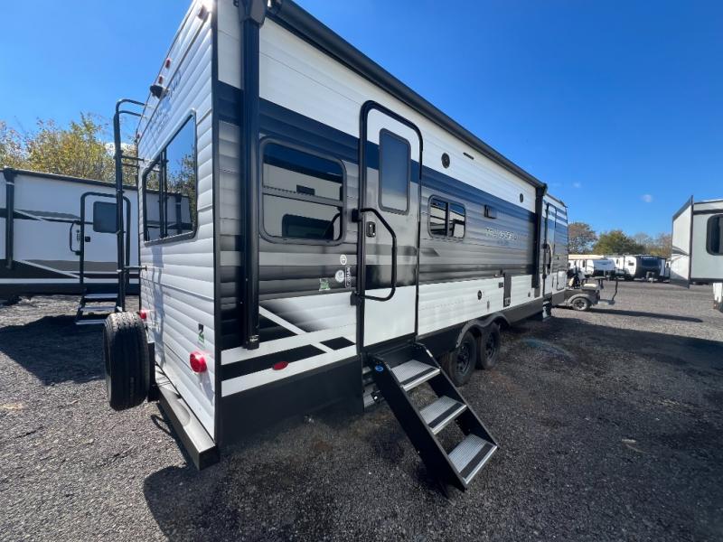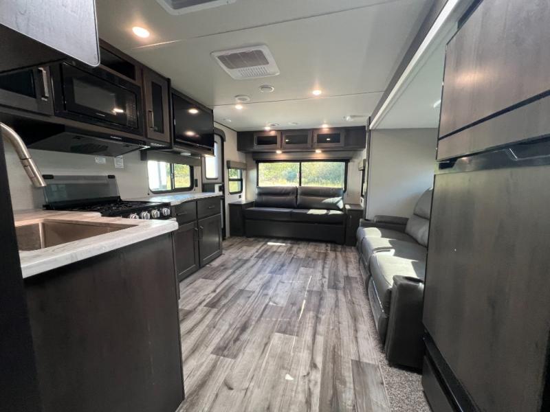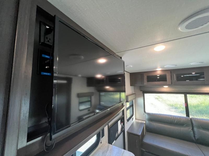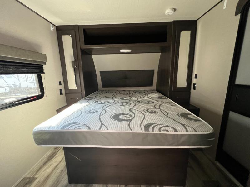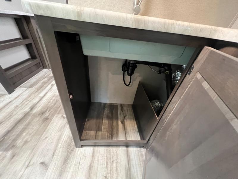 This dual-entry travel trailer will allow you to enjoy weekend getaways in complete comfort. The rear living area includes a U-shaped dinette and a tri-fold sofa that will be perfect when guests stay over. It will be so easy to fill the dog's food bowl with a convenient pet drawer under the refrigerator, and you'll find plenty of storage throughout this model for all your belongings. The walk-through bath leads to the front master bedroom where you'll find a queen bed, overhead storage, and TV prep if you choose to add your own television.