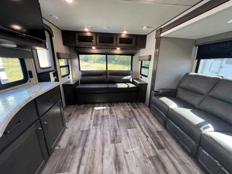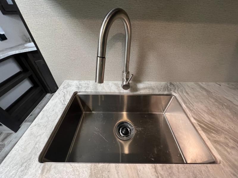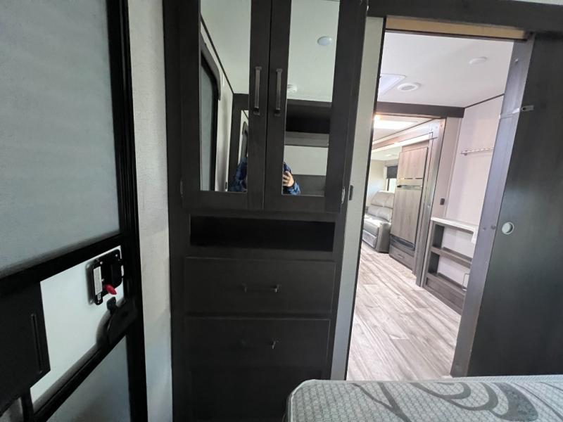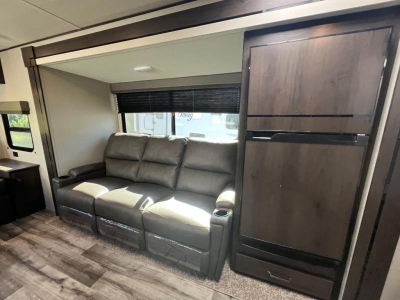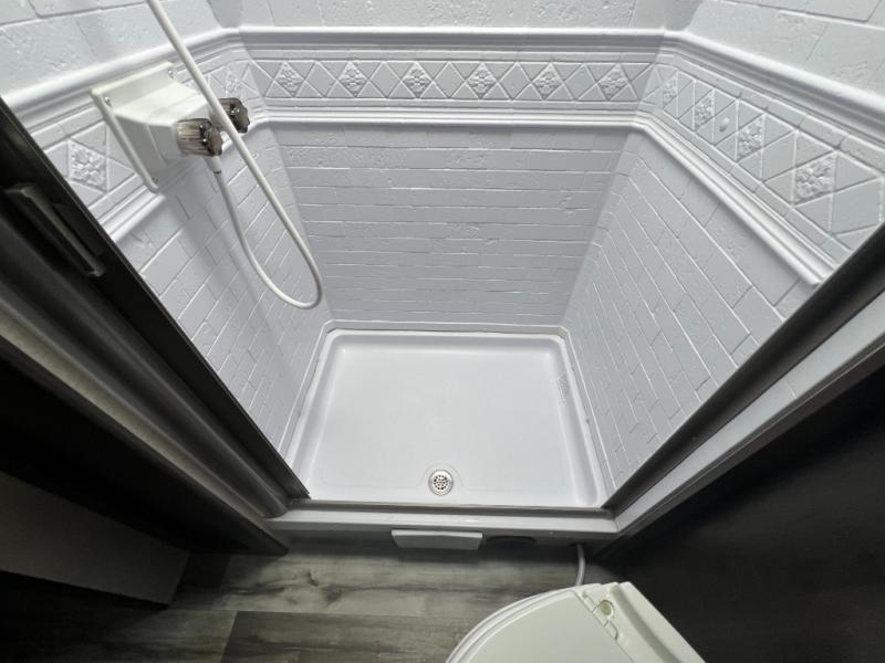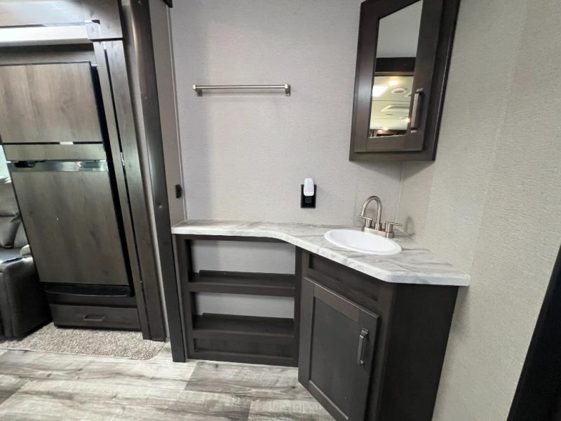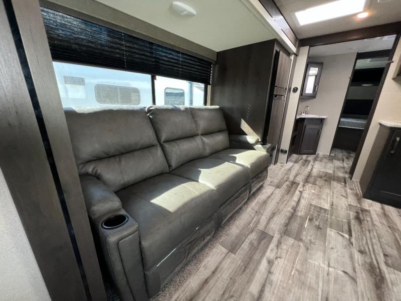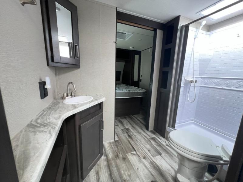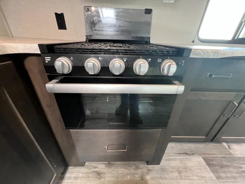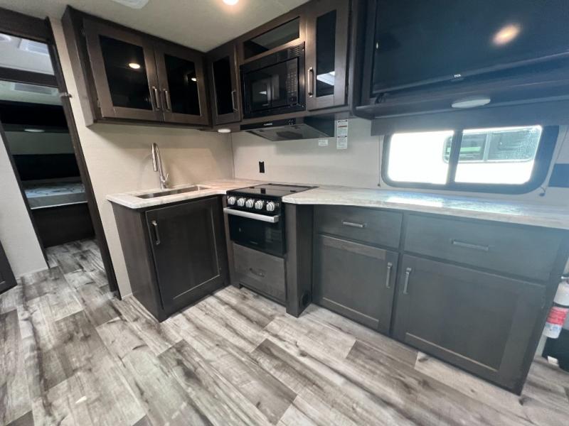 This dual-entry travel trailer will allow you to enjoy weekend getaways in complete comfort. The rear living area includes a U-shaped dinette and a tri-fold sofa that will be perfect when guests stay over. It will be so easy to fill the dog's food bowl with a convenient pet drawer under the refrigerator, and you'll find plenty of storage throughout this model for all your belongings. The walk-through bath leads to the front master bedroom where you'll find a queen bed, overhead storage, and TV prep if you choose to add your own television.