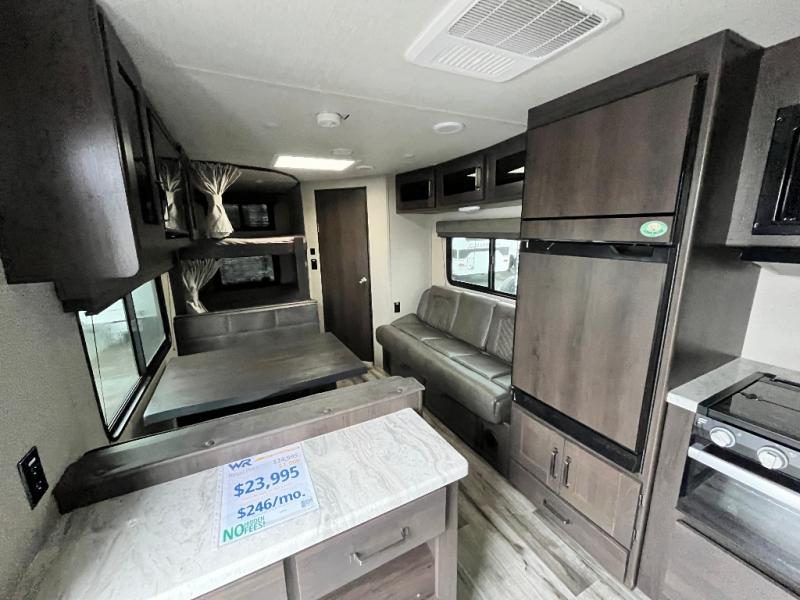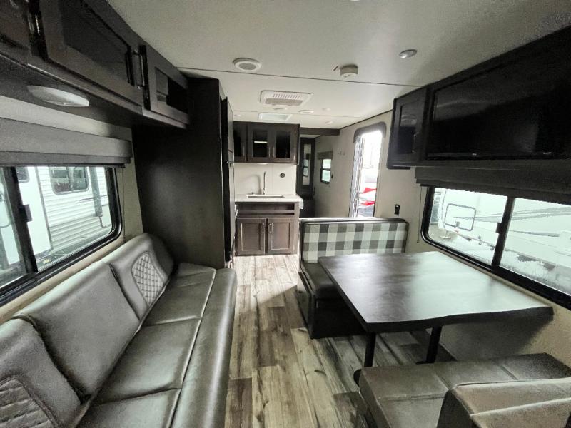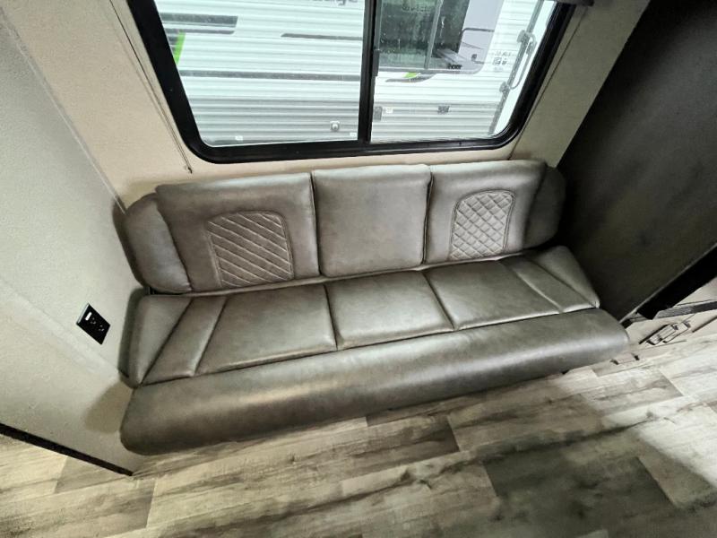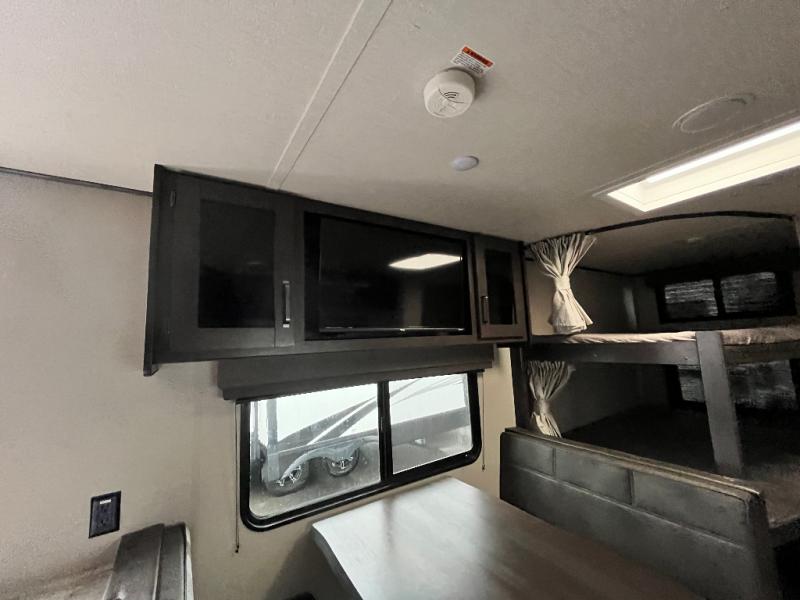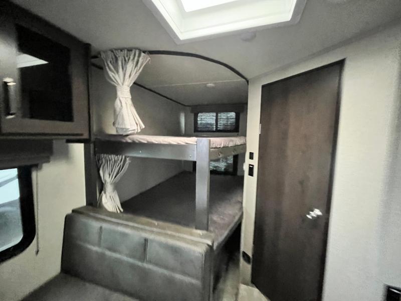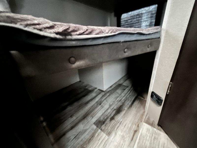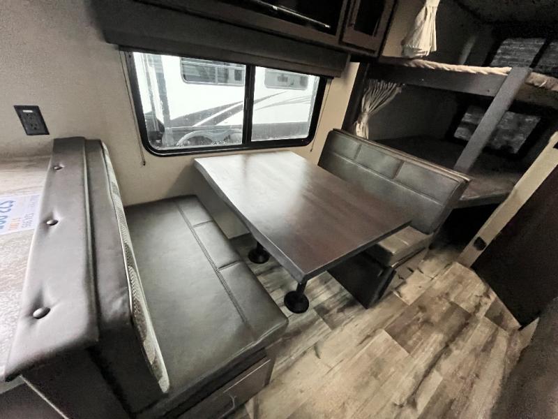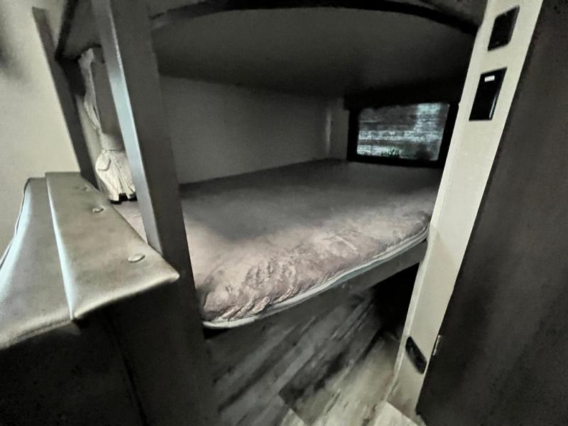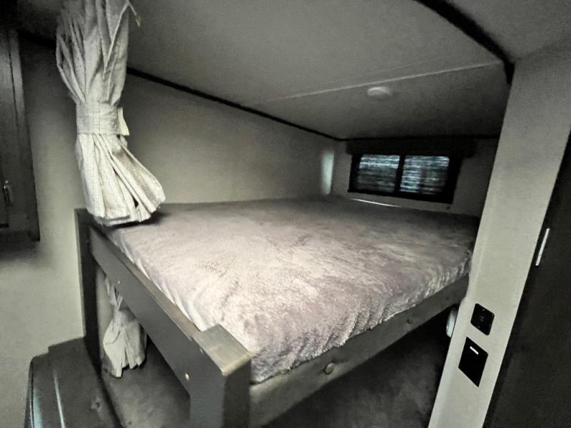 If you've been looking for a trailer with more sleeping space for your family or crew, check out this model that can sleep nine people each night! There are double-size bunks in the back next to the full bath, and the under-bed storage will be perfect for luggage and camp gear. While the chef is preparing dinner on the three-burner cooktop, everyone can visit on the booth dinette and roll-over sofa. If the weather is nice, you may just find yourselves under the 15' power awning planning out your next day's adventures. This model also includes front private bedroom with a queen bed and overhead storage for books!