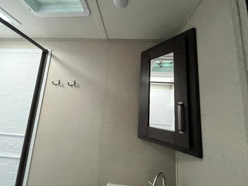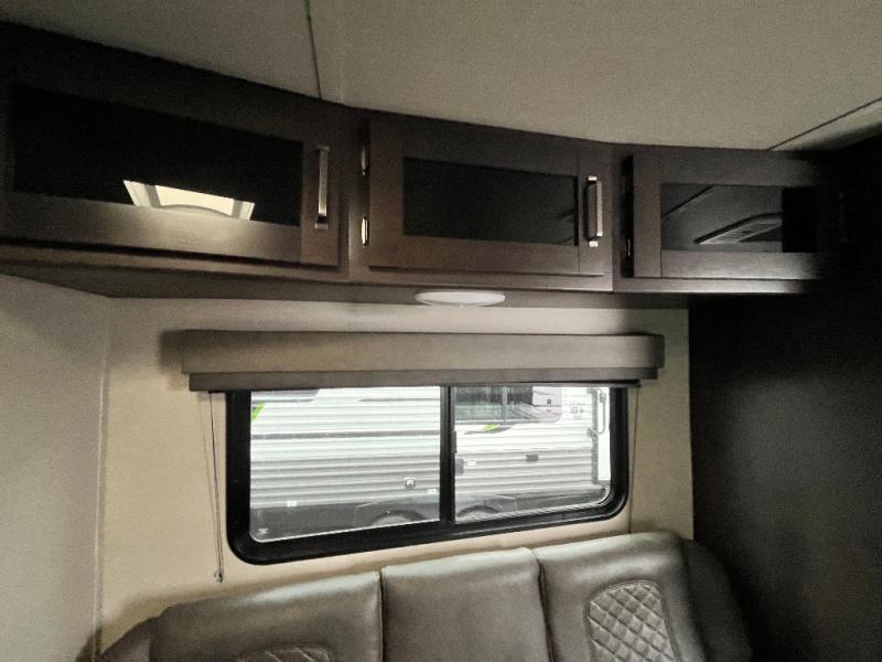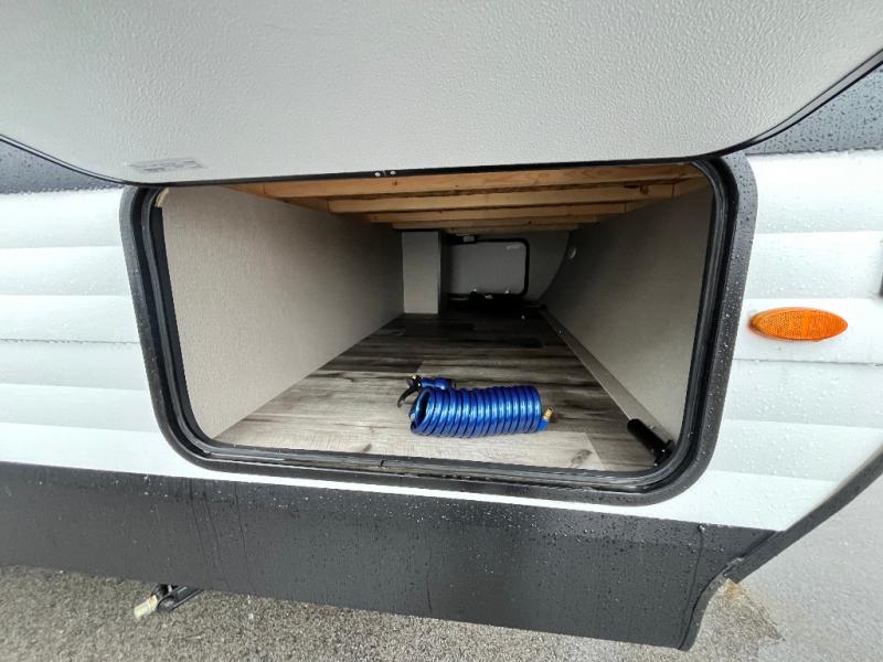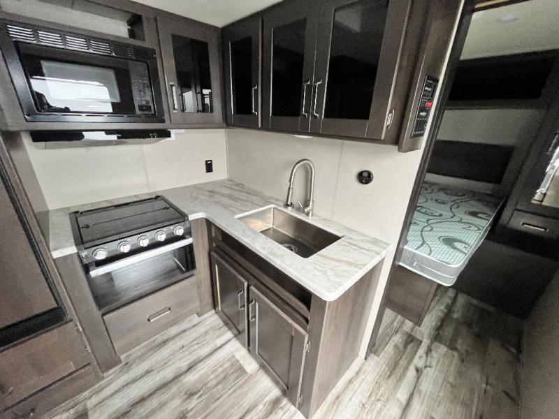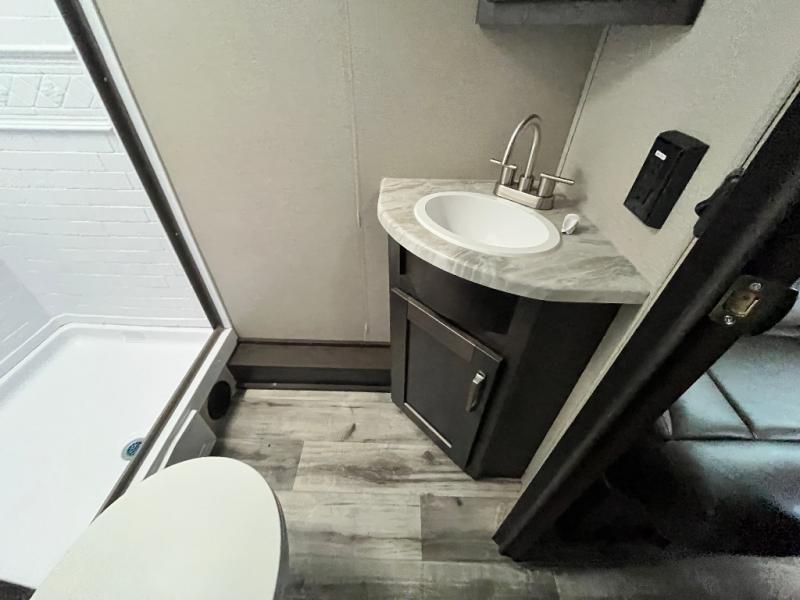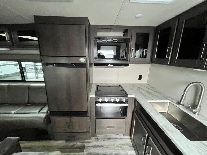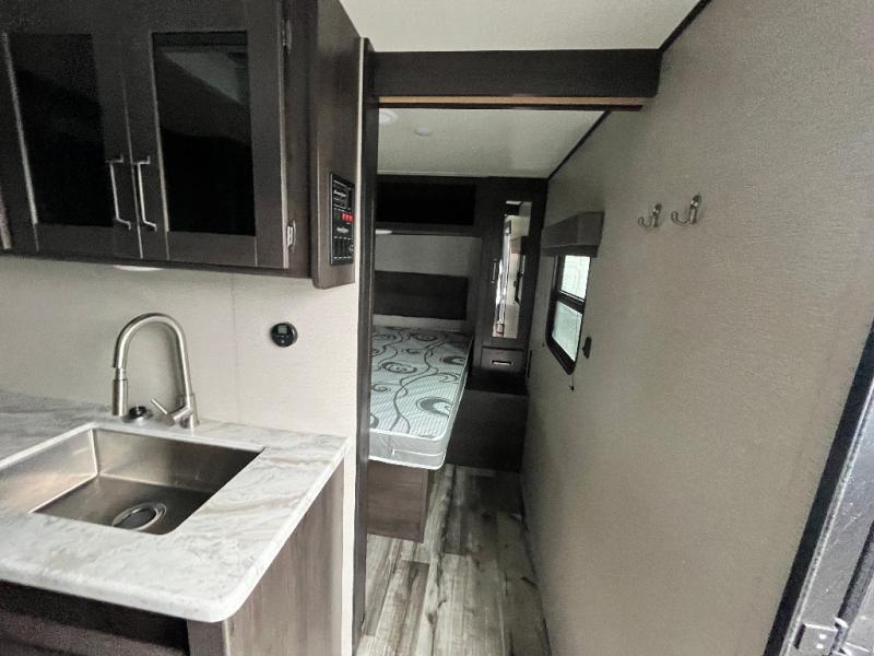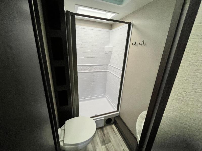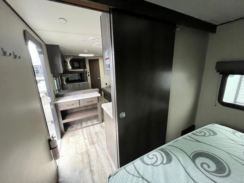 If you've been looking for a trailer with more sleeping space for your family or crew, check out this model that can sleep nine people each night! There are double-size bunks in the back next to the full bath, and the under-bed storage will be perfect for luggage and camp gear. While the chef is preparing dinner on the three-burner cooktop, everyone can visit on the booth dinette and roll-over sofa. If the weather is nice, you may just find yourselves under the 15' power awning planning out your next day's adventures. This model also includes front private bedroom with a queen bed and overhead storage for books!