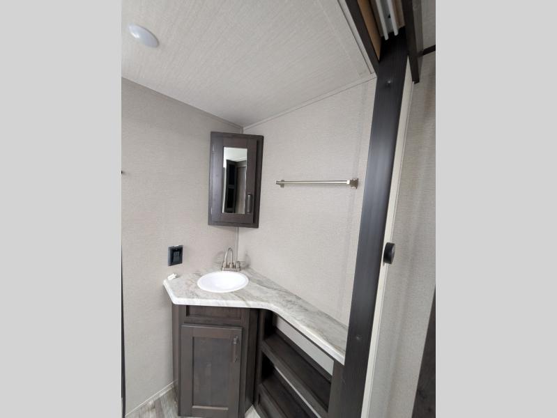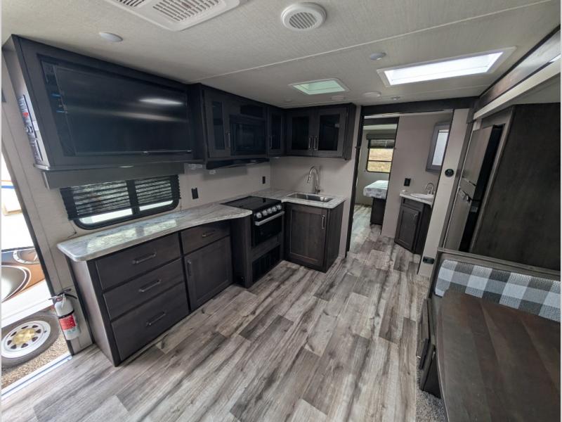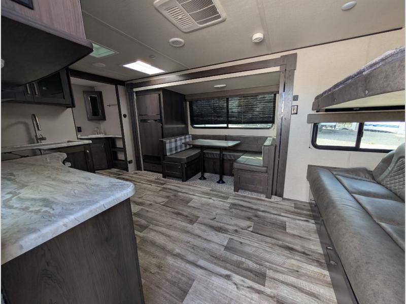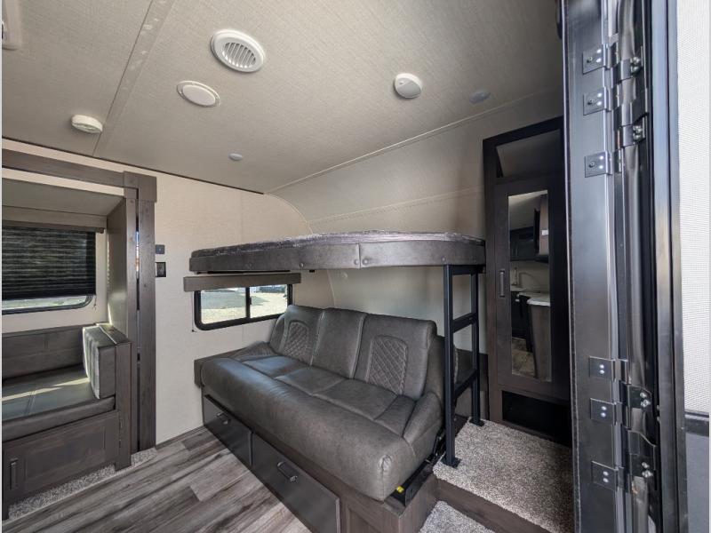 Get ready to Xplor the great outdoors in this cozy travel trailer! Once you arrive at the campground, set up the 17' power awning and enjoy a cold drink before unpacking your bags. If you get hungry, the chef of your group can prepare lunch on the three-burner cooktop, and you can enjoy it around the U-shaped dinette. You can also choose the optional theater seats in place of the dinette if you're not needing the additional dining or sleeping space. This model includes a double-size flip-up top bunk and a bottom sofa/double-size bunk for plenty of space to sit and and sleep, plus there is a rear master suite with a slide-out queen bed for you. The walk-through bath is convenient for everyone, and you'll enjoy a walk-in shower here plus a linen closet to store clean towels.