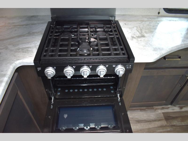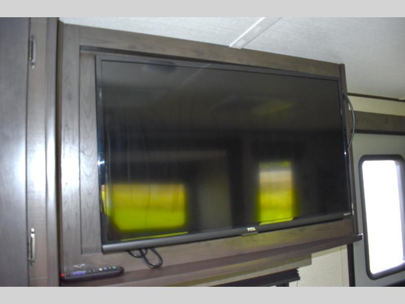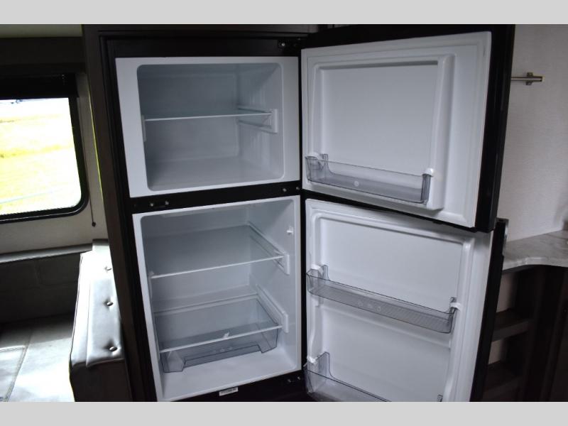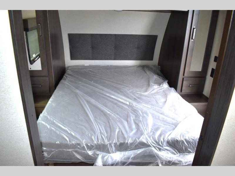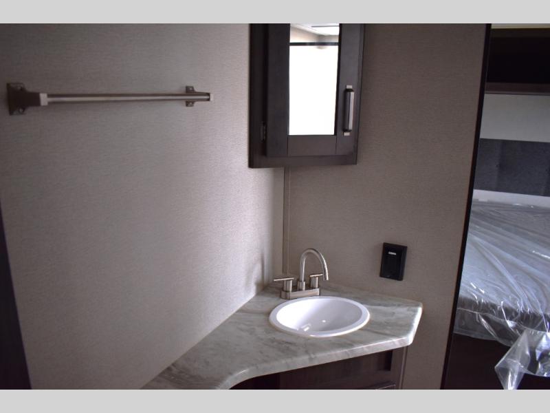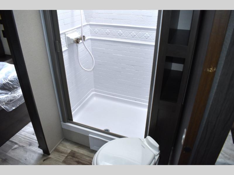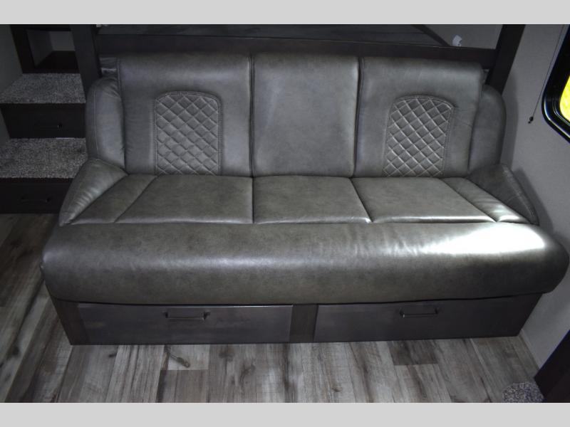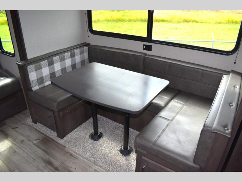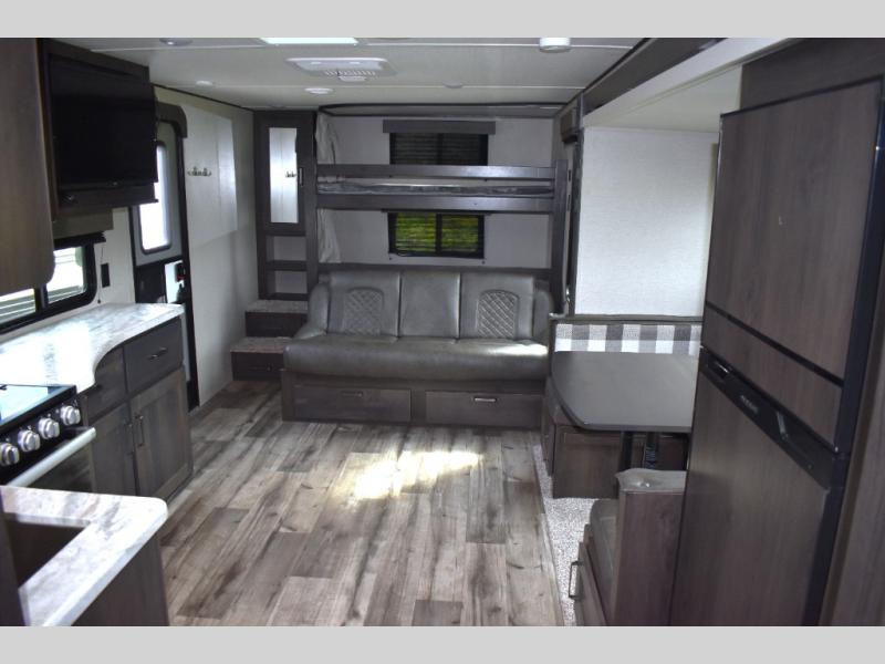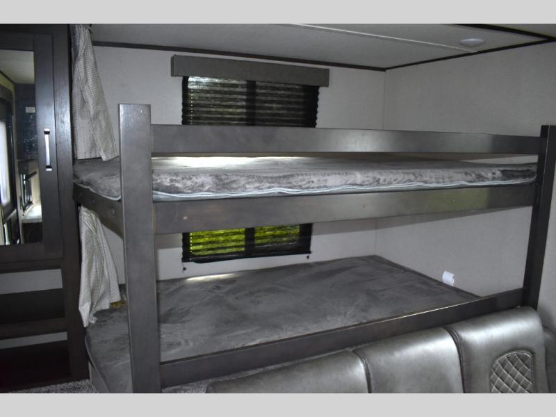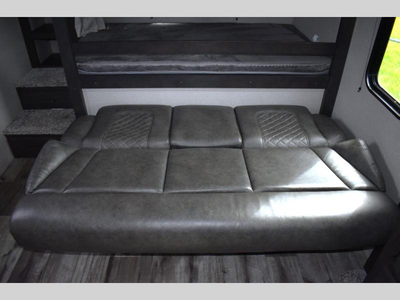 Are you ready to camp in comfort with your family or friends? This travel trailer allows you to do just that! There are double-size bunks in the back with step storage for books or board games. There is also a closet here to keep clothes wrinkle-free. The U-shaped dinette within the slide out can be switched out for the optional theatre seats, and the jackknife sofa will be the perfect spot to visit with your crew. This model features a walk-through bath that leads to the front master bedroom. You'll love the queen bed here, overhead storage, and your own exterior entry door for convenience.