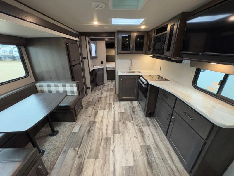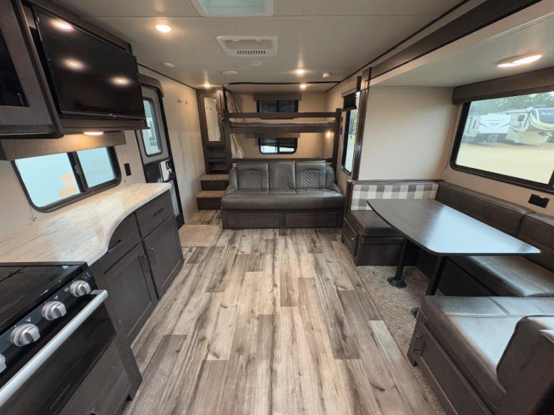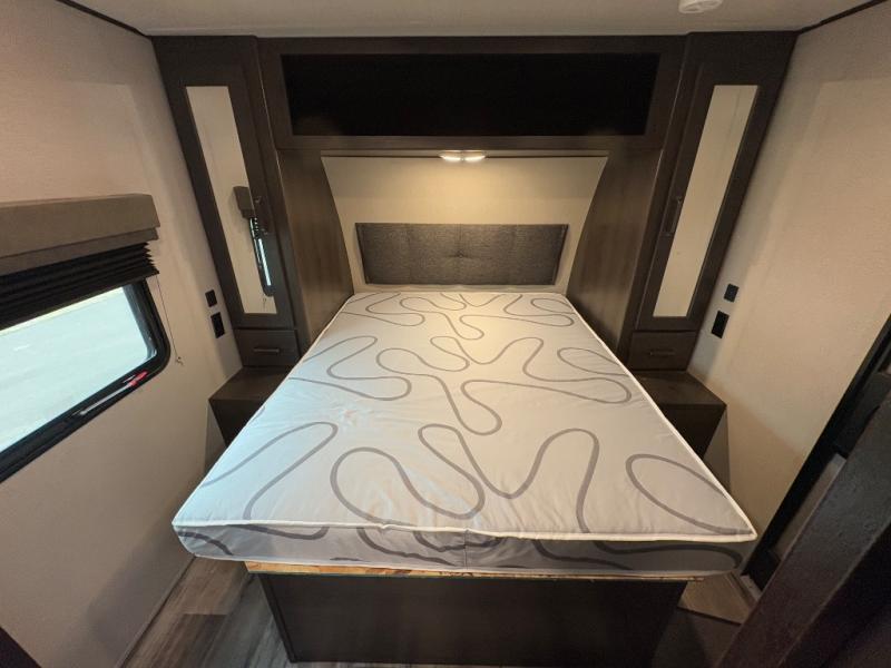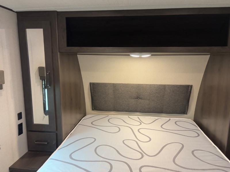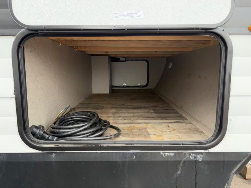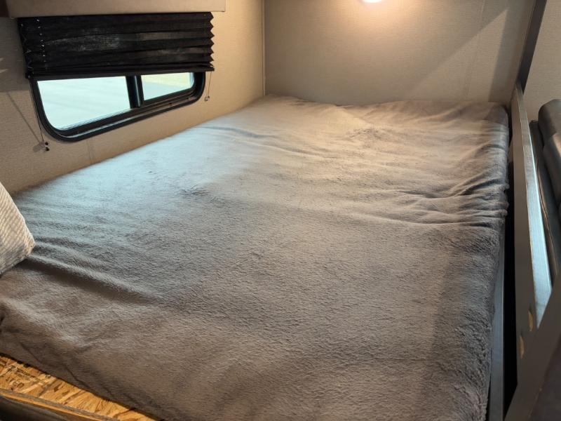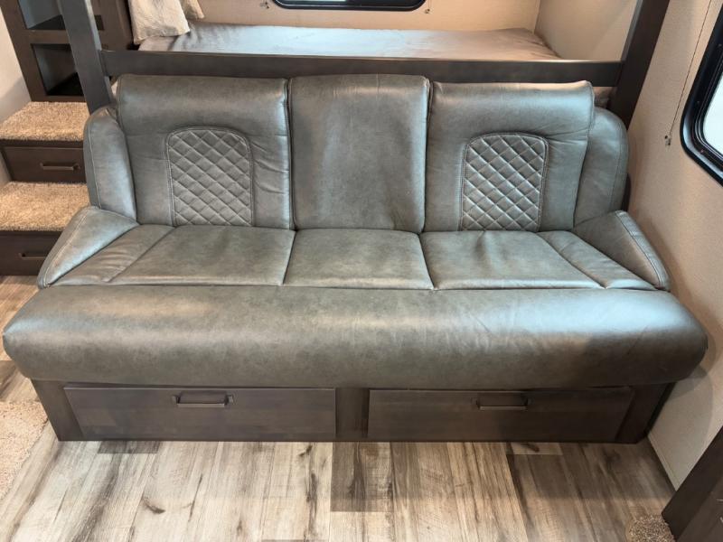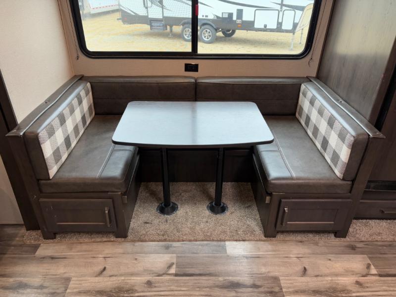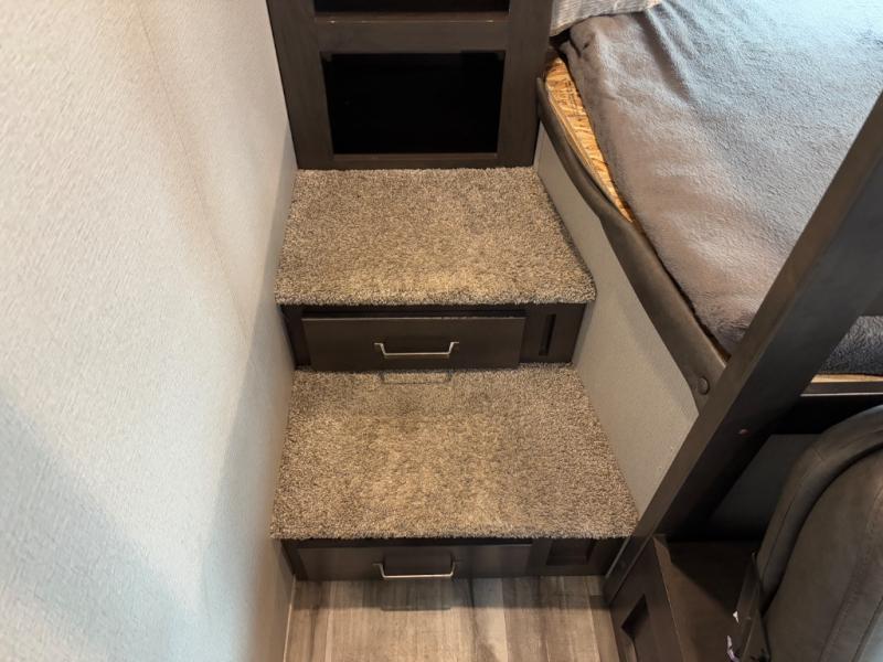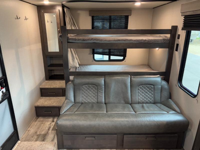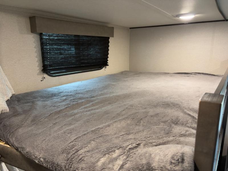 Are you ready to camp in comfort with your family or friends? This travel trailer allows you to do just that! There are double-size bunks in the back with step storage for books or board games. There is also a closet here to keep clothes wrinkle-free. The U-shaped dinette within the slide out can be switched out for the optional theatre seats, and the jackknife sofa will be the perfect spot to visit with your crew. This model features a walk-through bath that leads to the front master bedroom. You'll love the queen bed here, overhead storage, and your own exterior entry door for convenience.