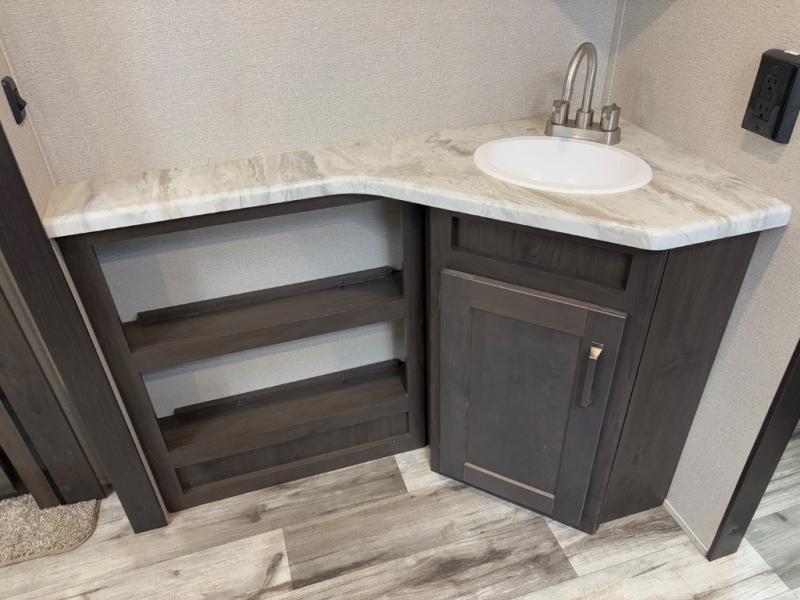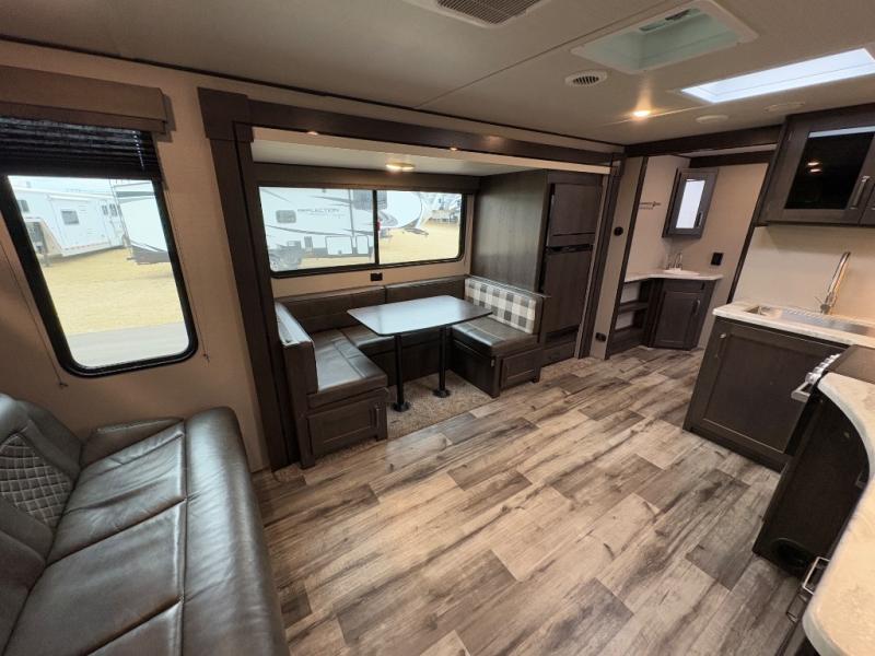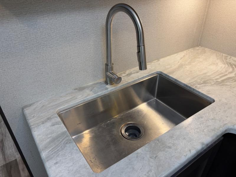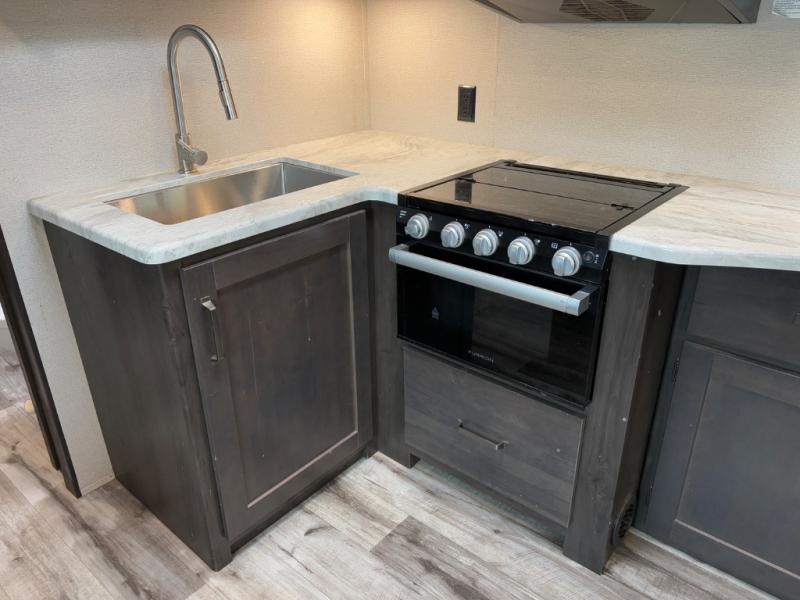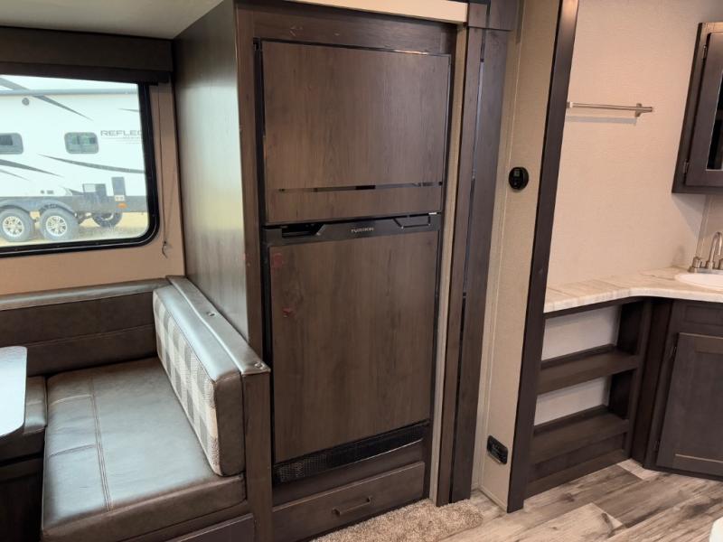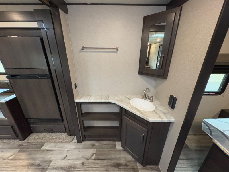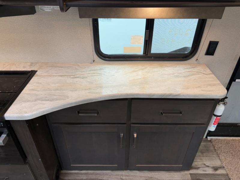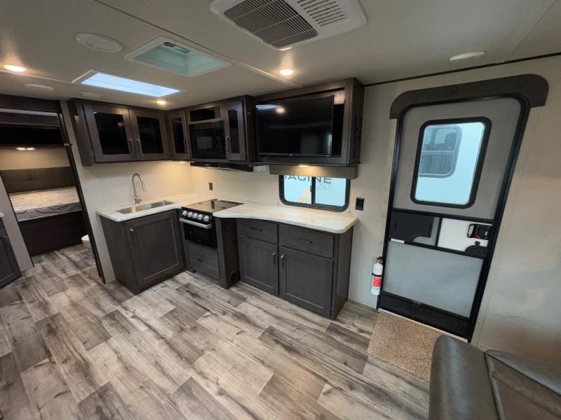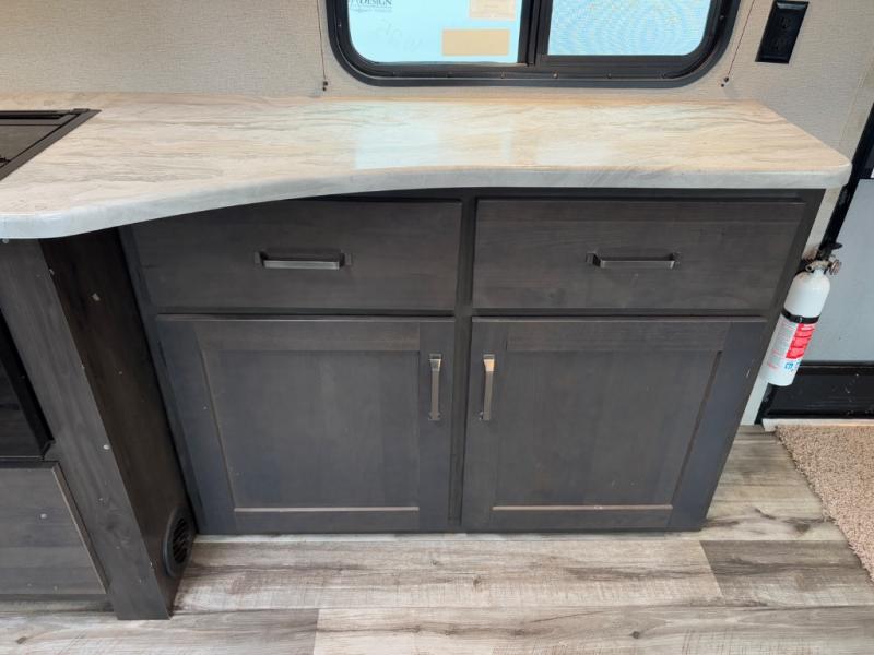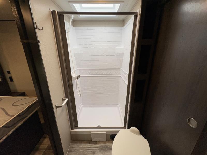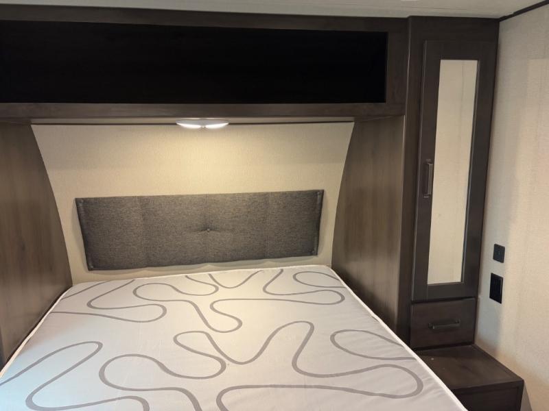 Are you ready to camp in comfort with your family or friends? This travel trailer allows you to do just that! There are double-size bunks in the back with step storage for books or board games. There is also a closet here to keep clothes wrinkle-free. The U-shaped dinette within the slide out can be switched out for the optional theatre seats, and the jackknife sofa will be the perfect spot to visit with your crew. This model features a walk-through bath that leads to the front master bedroom. You'll love the queen bed here, overhead storage, and your own exterior entry door for convenience.