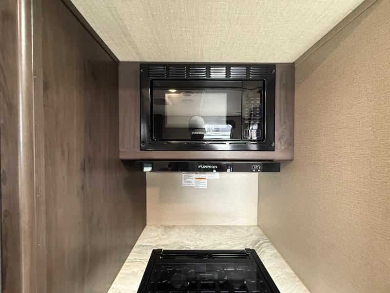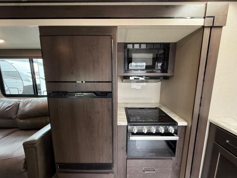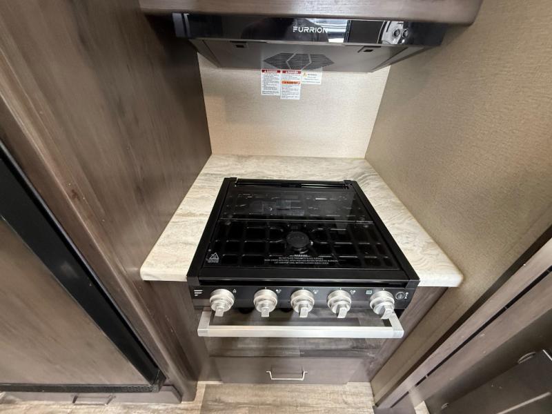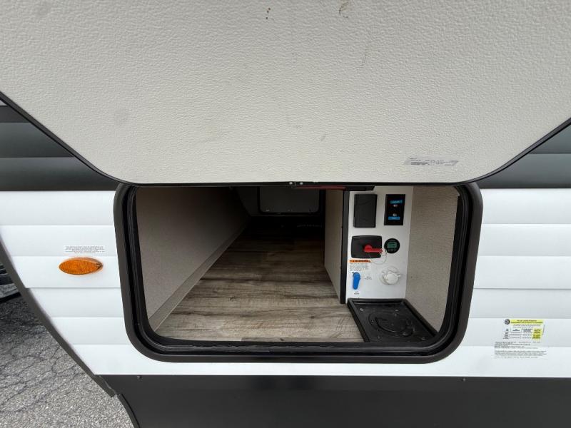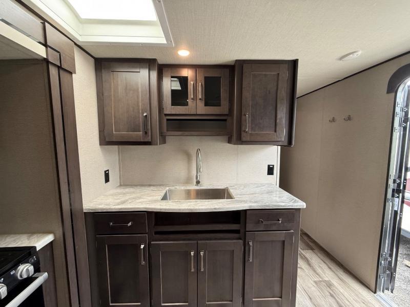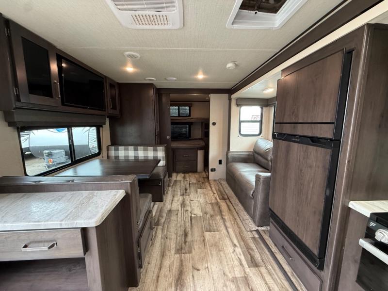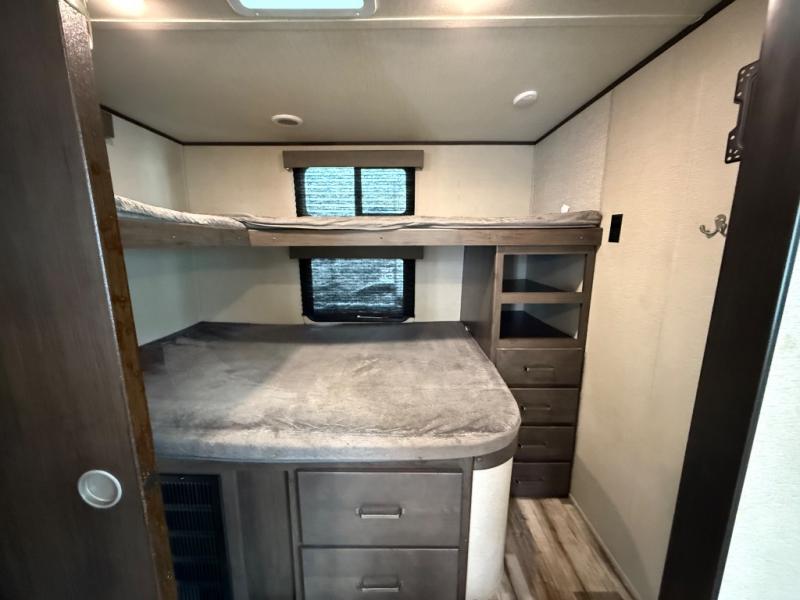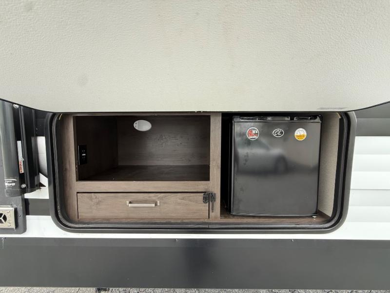 A rear private bunkhouse plus a front private bedroom make this the perfect family-friendly trailer. There are two bunks, a residential full bed, plus a dresser and two drawers to store clothes in the bunkhouse. The 42" x 22" rear storage will be great for hiking gear or extra lawn chairs, and you'll find tons of interior storage throughout for all your belongings. Head to the main living area to relax on the tri-fold sofa or booth dinette, or you may just want to visit with the cook outside as they use the outdoor kitchen! There is an LP quick connect, an exterior spray port, a two-burner cooktop, plus a 1.6-cu. ft. exterior refrigerator. Now that's a convenient outdoor kitchen!