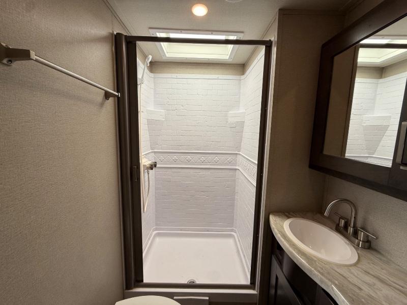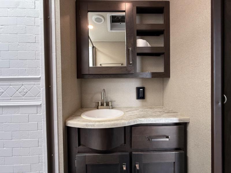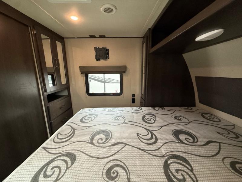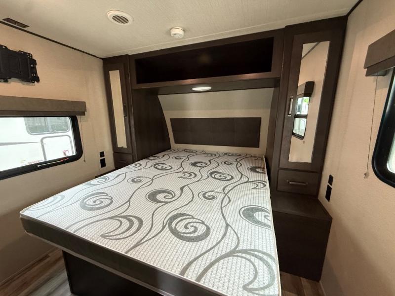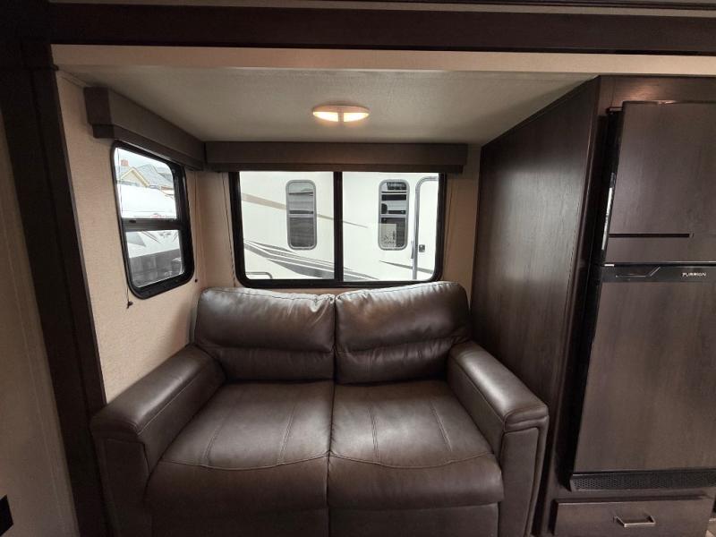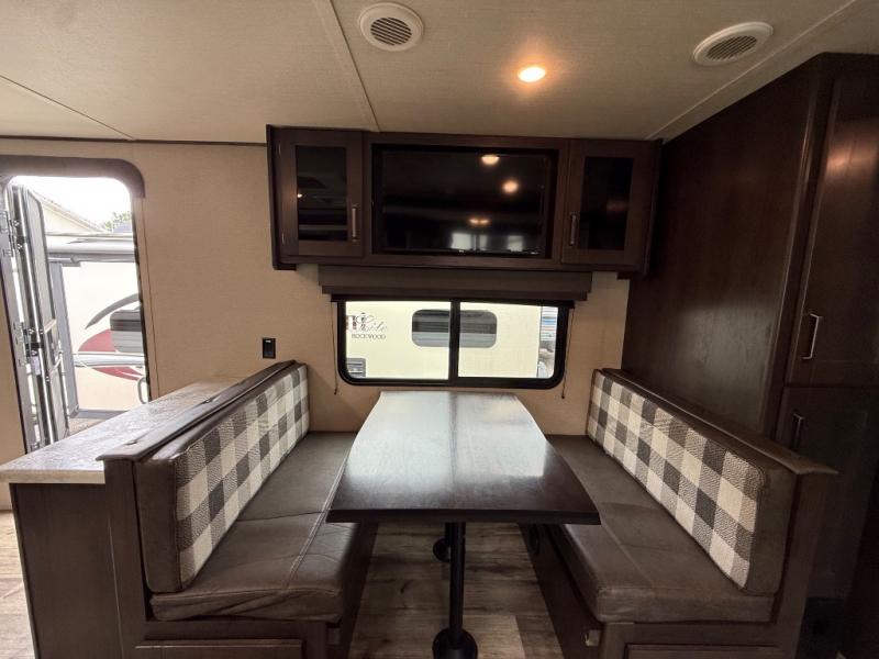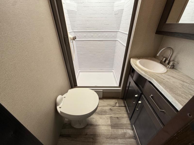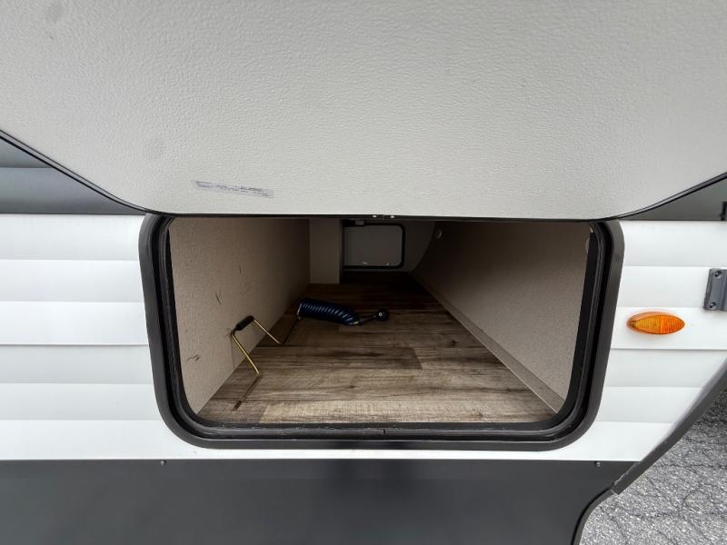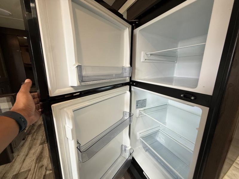 A rear private bunkhouse plus a front private bedroom make this the perfect family-friendly trailer. There are two bunks, a residential full bed, plus a dresser and two drawers to store clothes in the bunkhouse. The 42" x 22" rear storage will be great for hiking gear or extra lawn chairs, and you'll find tons of interior storage throughout for all your belongings. Head to the main living area to relax on the tri-fold sofa or booth dinette, or you may just want to visit with the cook outside as they use the outdoor kitchen! There is an LP quick connect, an exterior spray port, a two-burner cooktop, plus a 1.6-cu. ft. exterior refrigerator. Now that's a convenient outdoor kitchen!