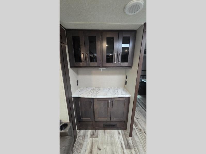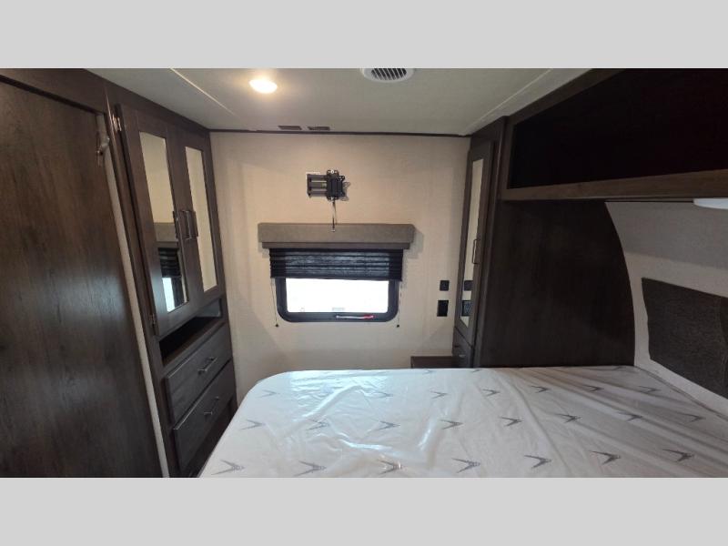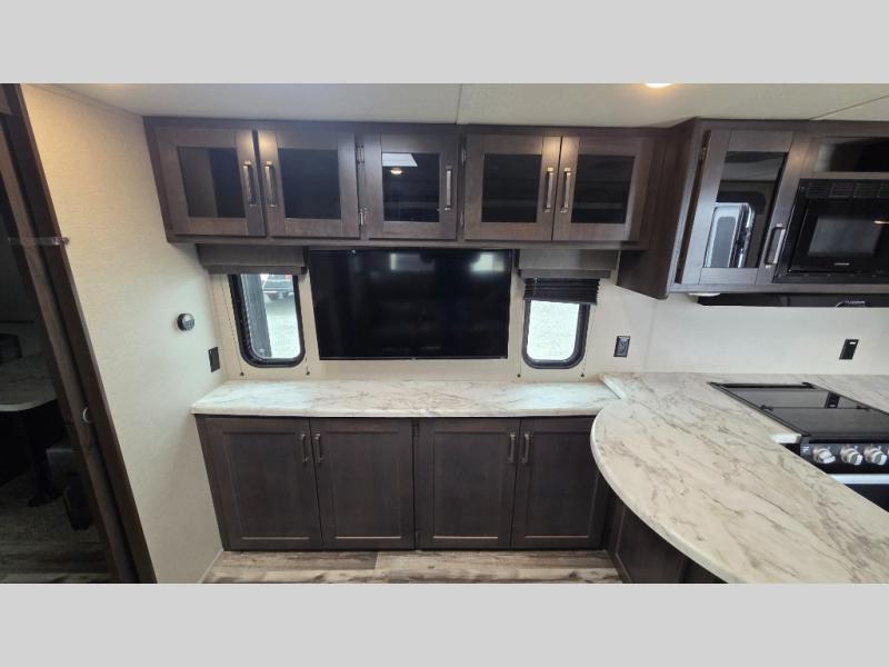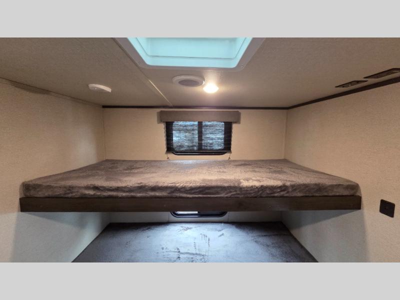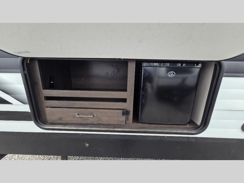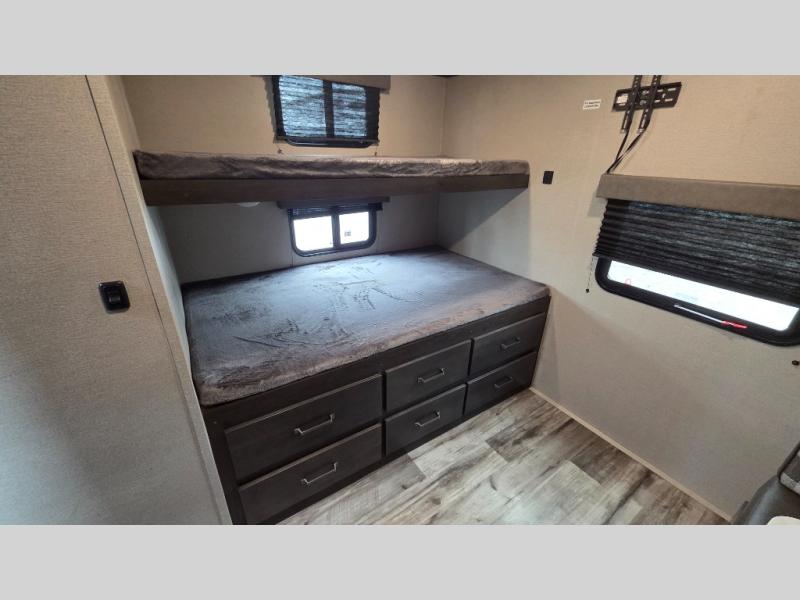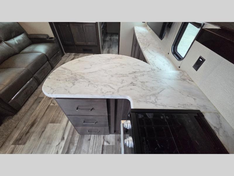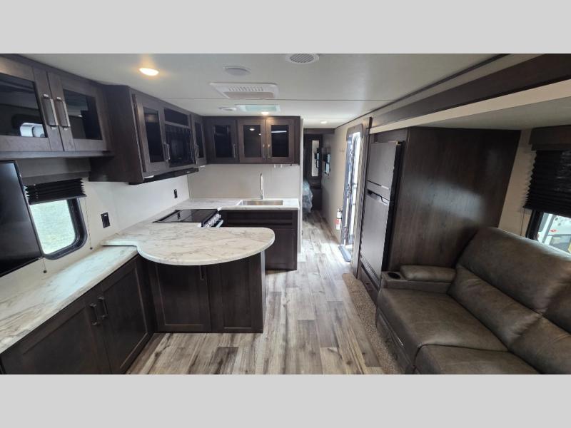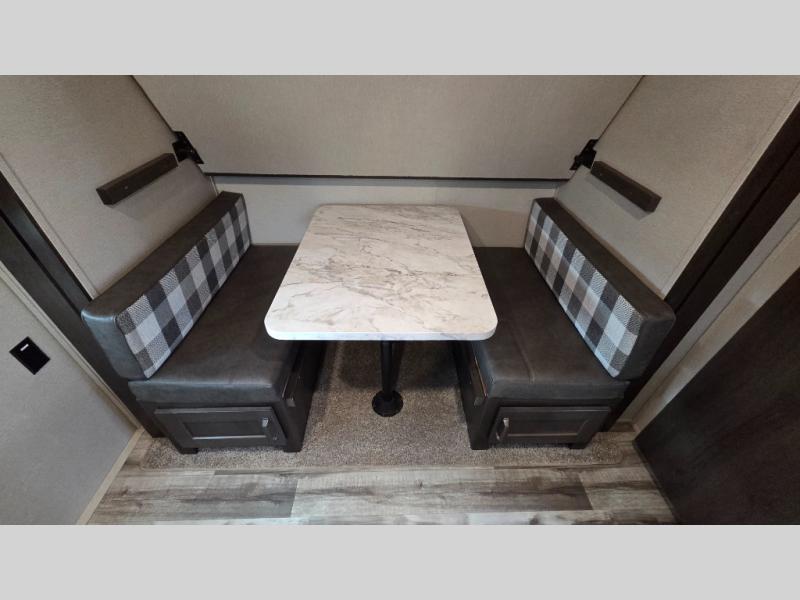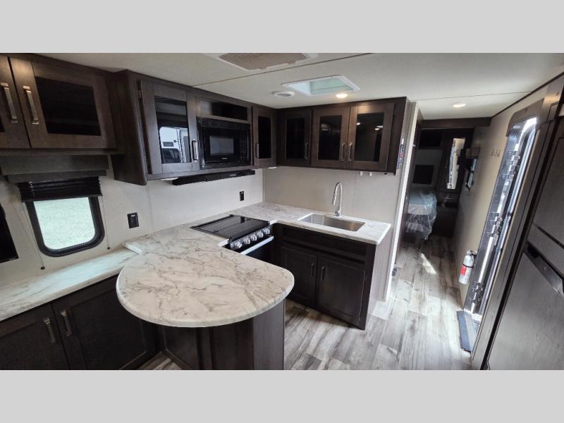 This travel trailer can comfortably sleep nine people each night thanks to the added rear private bunkhouse. Here, you'll find three bunks, a tri-fold sofa that can be optioned out for a booth dinette, plus six drawers under the bunks for clothes. You will have the front private bedroom all to yourselves with a queen bed and dual nightstands, and any other guests can sleep on the U-shaped dinette in the main living area. There is also an entertainment center here, a pet drawer under the 8 cu. ft. 12V refrigerator, and a counter with stools to enjoy your coffee at.