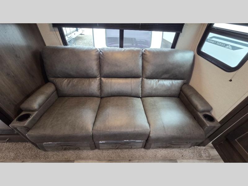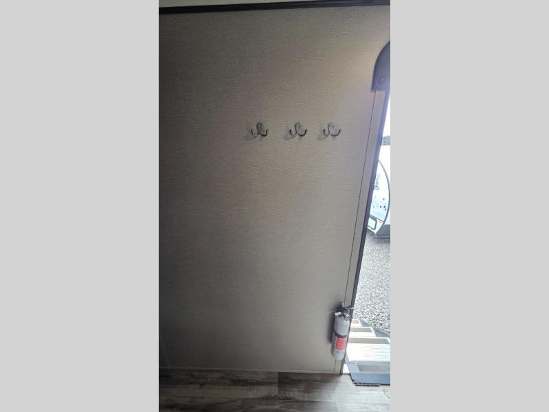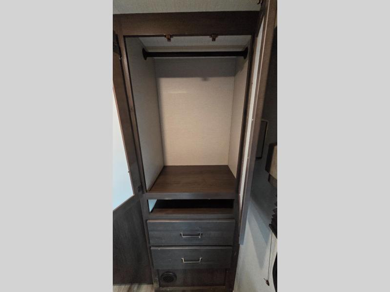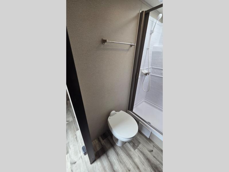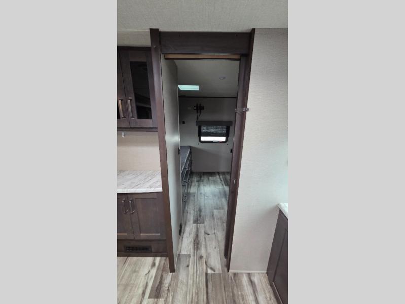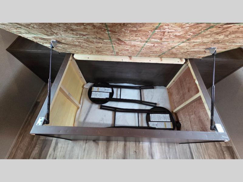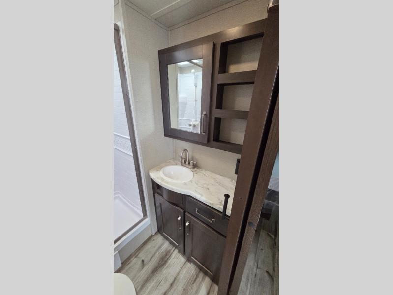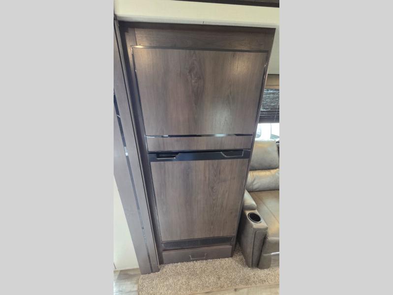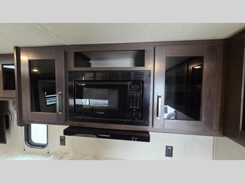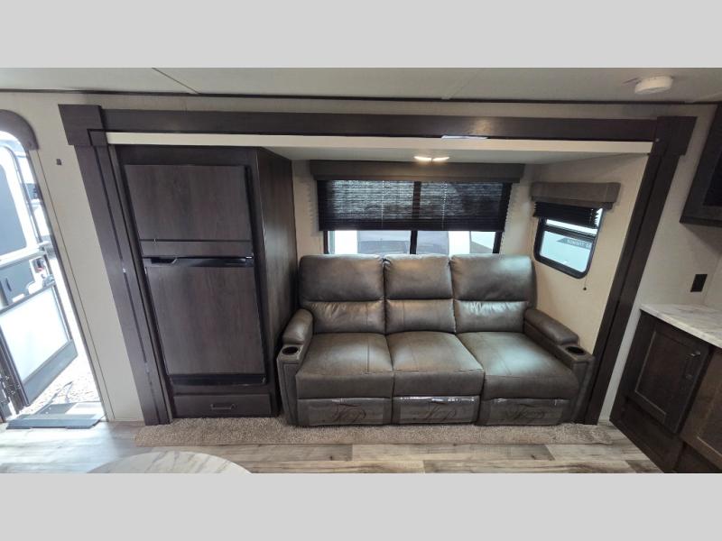 This travel trailer can comfortably sleep nine people each night thanks to the added rear private bunkhouse. Here, you'll find three bunks, a tri-fold sofa that can be optioned out for a booth dinette, plus six drawers under the bunks for clothes. You will have the front private bedroom all to yourselves with a queen bed and dual nightstands, and any other guests can sleep on the U-shaped dinette in the main living area. There is also an entertainment center here, a pet drawer under the 8 cu. ft. 12V refrigerator, and a counter with stools to enjoy your coffee at.