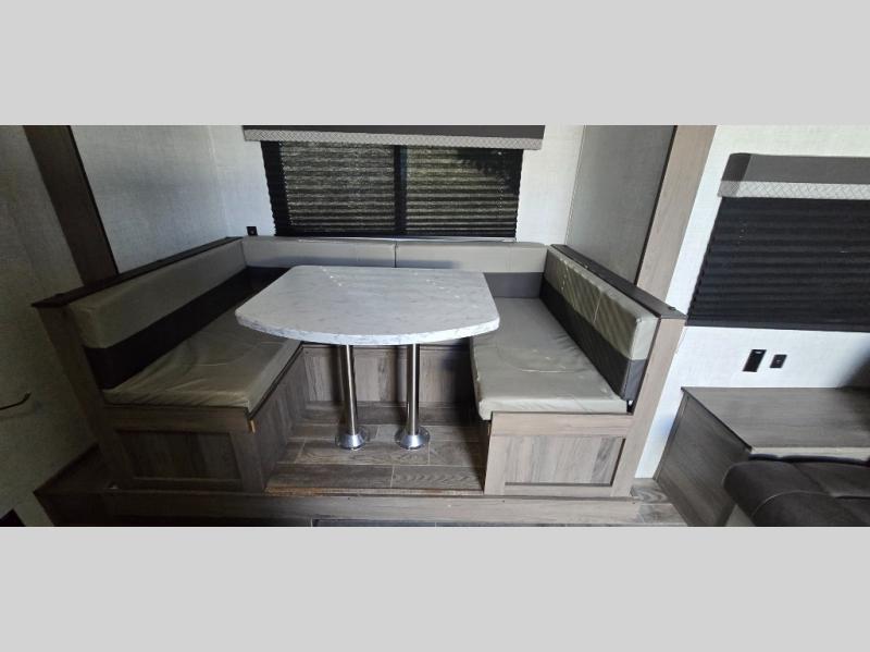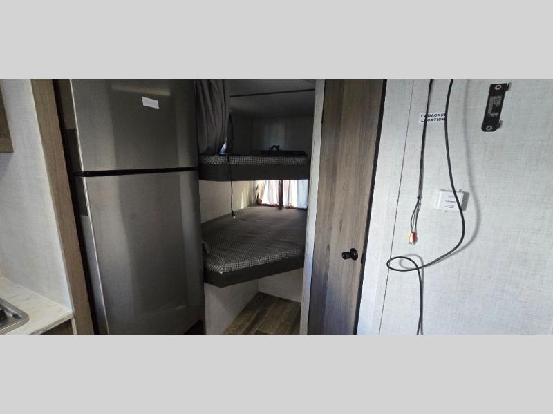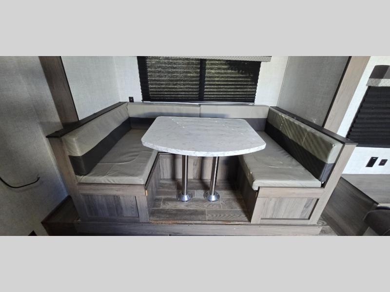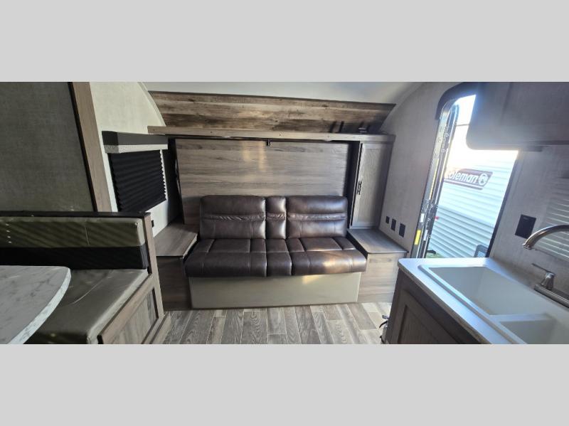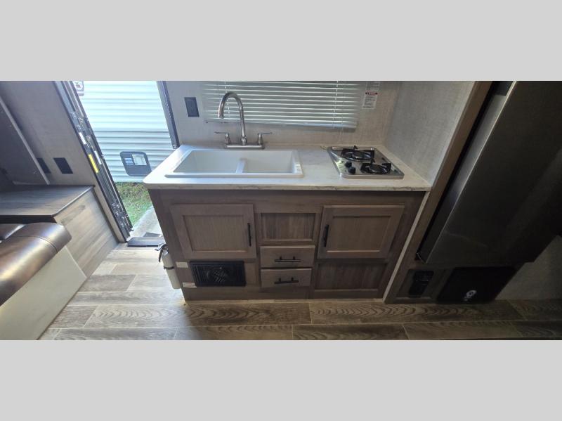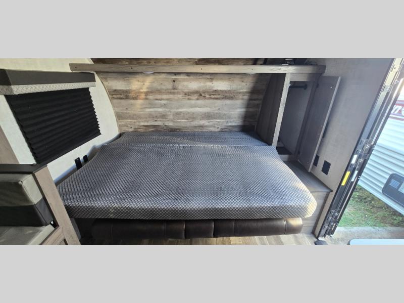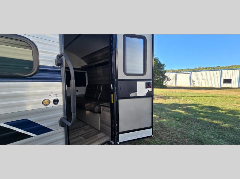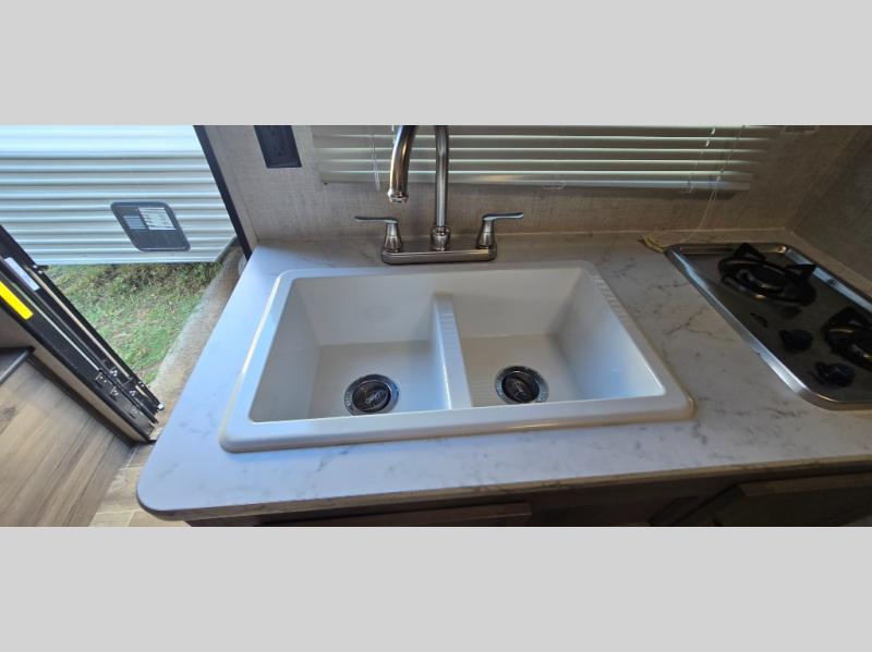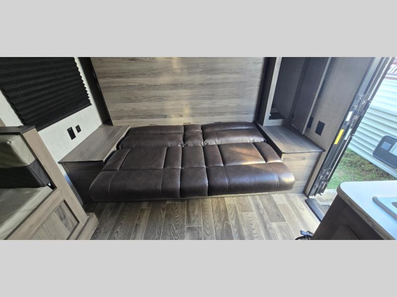 Are you searching for a travel trailer with more space and a larger sleeping capacity? Check out this unit with a U-shaped dinette slide out, double-size bunks, plus a versatile Murphy bed! The chef can whip up a hearty meal on the two burner cooktop, or use the outside 1/2 kitchen. The full bath inside will allow you to stay clean throughout your camping trip, and you'll find plenty of storage space, including a wardrobe for clothes.