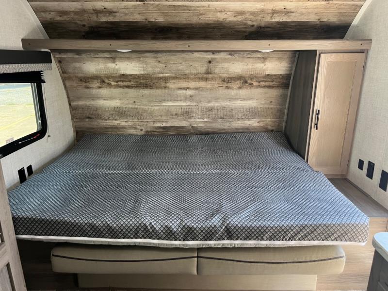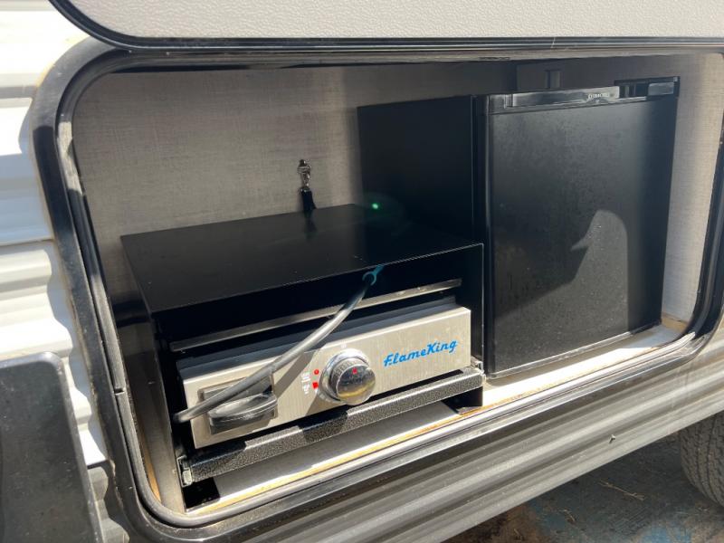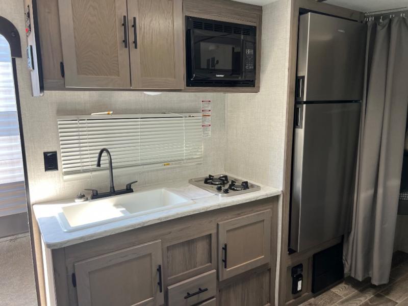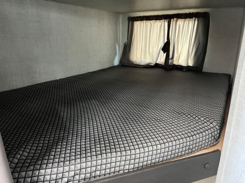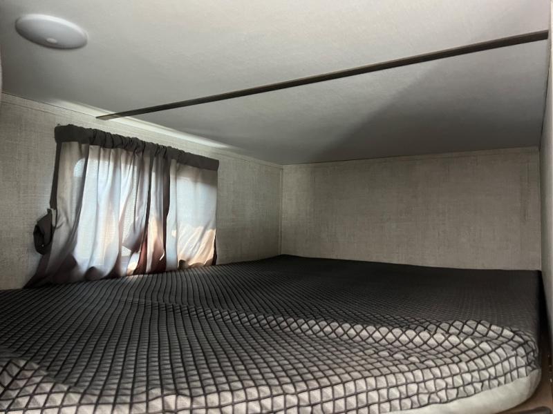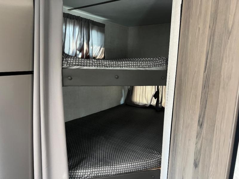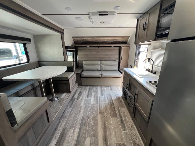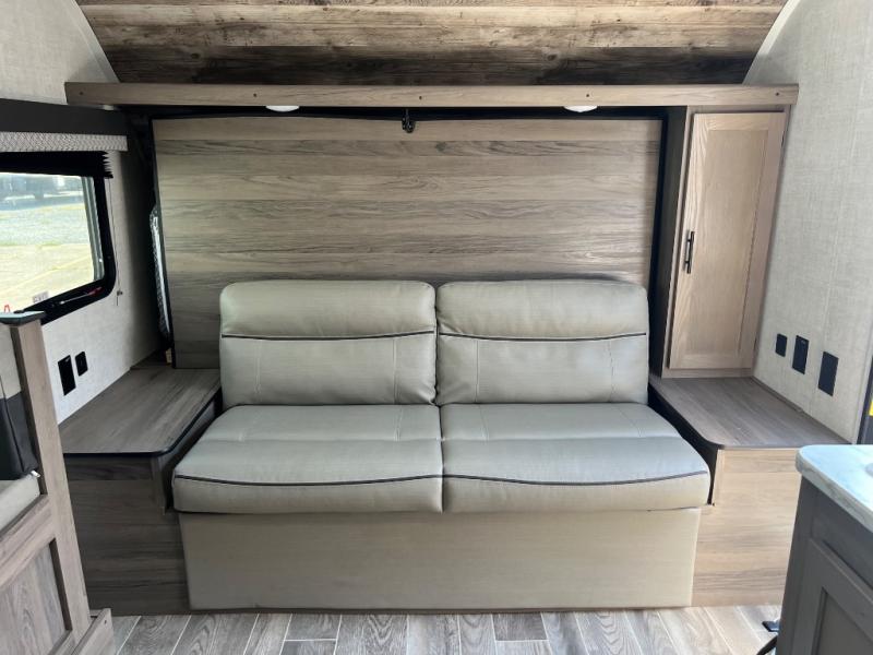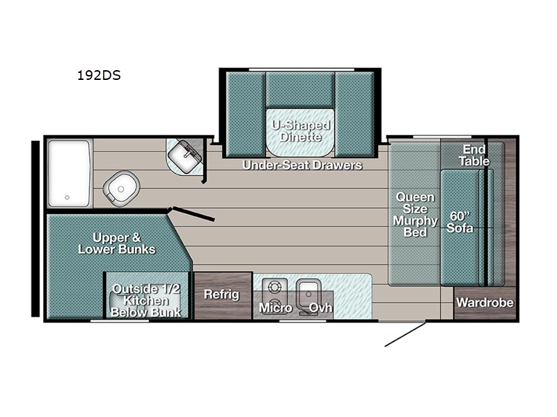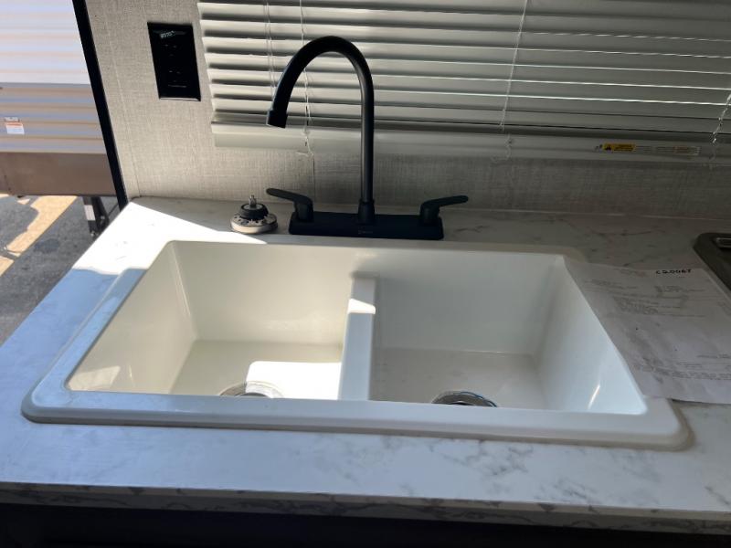 Are you searching for a travel trailer with more space and a larger sleeping capacity? Check out this unit with a U-shaped dinette slide out, double-size bunks, plus a versatile Murphy bed! The chef can whip up a hearty meal on the two burner cooktop, or use the outside 1/2 kitchen. The full bath inside will allow you to stay clean throughout your camping trip, and you'll find plenty of storage space, including a wardrobe for clothes.