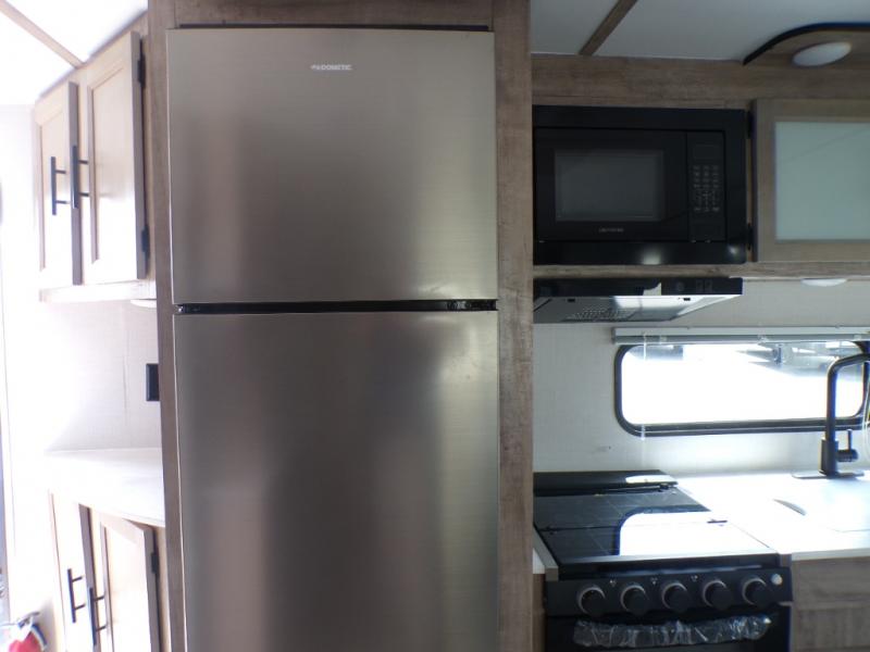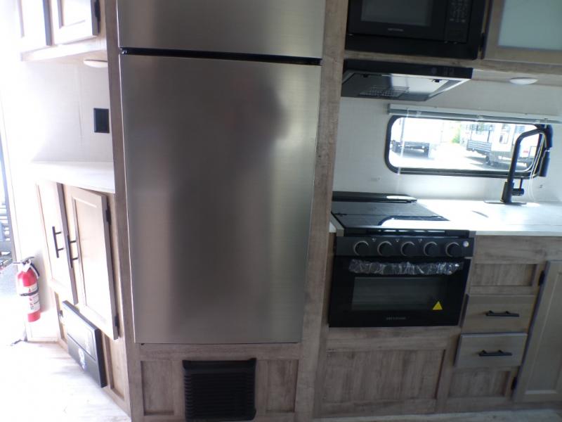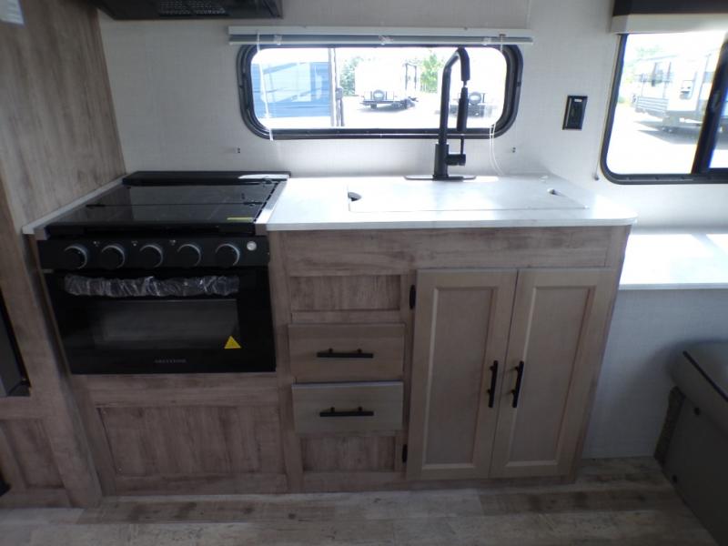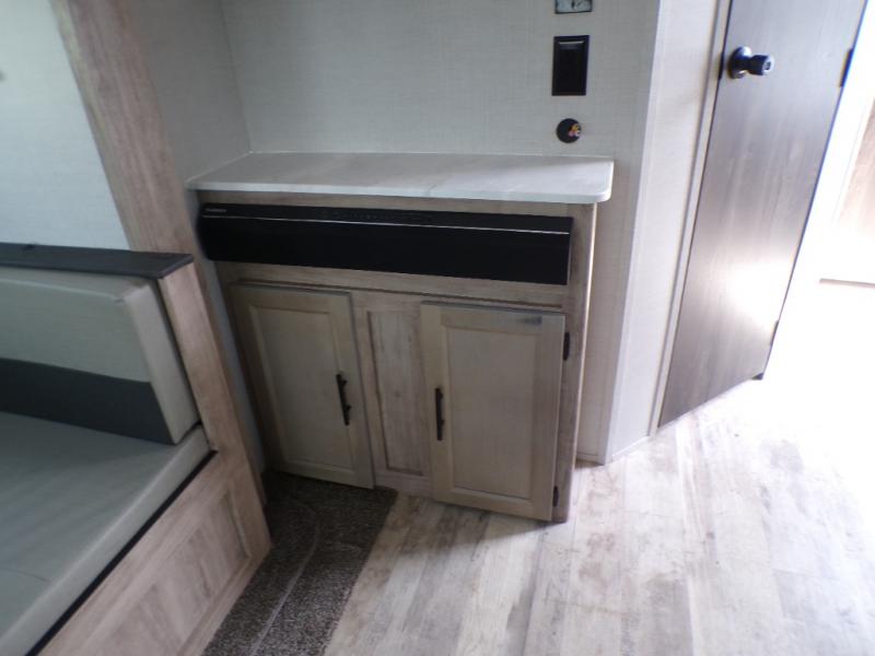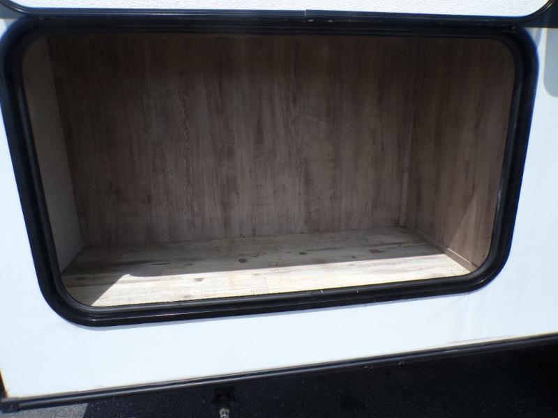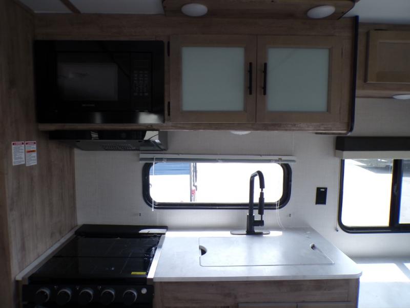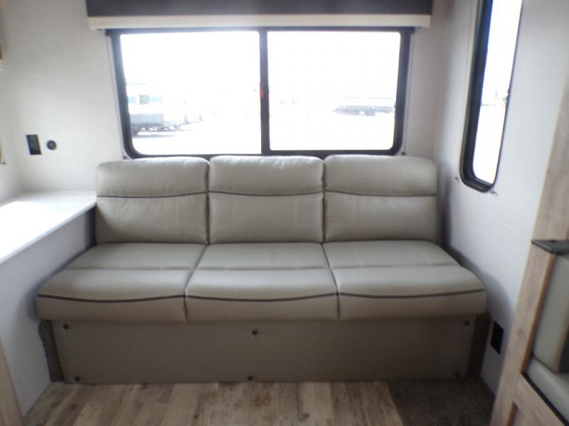Camping with friends has never been so easy than in this cozy travel trailer. Once you arrive at your destination, prepare lunch on the three burner cooktop and you can dine at the booth dinette. Your guest can make this area their bed at night, along with the jack knife sofa. There is a front master bedroom with a queen bed that will feel just like home, and the two wardrobes provide a place for all your clothes. Head outside to find a pass-through storage, additional outside storage, plus an electric awning with LED lights!