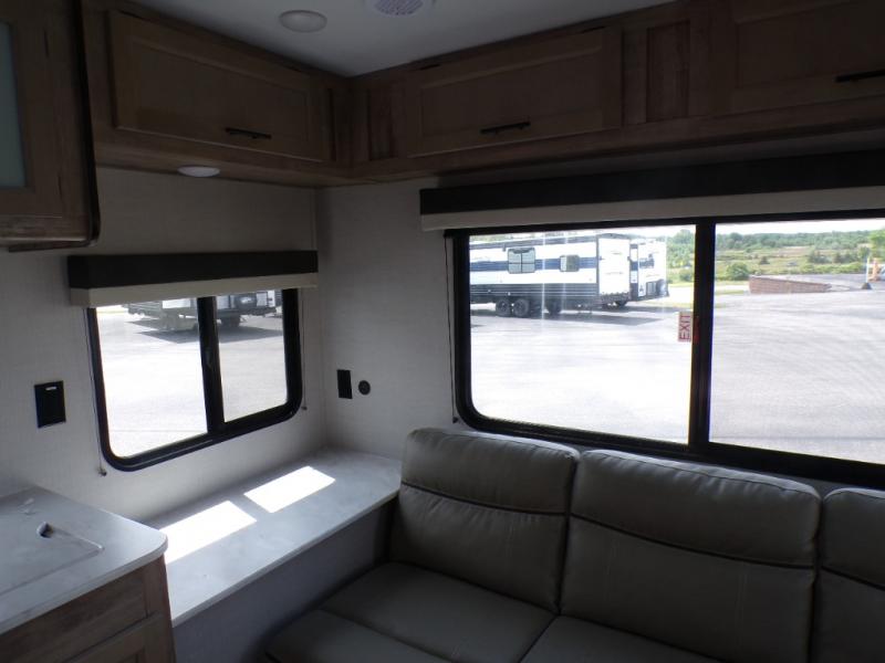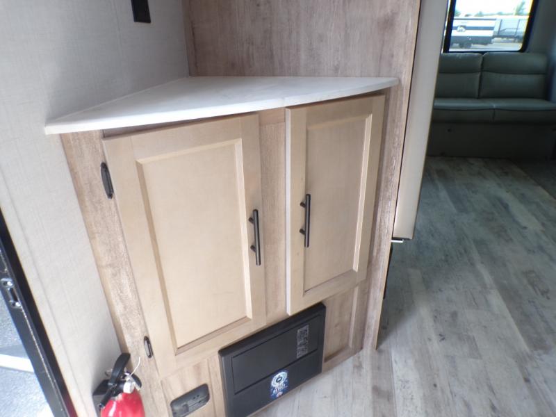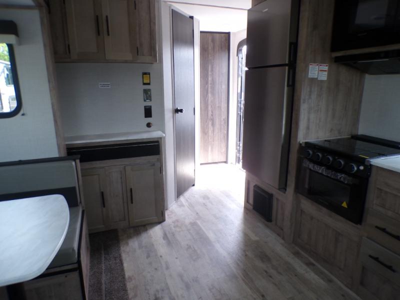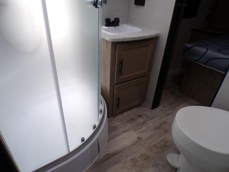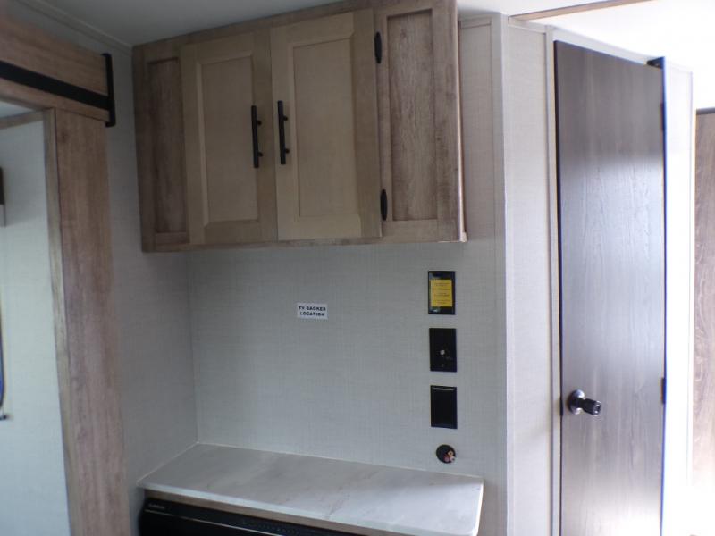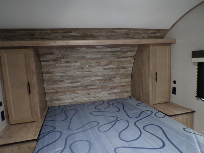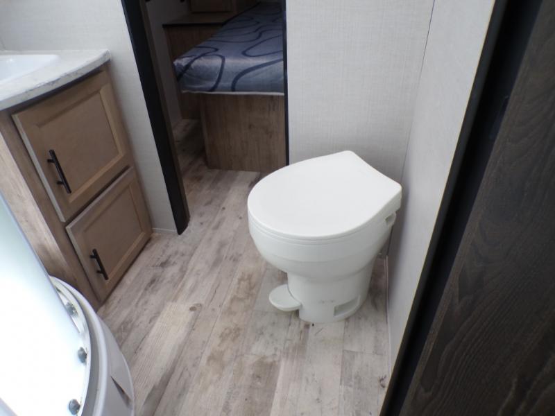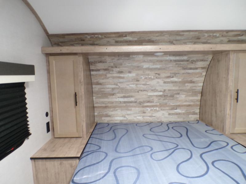 Camping with friends has never been so easy than in this cozy travel trailer. Once you arrive at your destination, prepare lunch on the three burner cooktop and you can dine at the booth dinette. Your guest can make this area their bed at night, along with the jack knife sofa. There is a front master bedroom with a queen bed that will feel just like home, and the two wardrobes provide a place for all your clothes. Head outside to find a pass-through storage, additional outside storage, plus an electric awning with LED lights!