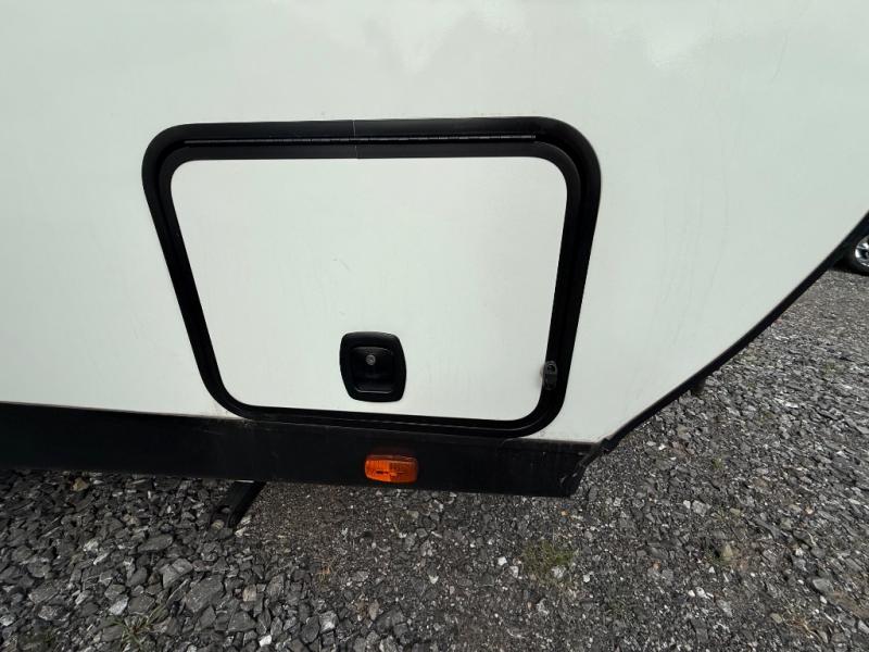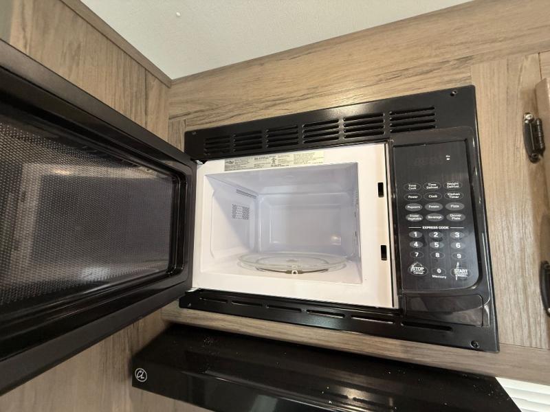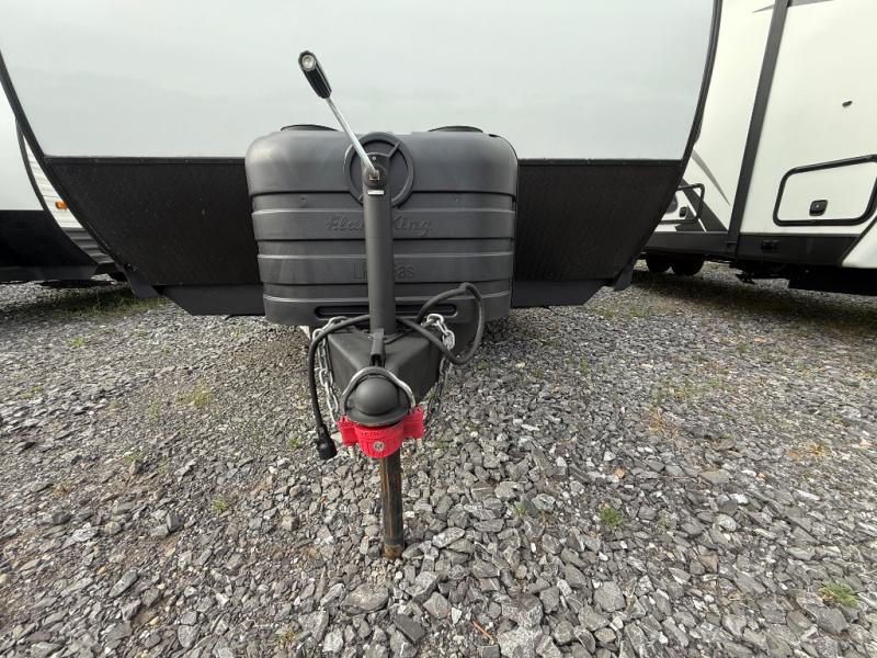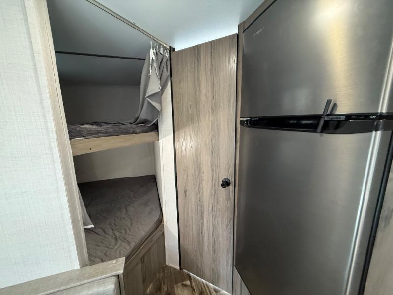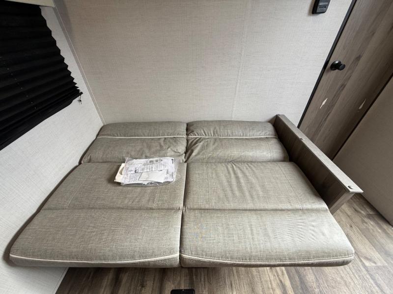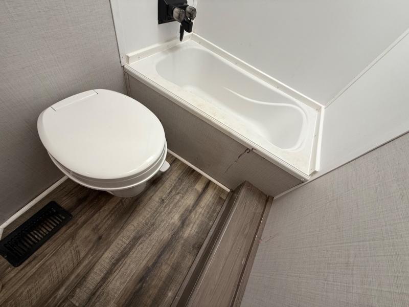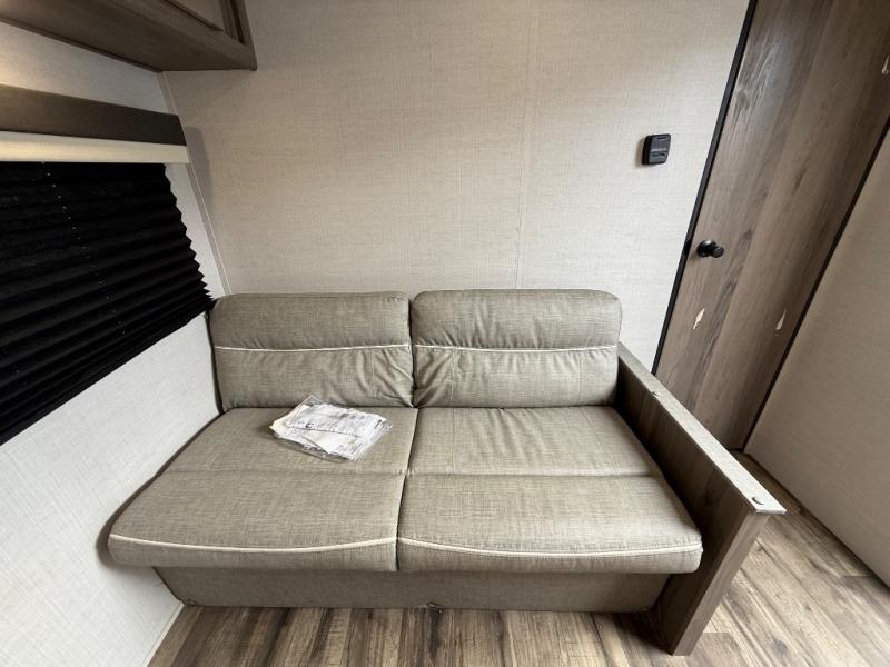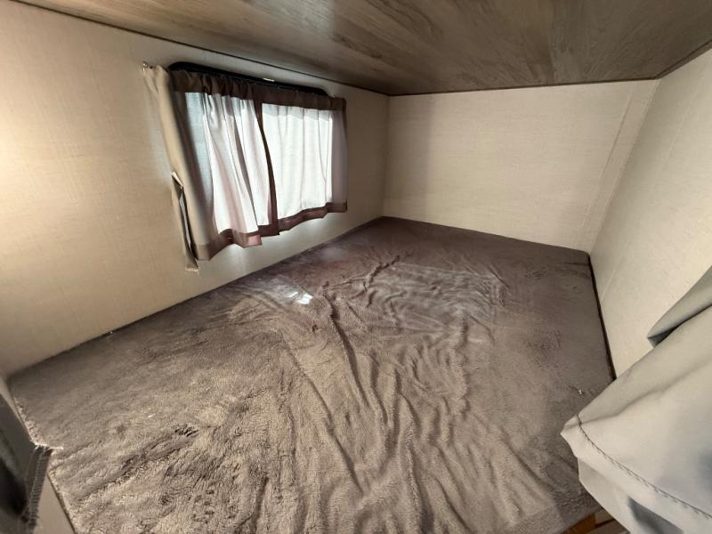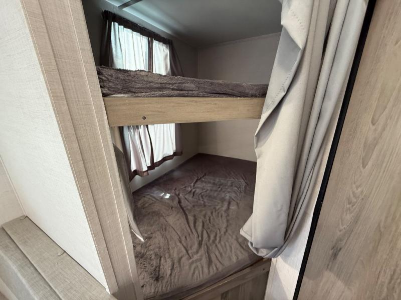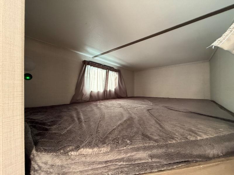 Make your reservations, start planning your menu, and load up your clothes, games, food and more for a fun weekend camping in this trailer! You will have a front private bedroom with a queen-size bed and closets, while your family and friends can choose from the double-size bunks and furniture to sleep on. There is a convertible sofa and a booth dinette, plus a galley kitchen with a microwave oven, sink, plus overhead storage for pots, pans, and dry goods. The rear corner full bathroom offers a tub/shower, toilet, and a sink to be able to get cleaned up in after hiking or relaxing by a fire.