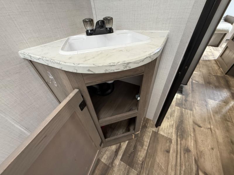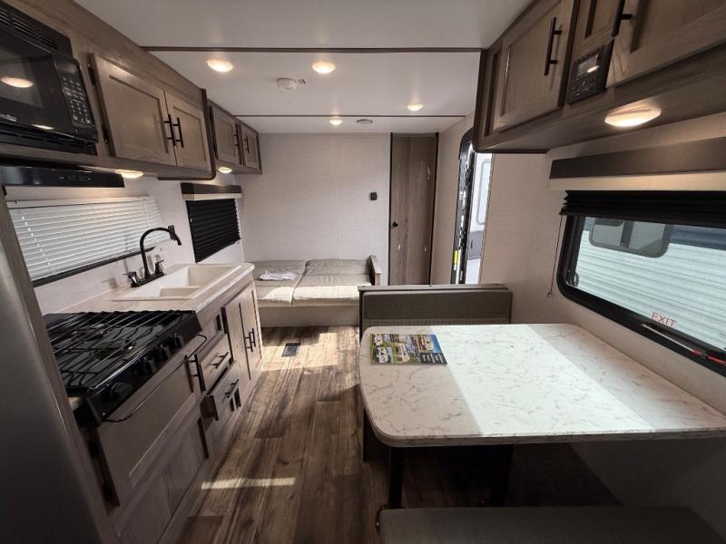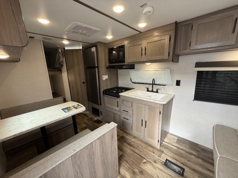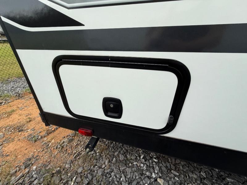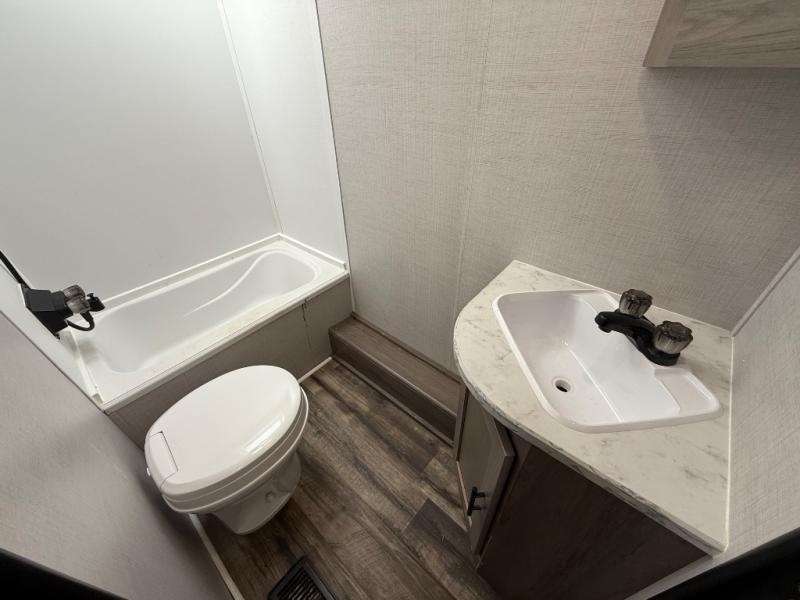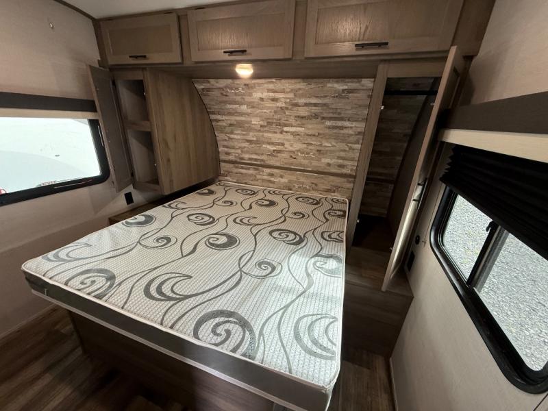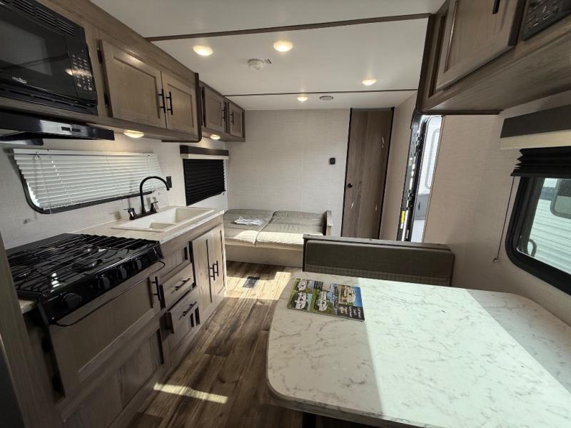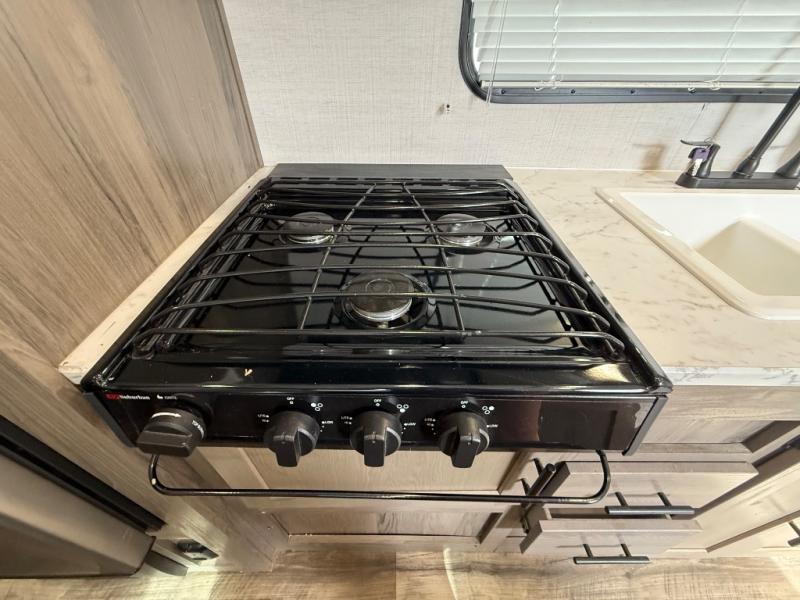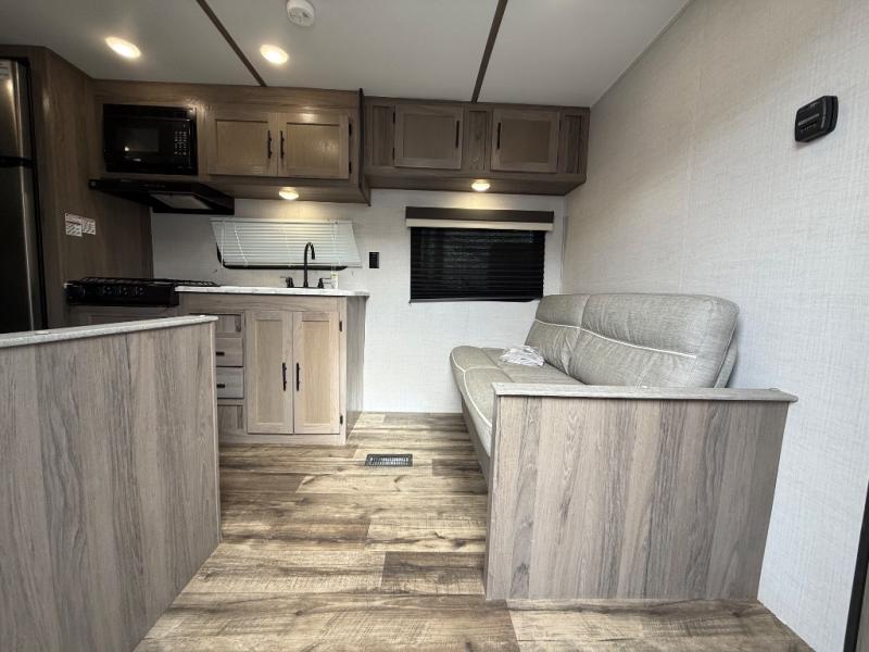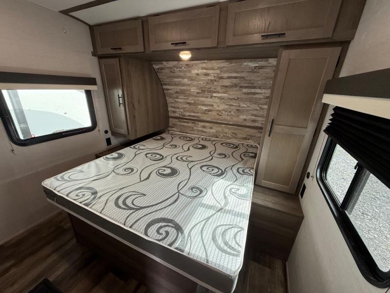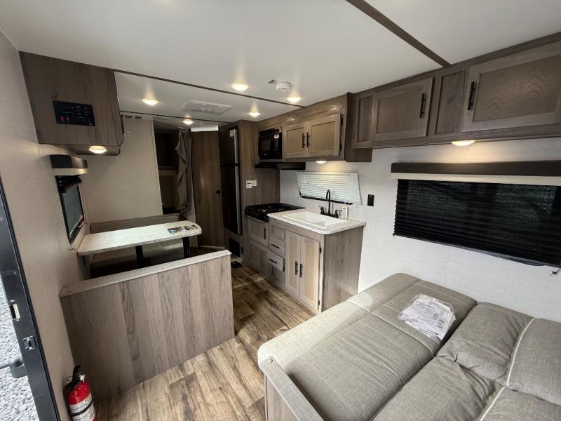 Make your reservations, start planning your menu, and load up your clothes, games, food and more for a fun weekend camping in this trailer! You will have a front private bedroom with a queen-size bed and closets, while your family and friends can choose from the double-size bunks and furniture to sleep on. There is a convertible sofa and a booth dinette, plus a galley kitchen with a microwave oven, sink, plus overhead storage for pots, pans, and dry goods. The rear corner full bathroom offers a tub/shower, toilet, and a sink to be able to get cleaned up in after hiking or relaxing by a fire.