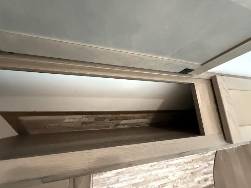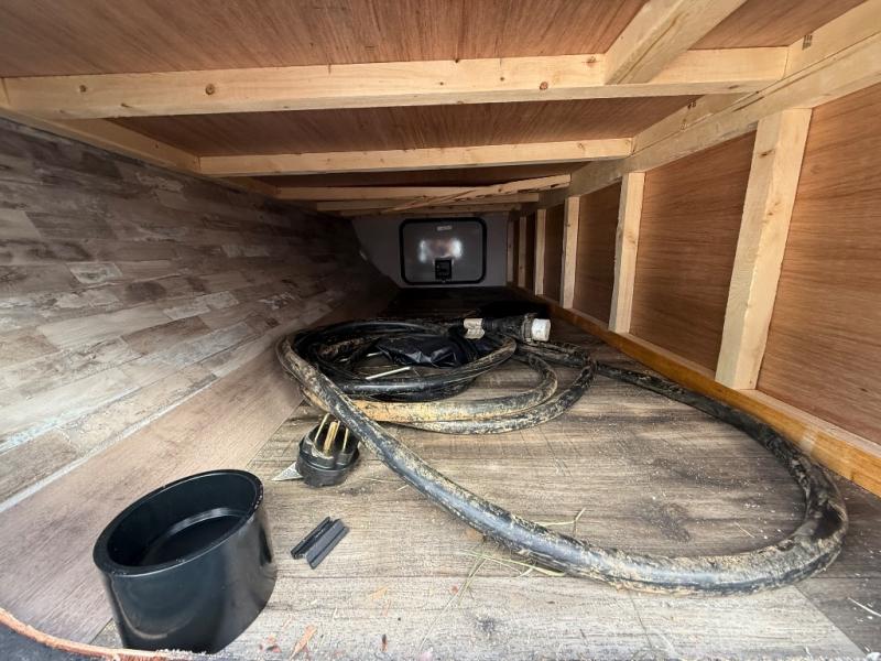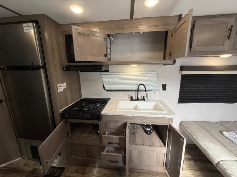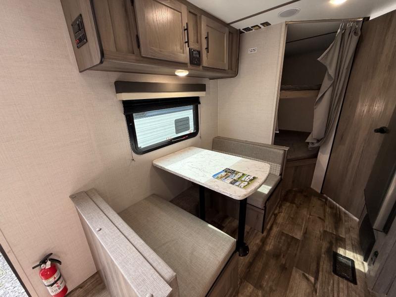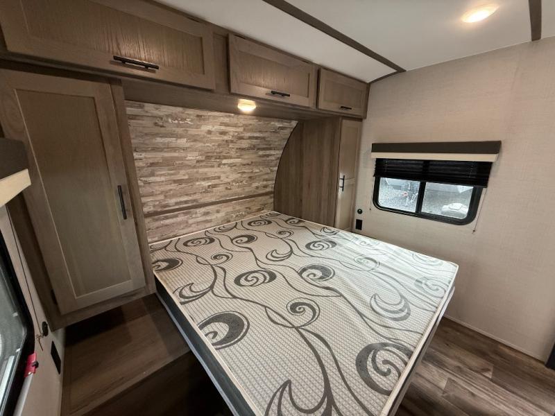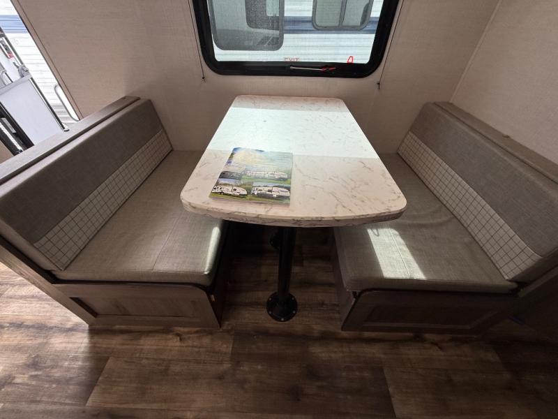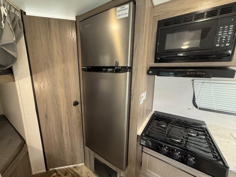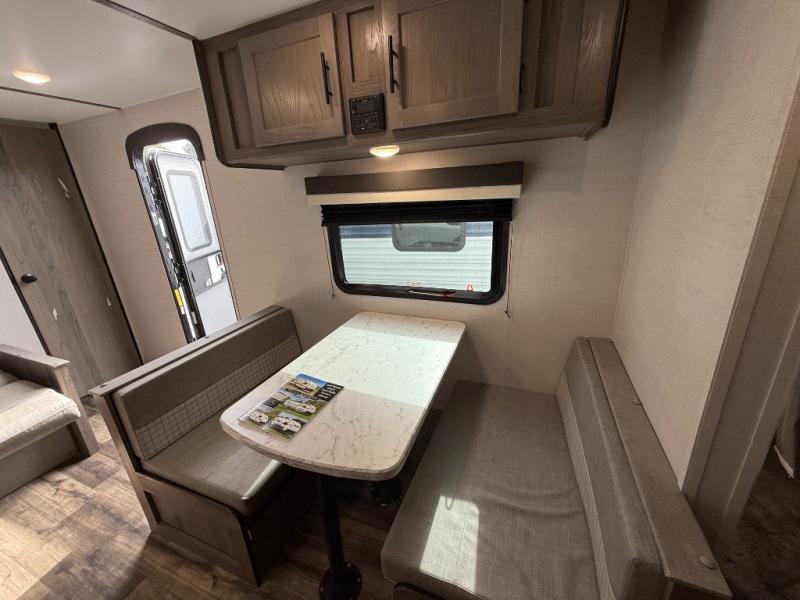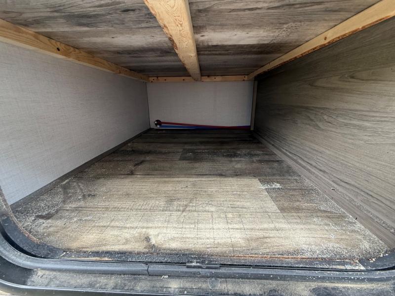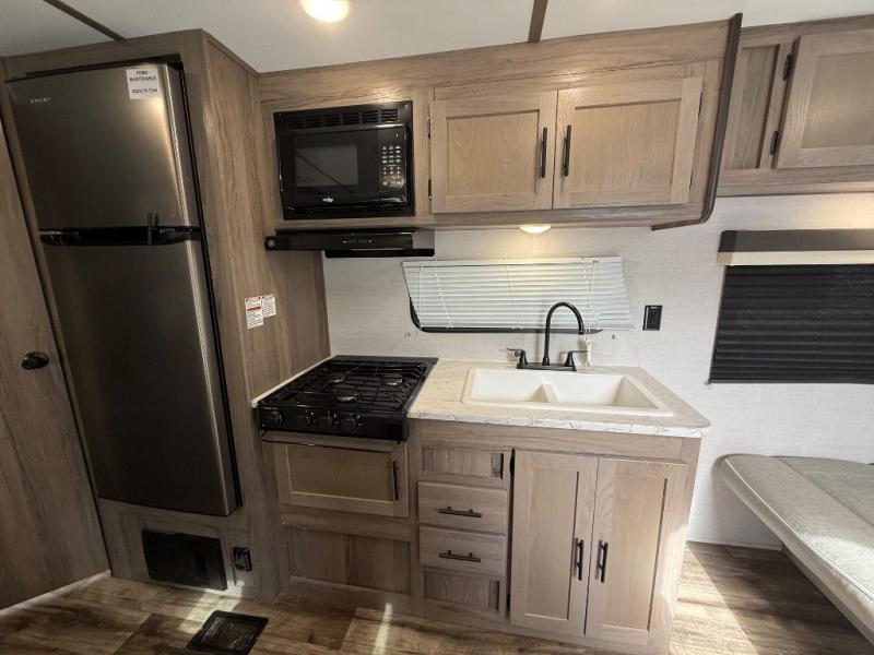 Make your reservations, start planning your menu, and load up your clothes, games, food and more for a fun weekend camping in this trailer! You will have a front private bedroom with a queen-size bed and closets, while your family and friends can choose from the double-size bunks and furniture to sleep on. There is a convertible sofa and a booth dinette, plus a galley kitchen with a microwave oven, sink, plus overhead storage for pots, pans, and dry goods. The rear corner full bathroom offers a tub/shower, toilet, and a sink to be able to get cleaned up in after hiking or relaxing by a fire.