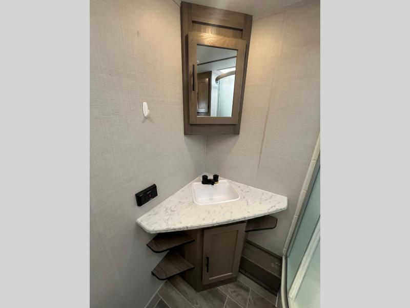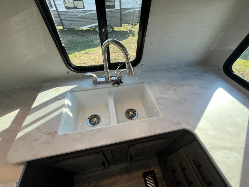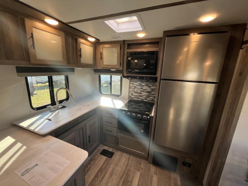 Where ever you camp, you will be comfortable in this trailer that offers a spacious private bedroom with a space saving sliding door, a walk-around queen-size bed, and clothing storage. The hallway provides a unique wardrobe that you can offer your guests, or store more items for yourself for those longer trips. The full bathroom provides linen storage as well. The main living and kitchen area is spacious with a slide out that includes a tri-fold sofa bed and booth dinette, or choose the table and chairs option, plus there are two lounge chairs to relax in. And the rear kitchen includes appliances and extra counter space that wraps around the other wall offering a U-shaped area so you have plenty of space to prepare and serve meals.