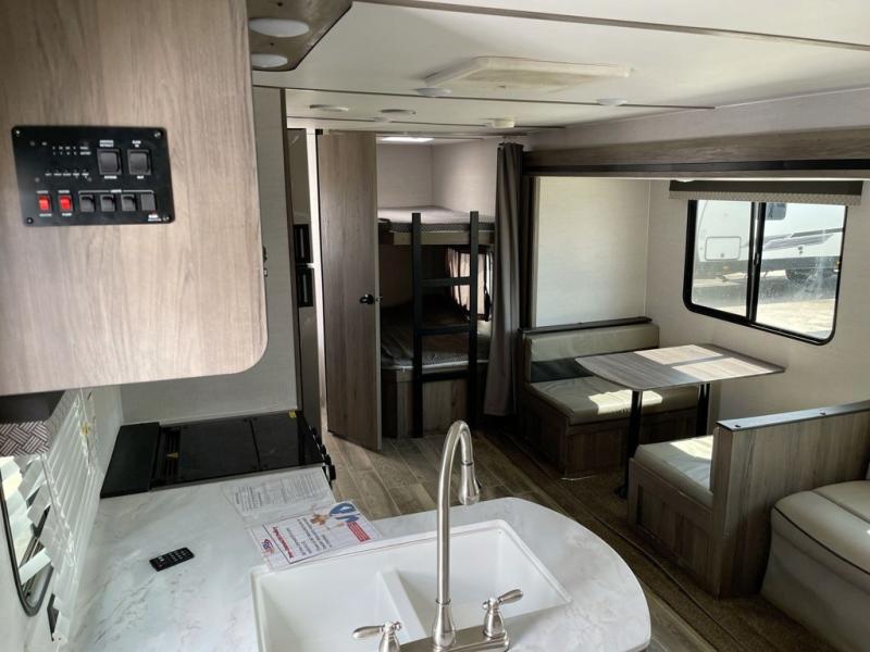 Get ready for comfort and fun at the campgrounds with this trailer thanks to all the amenities and space provided! Beginning with dual entry doors allowing you to easily access the main living and kitchen area and/or the full bathroom for quick entry and exit when having fun outside. Your guests or kids will love the double-size bunk beds to call their own while you have privacy in the front bedroom. The queen-size bed, the two wardrobes and the overhead shelf will provide you a comfortable place to sleep and plenty of space for your belongings. If you decide to invite more friends, they can sleep on the booth dinette and the sofa within the large slide out which gives this area more interior space for all. And the cook will love the L-shaped counter, the appliances, and the storage.