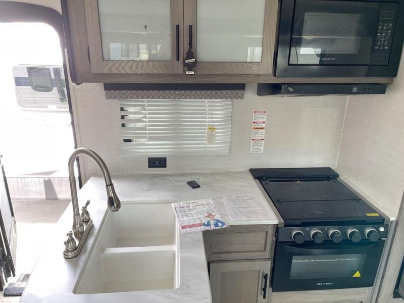 With any Kingsport Ultra Lite by Gulf Stream, you can enjoy a lightweight travel trailer on a budget with plenty of standard features to enjoy, and the required Lite Value Package offers convenience, comfort and Tech-Ready upgrades such as Wi-Fi and satellite TV ready connections, solar panel prep, back-up camera hookups, and multiple USB ports to keep the electronics charged. Each is constructed with a one-piece synthetic vinyl roof, fiberglass insulation hand-cut and glued in place, Butyl caulk for better seal and fewer streaks, and full-width steel outriggers for superior strength and support. Inside is easy to care for with vinyl wallcovering and high-performance vinyl flooring throughout, plus you will enjoy the upgraded furniture package, the designer backsplash in the kitchen, and the craft-made cabinetry with designer drawer and door pulls. Make your selection now!