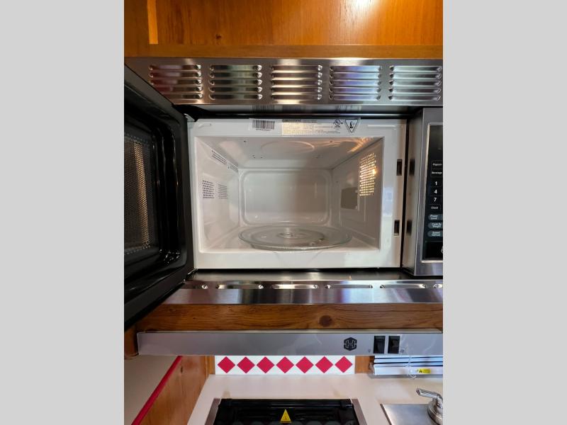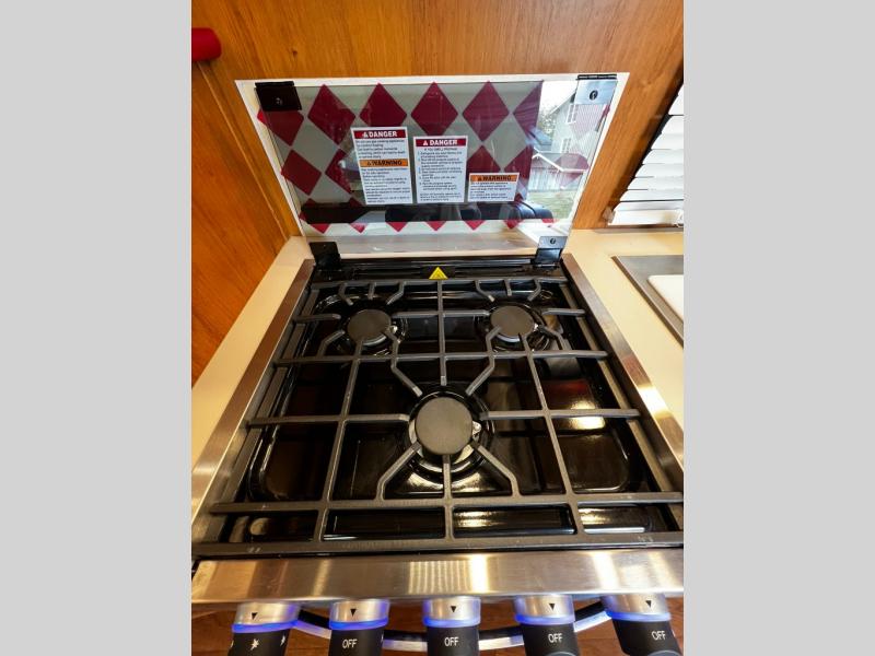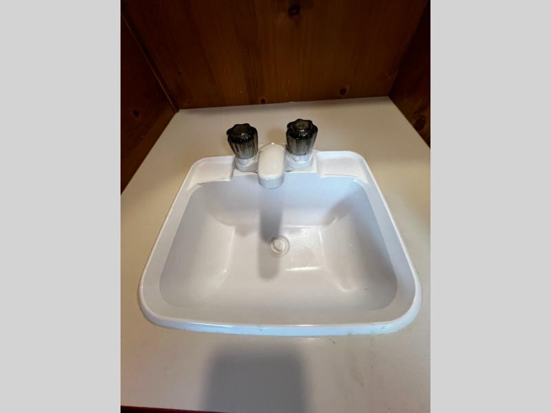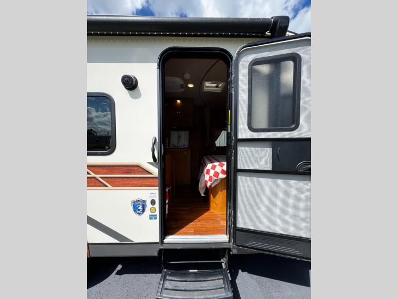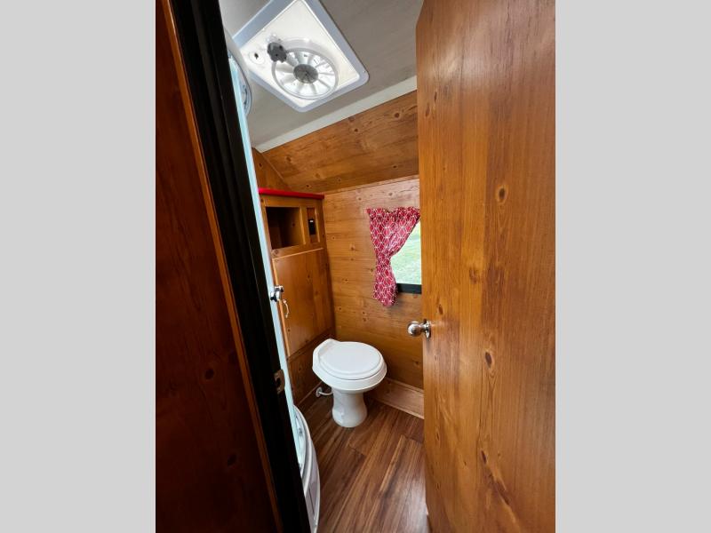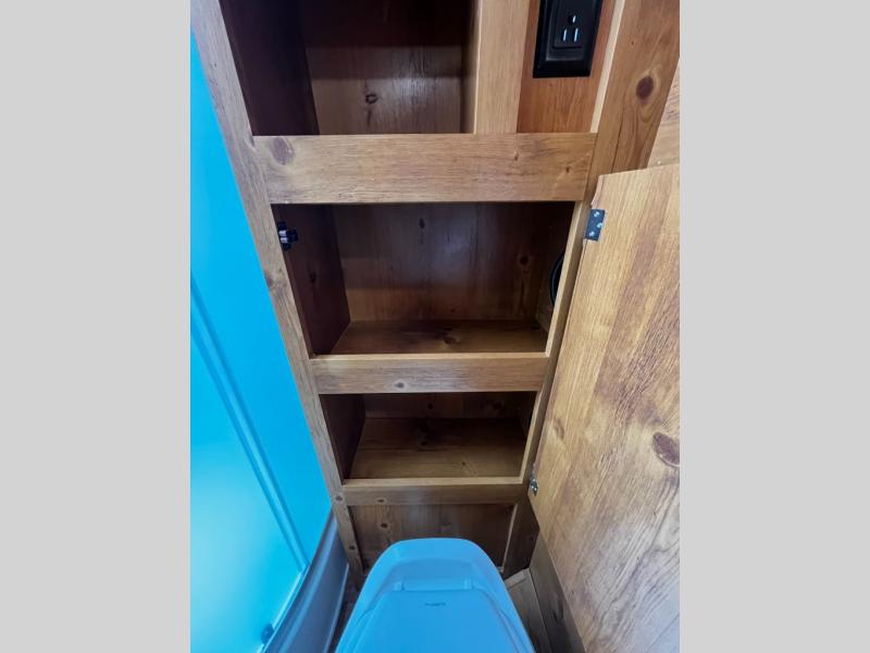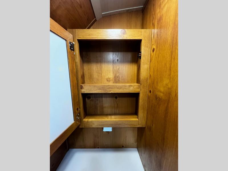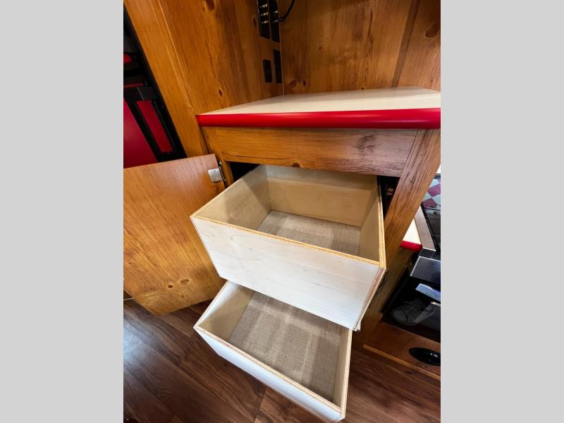 This travel trailer has the same layout as model 18MBS, but you'll enjoy a fixed RV queen bed up front instead of the Murphy bed. The full rear bath includes a linen closet and a wardrobe to keep your necessities organized, and you'll find additional storage throughout this model for your belongings. The vintage booth dinette will be the perfect place to dine at after dinner is made on the two burner cooktop. There is also a microwave oven for quick meals and a 6 cu. ft. double door refrigerator for cold drinks and perishables. And don't forget about the exterior pass-through storage for your larger camp gear!