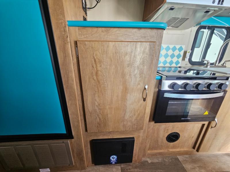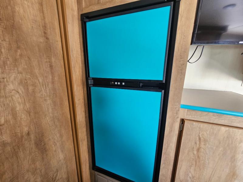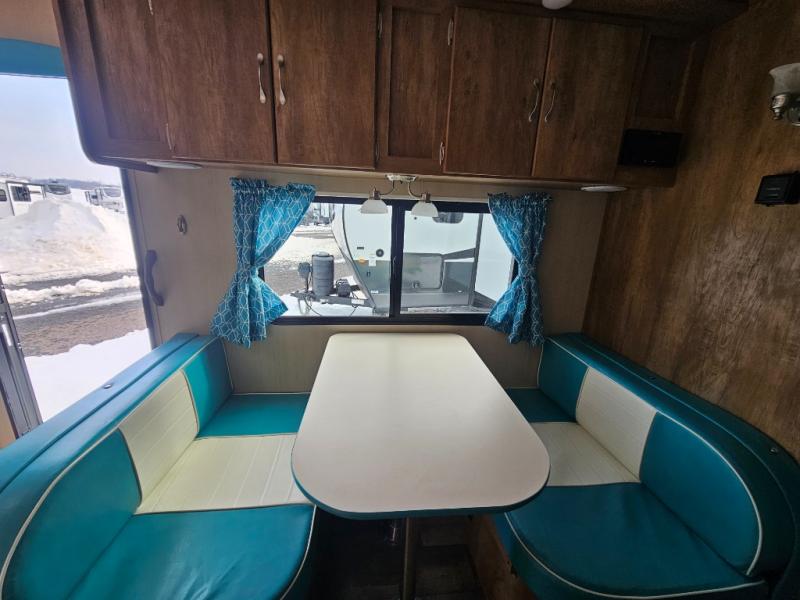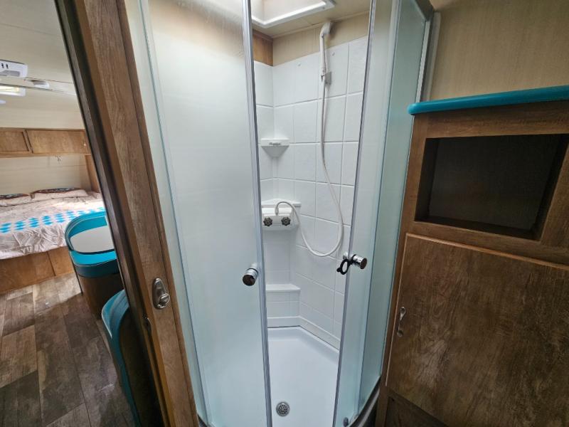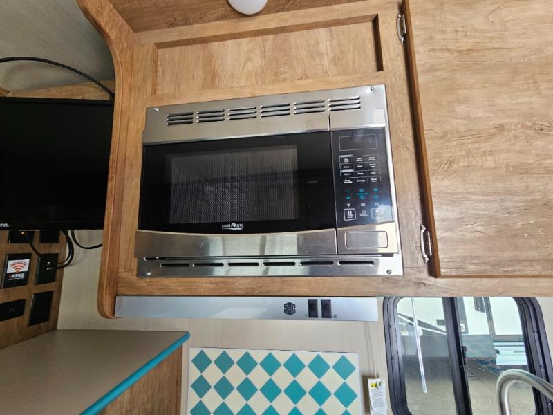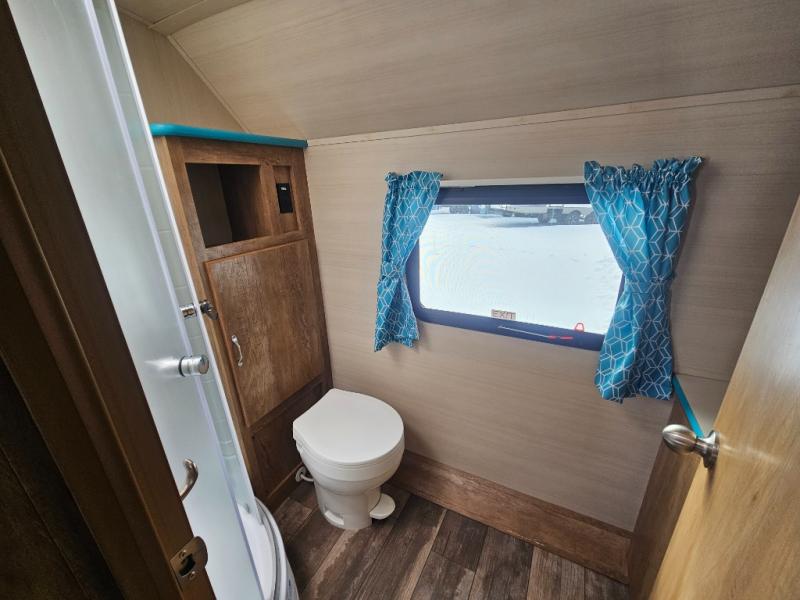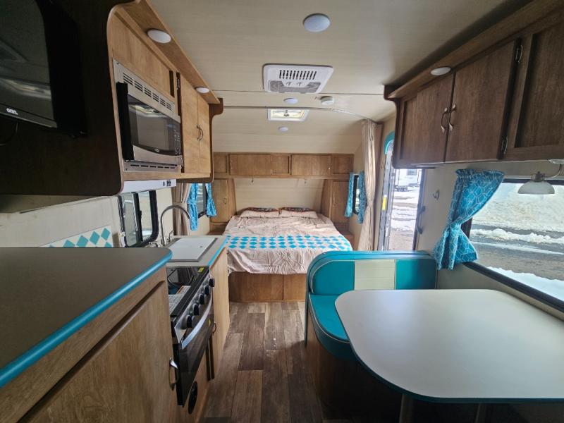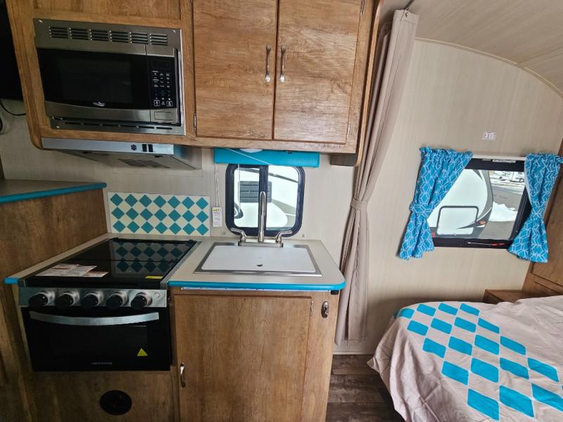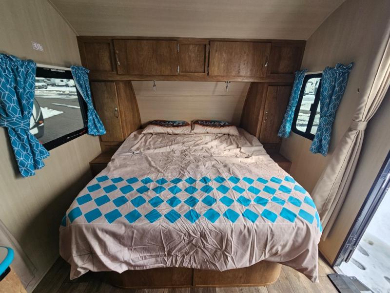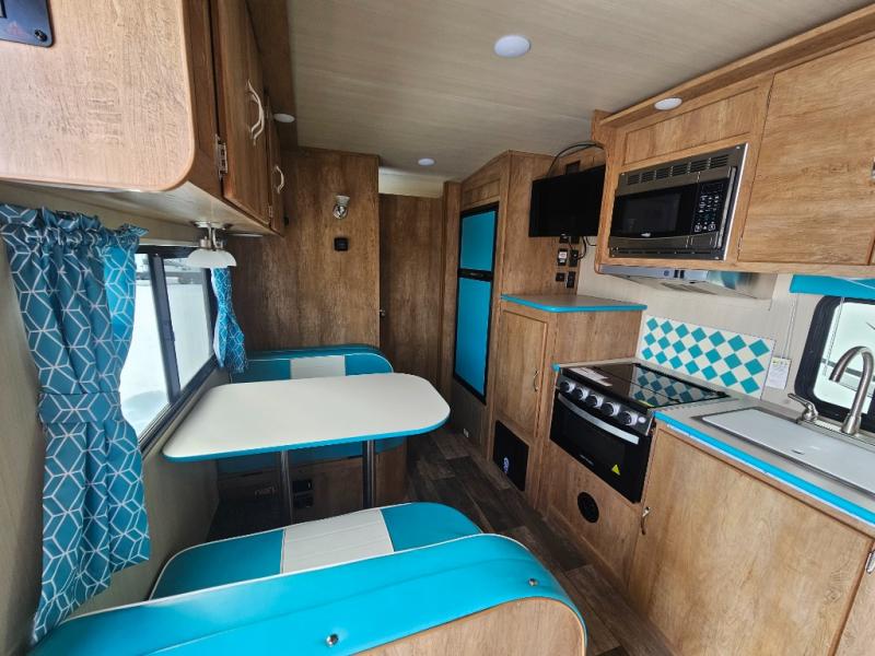 This travel trailer has the same layout as model 18MBS, but you'll enjoy a fixed RV queen bed up front instead of the Murphy bed. The full rear bath includes a linen closet and a wardrobe to keep your necessities organized, and you'll find additional storage throughout this model for your belongings. The vintage booth dinette will be the perfect place to dine at after dinner is made on the two burner cooktop. There is also a microwave oven for quick meals and a 6 cu. ft. double door refrigerator for cold drinks and perishables. And don't forget about the exterior pass-through storage for your larger camp gear!