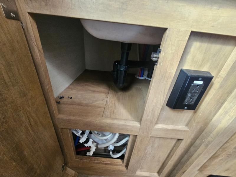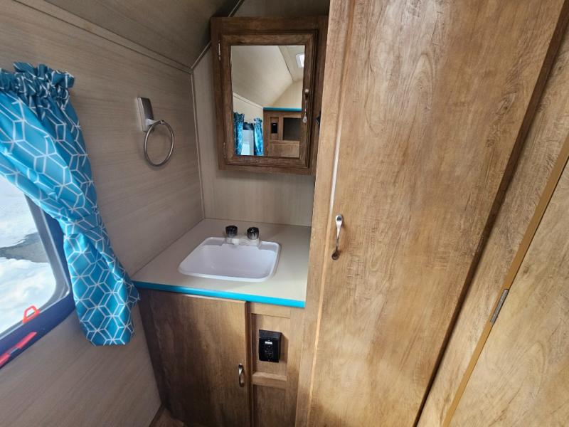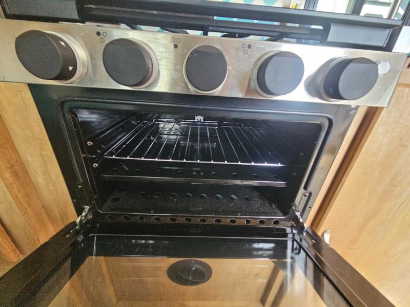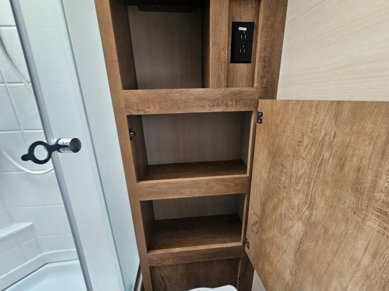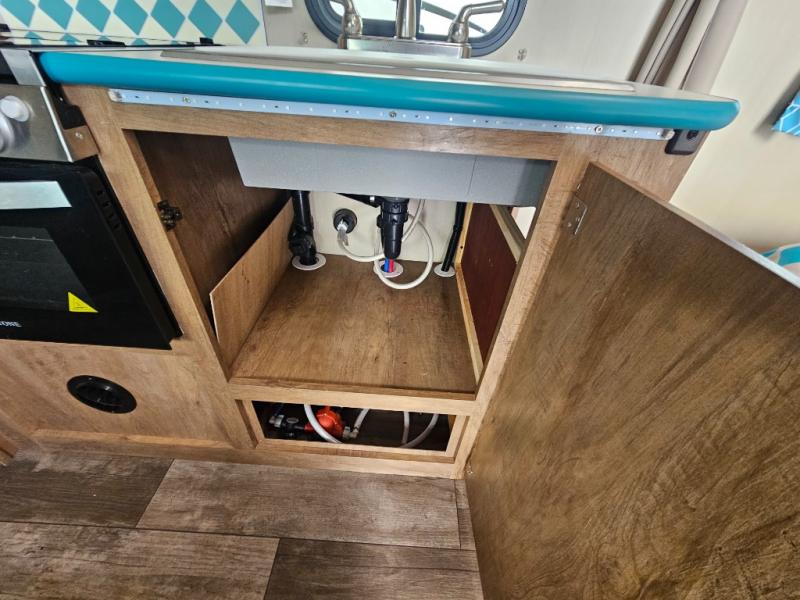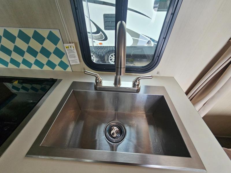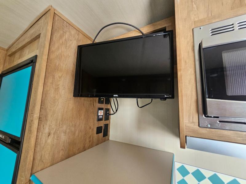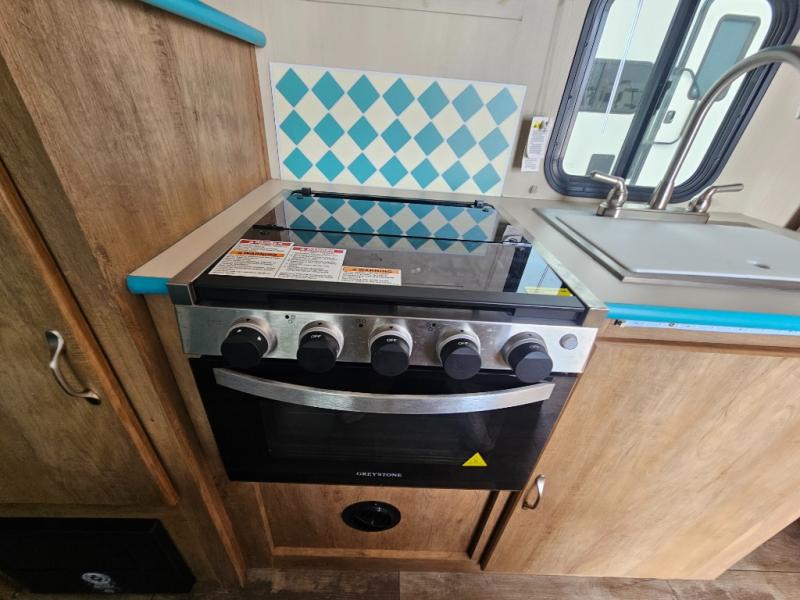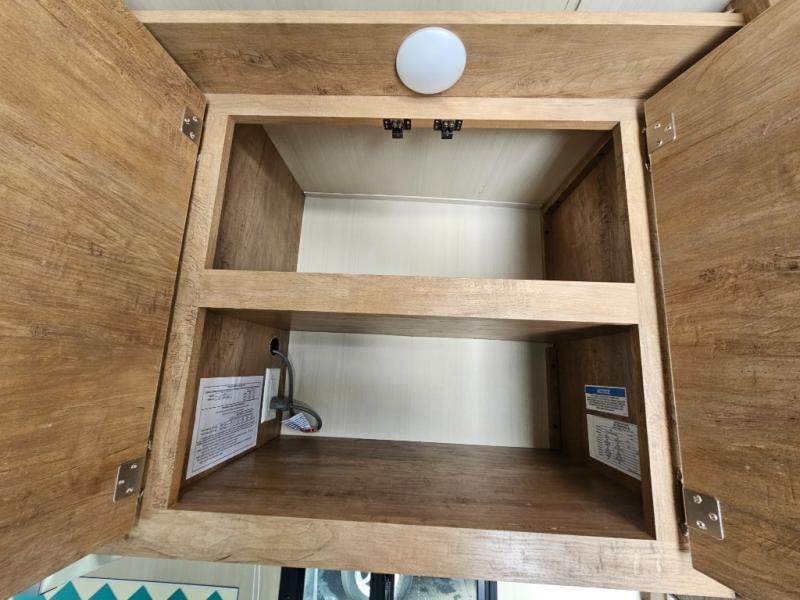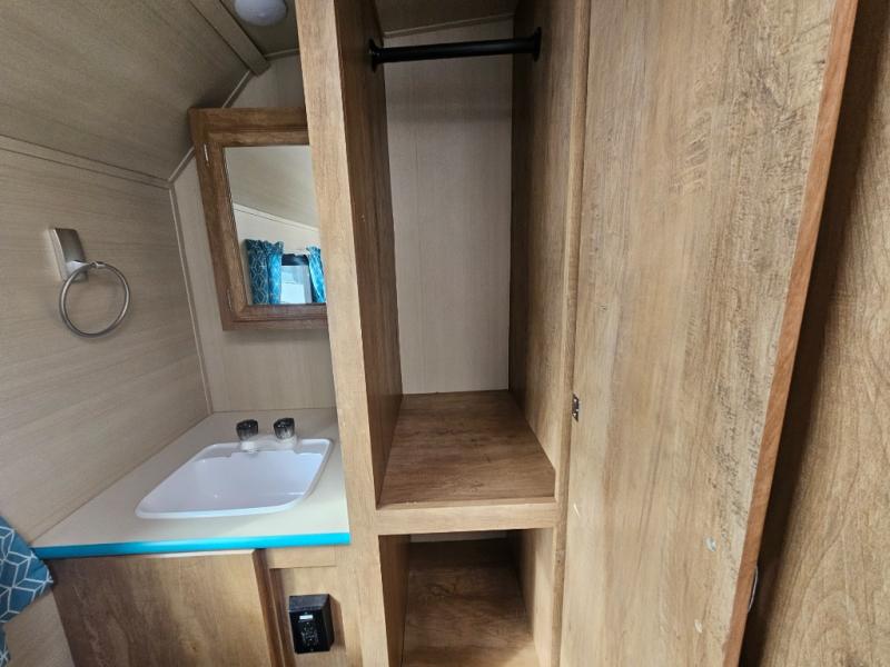 This travel trailer has the same layout as model 18MBS, but you'll enjoy a fixed RV queen bed up front instead of the Murphy bed. The full rear bath includes a linen closet and a wardrobe to keep your necessities organized, and you'll find additional storage throughout this model for your belongings. The vintage booth dinette will be the perfect place to dine at after dinner is made on the two burner cooktop. There is also a microwave oven for quick meals and a 6 cu. ft. double door refrigerator for cold drinks and perishables. And don't forget about the exterior pass-through storage for your larger camp gear!