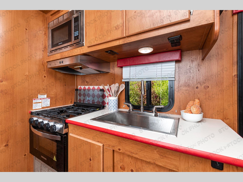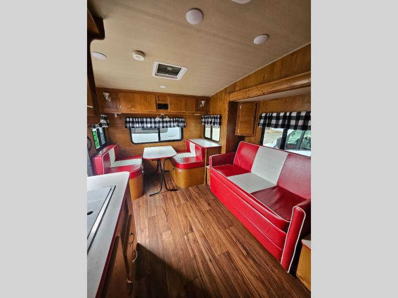 Step into comfort with this classic travel trailer in tow. You will find a rear vintage booth dinette and a sofa slide out with end tables to set your drinks on, and an optional 19" LED HDTV can be added for entertainment. The kitchen is complete with a microwave oven, a two burner cooktop, plus overhead cabinets for your belongings. After a day outdoors, you can clean up in the 24" x 36" shower, and there is a private toilet and sink across the hall if someone needs to use it while you're cleaning up. This model will feel just like home with its RV queen bed and dual shirt closets for your clothes.