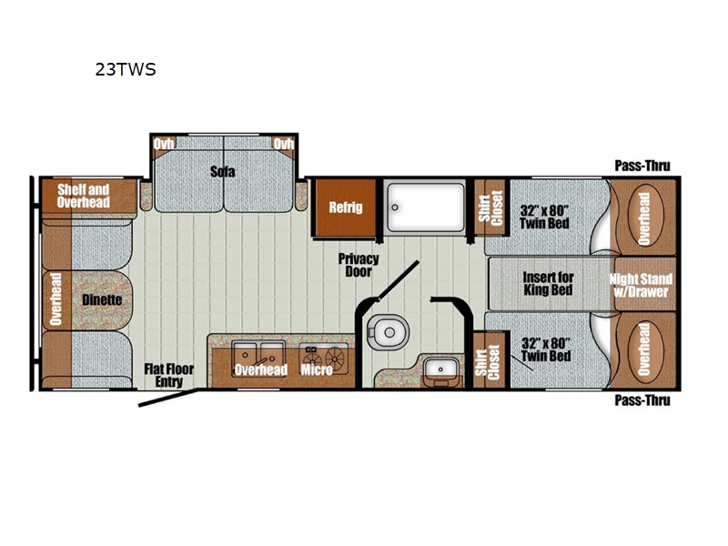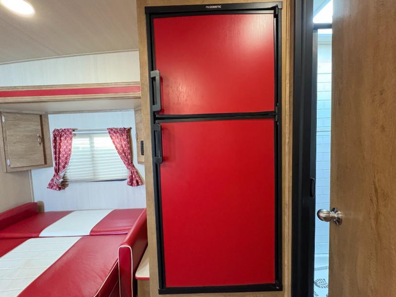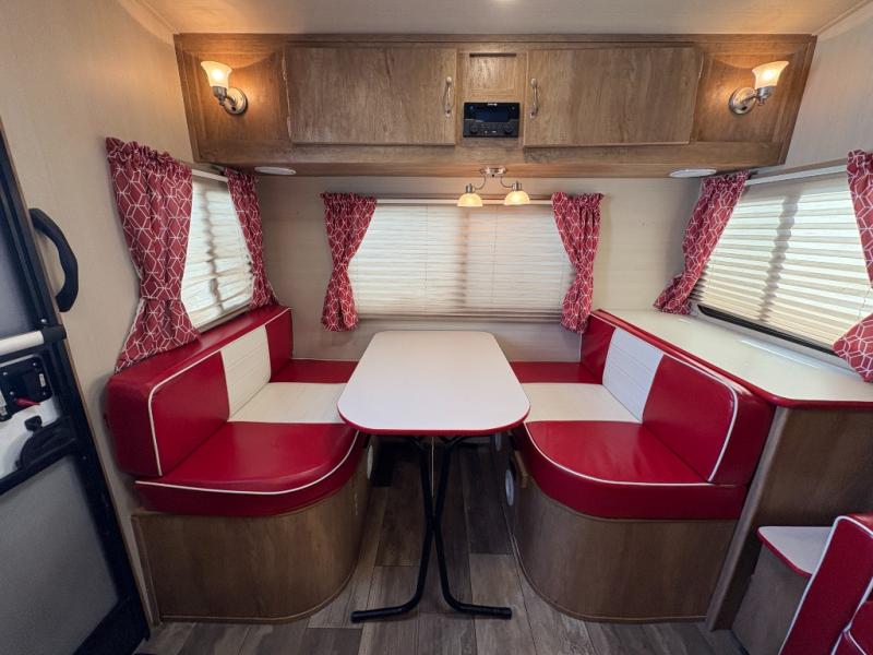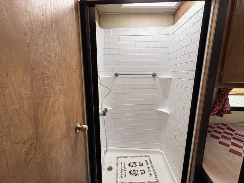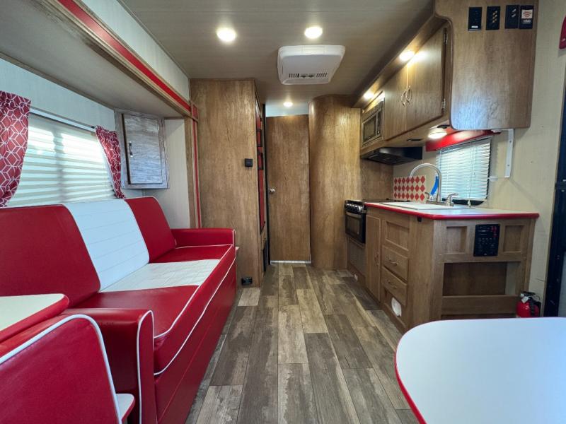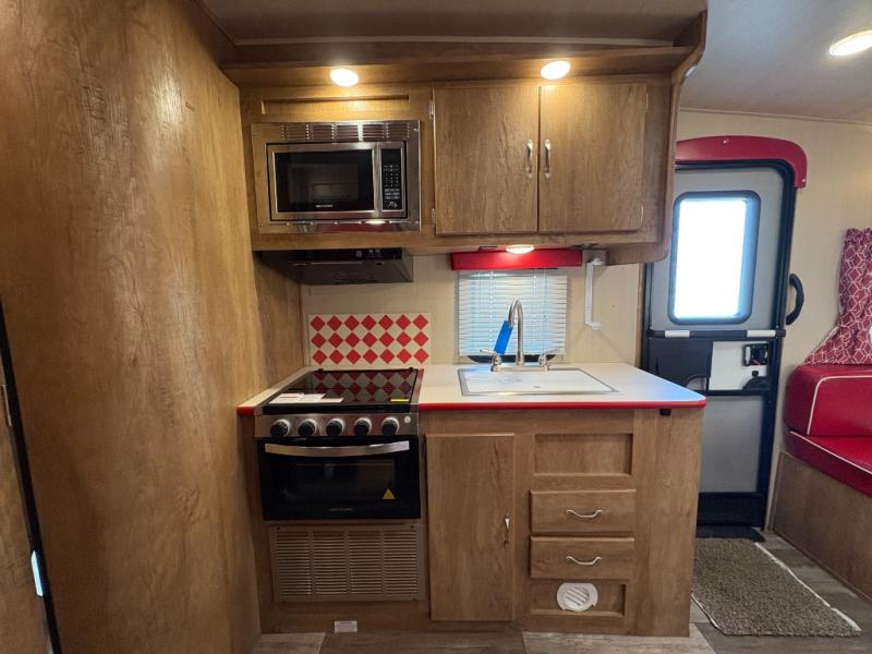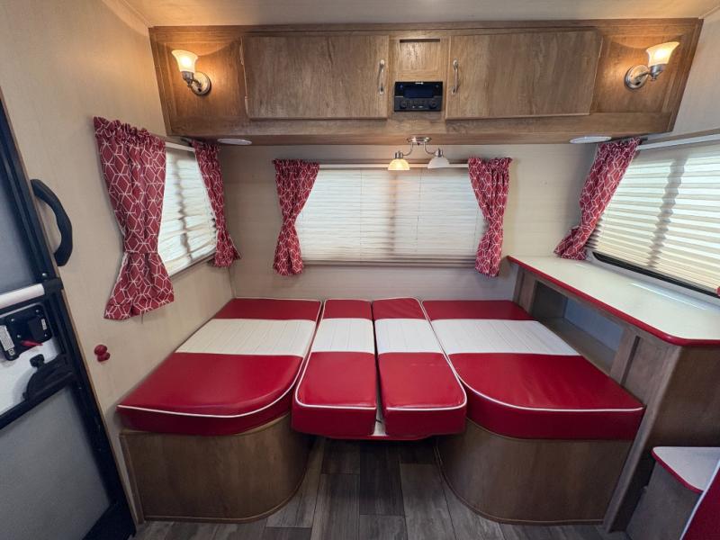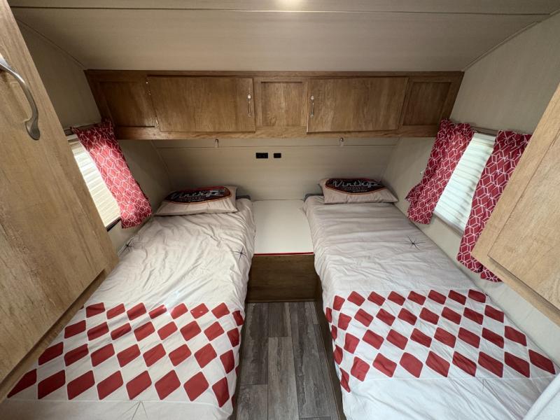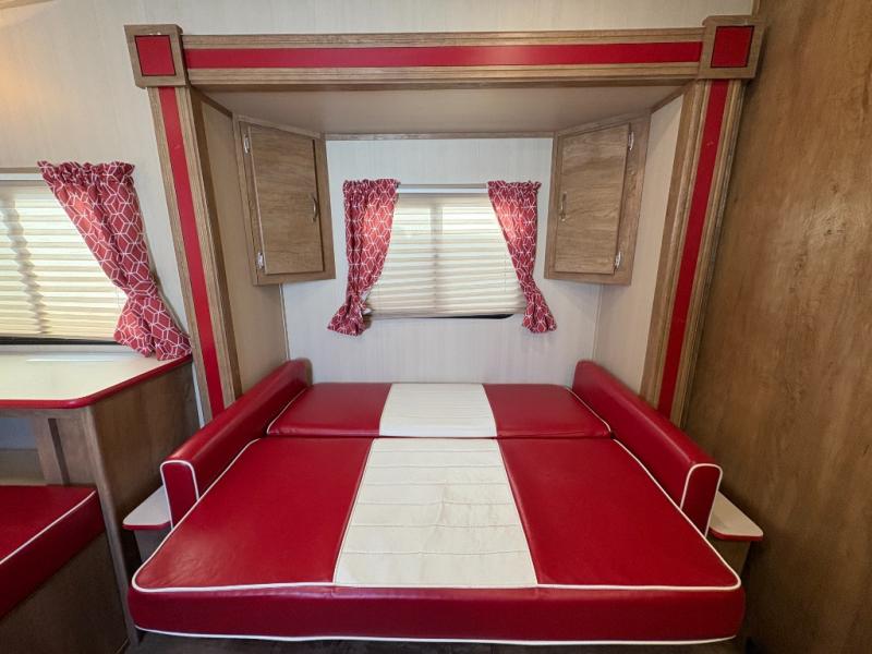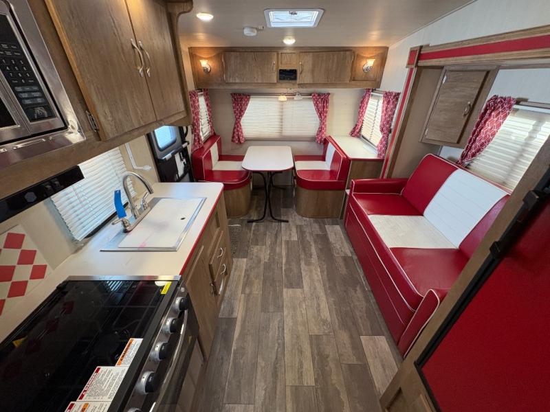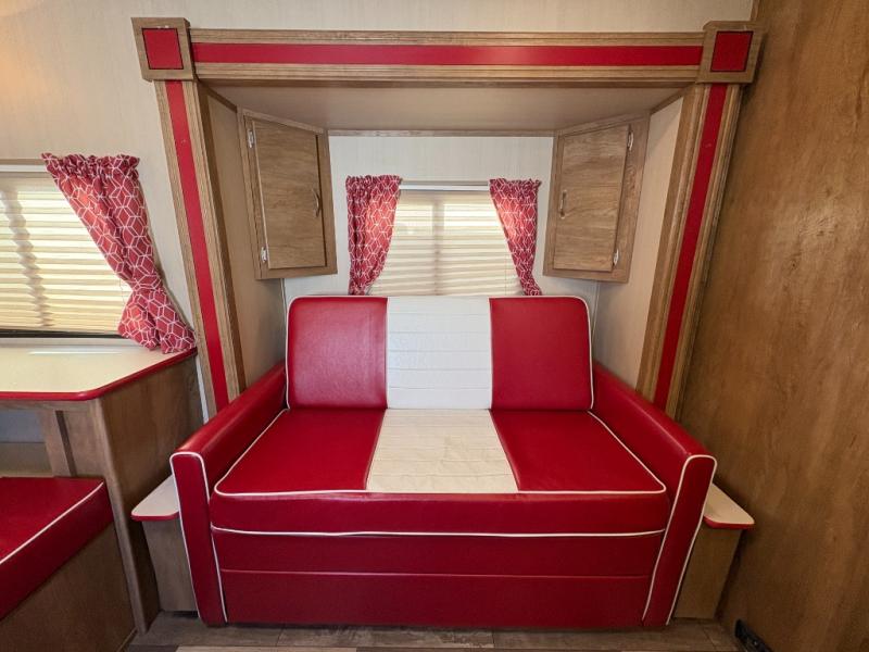 Step into comfort with this classic travel trailer in tow. You will find a rear vintage booth dinette and a sofa slide out with end tables to set your drinks on, and an optional 19" LED HDTV can be added for entertainment. The kitchen is complete with a microwave oven, a two burner cooktop, plus overhead cabinets for your belongings. After a day outdoors, you can clean up in the 24" x 36" shower, and there is a private toilet and sink across the hall if someone needs to use it while you're cleaning up. In the front bedroom you'll find twin beds with an insert to convert them into a king-size bed, plus dual shirt closets. How convenient!