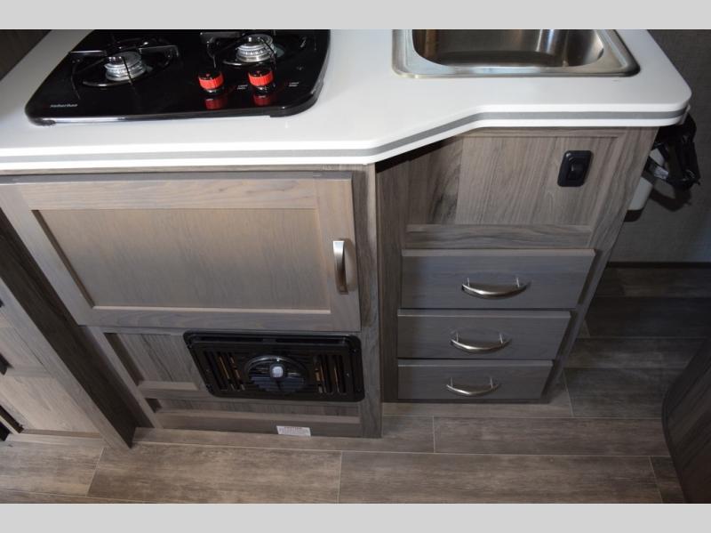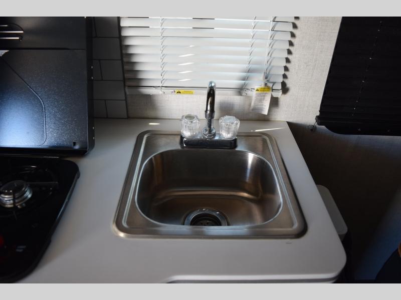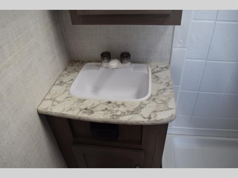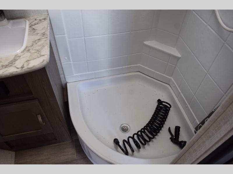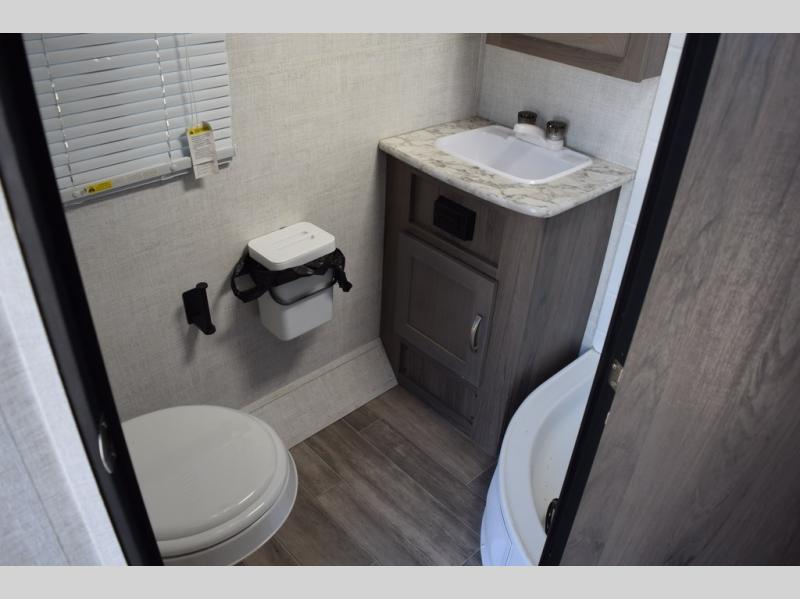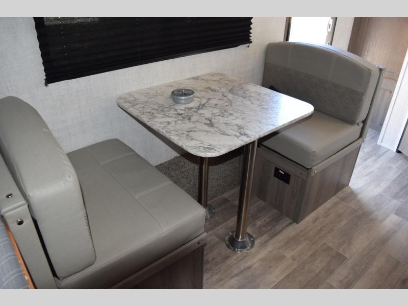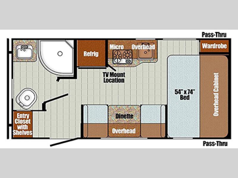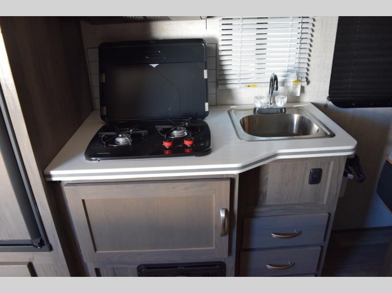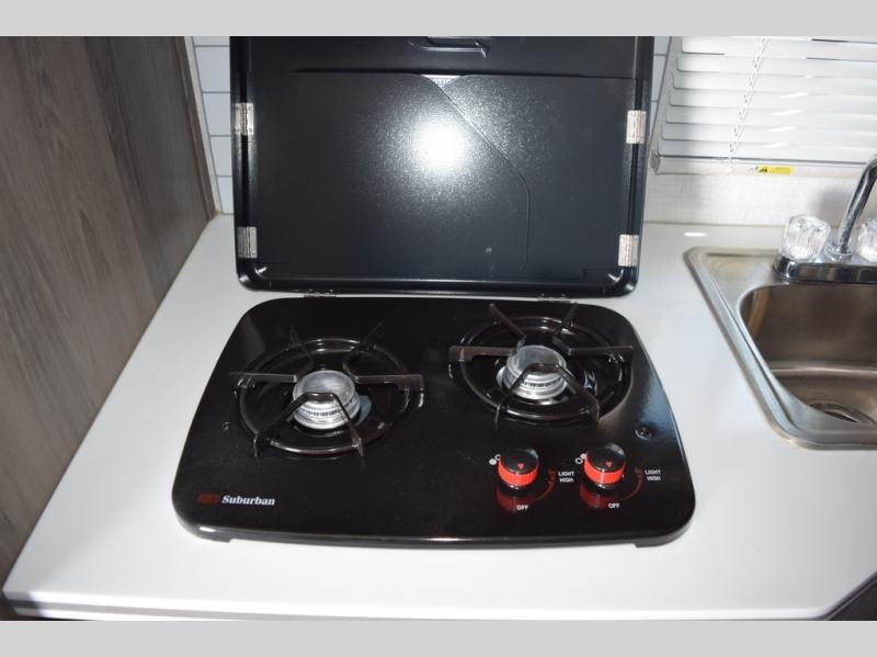 Enjoy a fun weekend camping with your spouse in this travel trailer! It features an entry closet with shelves next to the rear corner bathroom which has a radius shower and a high velocity fan to eliminate any unwanted steam. Across from the booth dinette is a TV mount location, a two burner cooktop, a sink with a designer stainless hi-access faucet, and a two door 5 cu. ft. single-door refrigerator to store your catch of the day. When you're ready to wind down a fun day, head to the front 54" x 74" bed to relax!