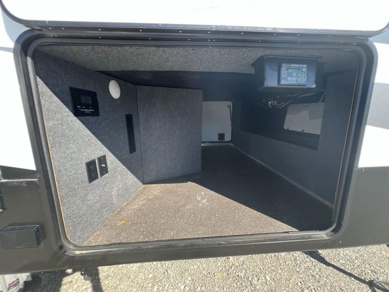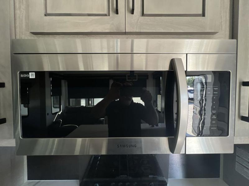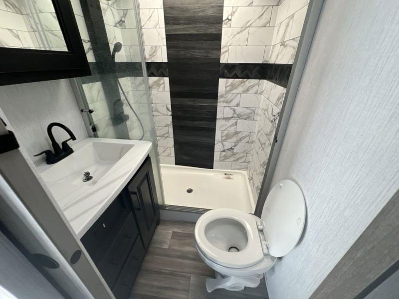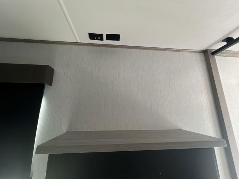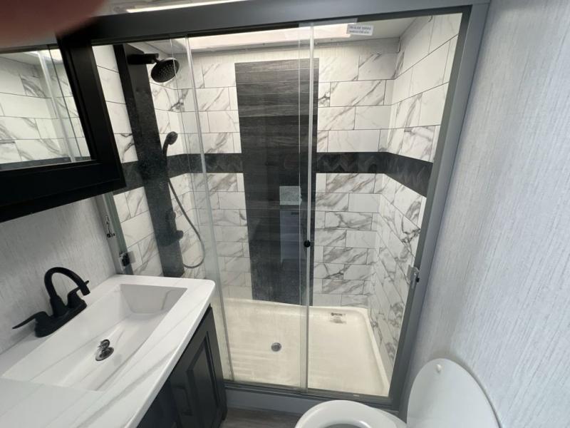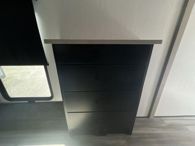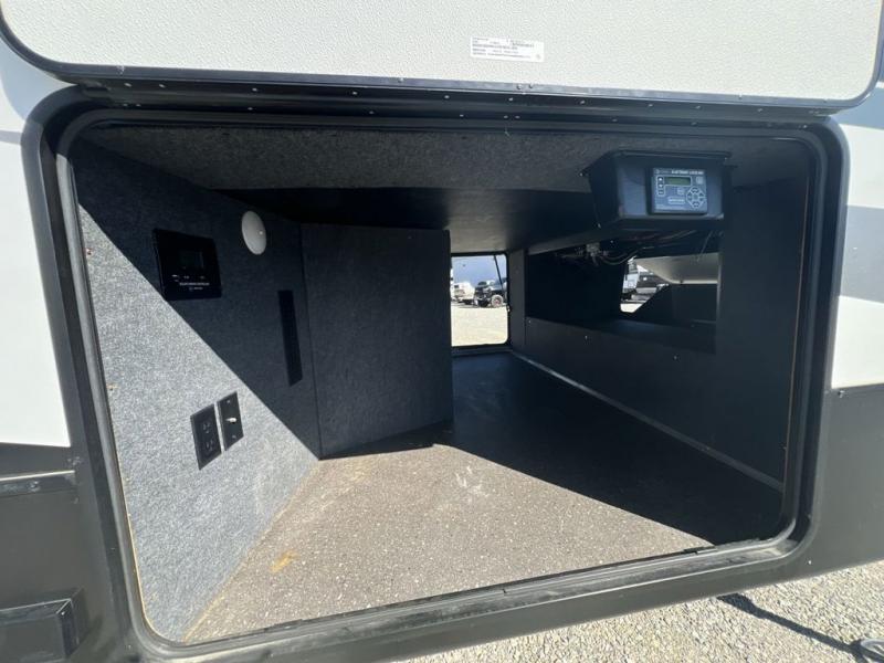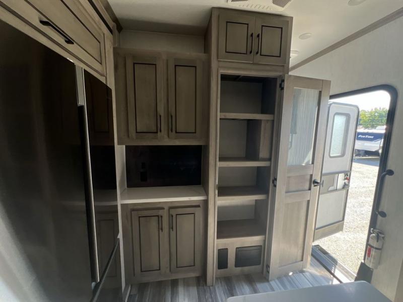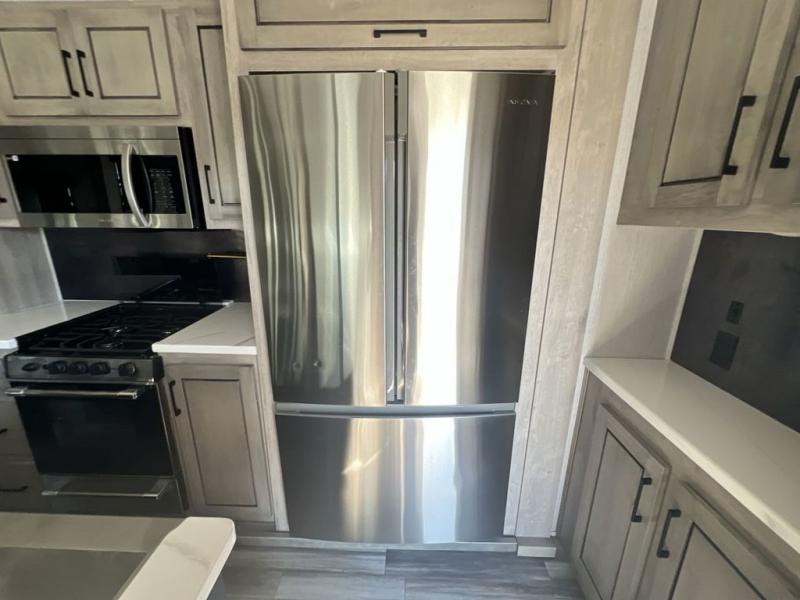Pack your bags and head out on a great weekend getaway! The cook will love the kitchen island with the farm style sink, the full-size pantry for storage and the stainless steel appliances. The dual slides in this main living and kitchen area give you lots of floor space to relax on the tri-fold sofa sleeper or the theater seats with heat and massage. The free-standing table offers two chairs for dining or playing games. When you are ready for bed, you can get cleaned up in the full bathroom with a 6' 4" bath ceiling height, and easily fall asleep on your own king bed slide. The master bedroom also includes a closet prepped to add an optional washer and dryer, a walk-in wardrobe closet, plus a dresser to keep your clothes tidy!