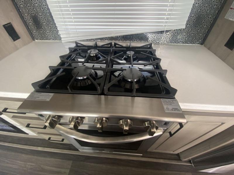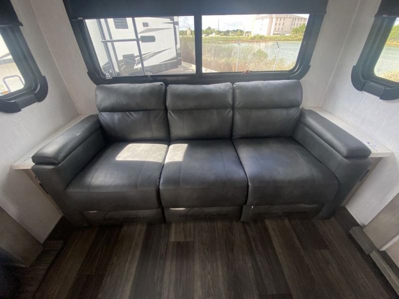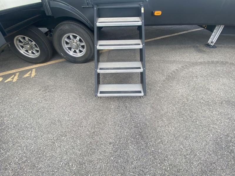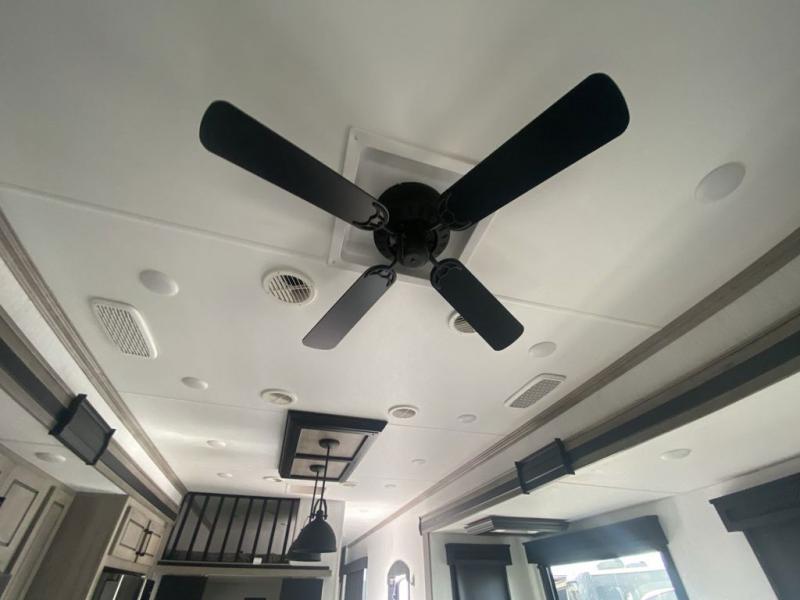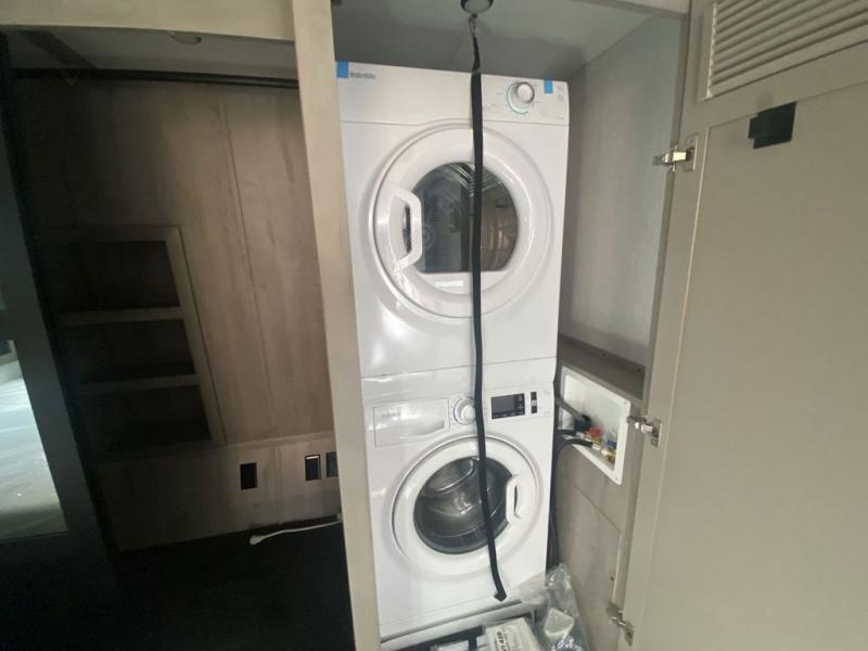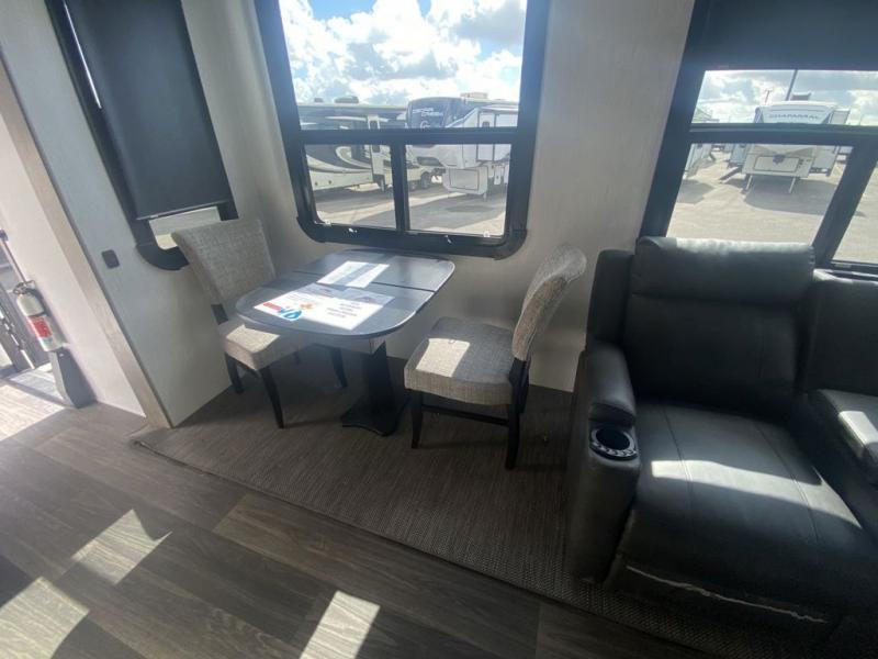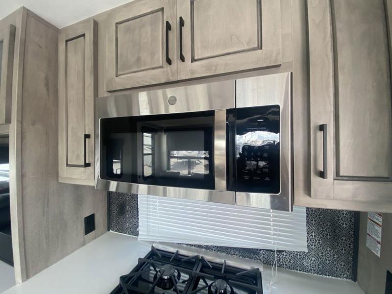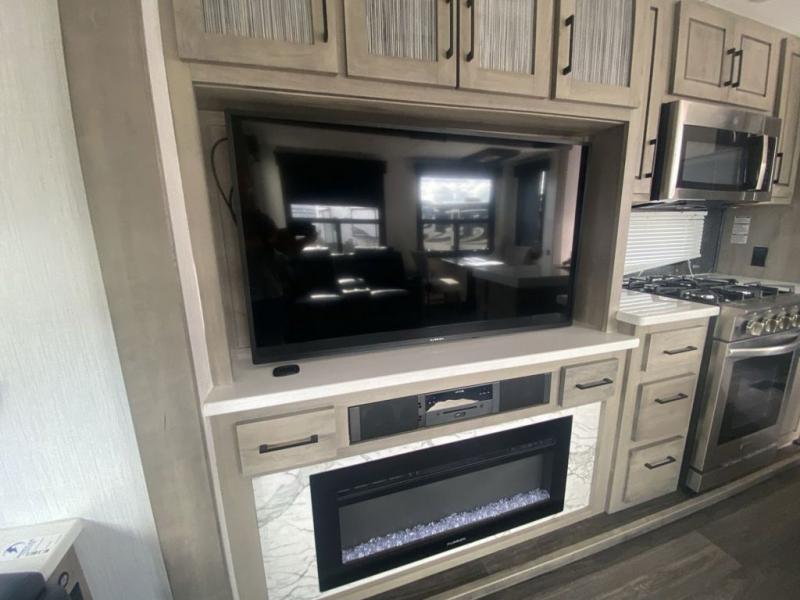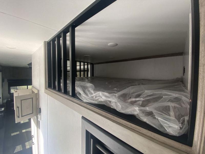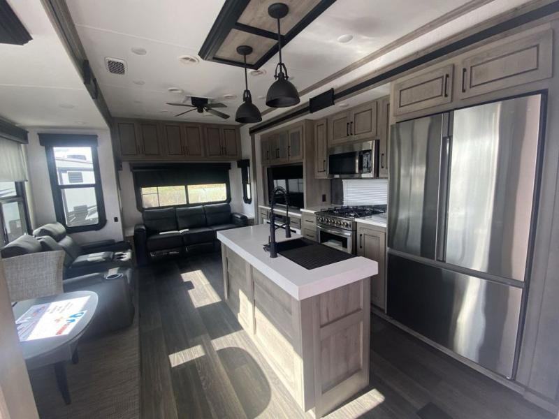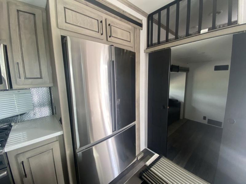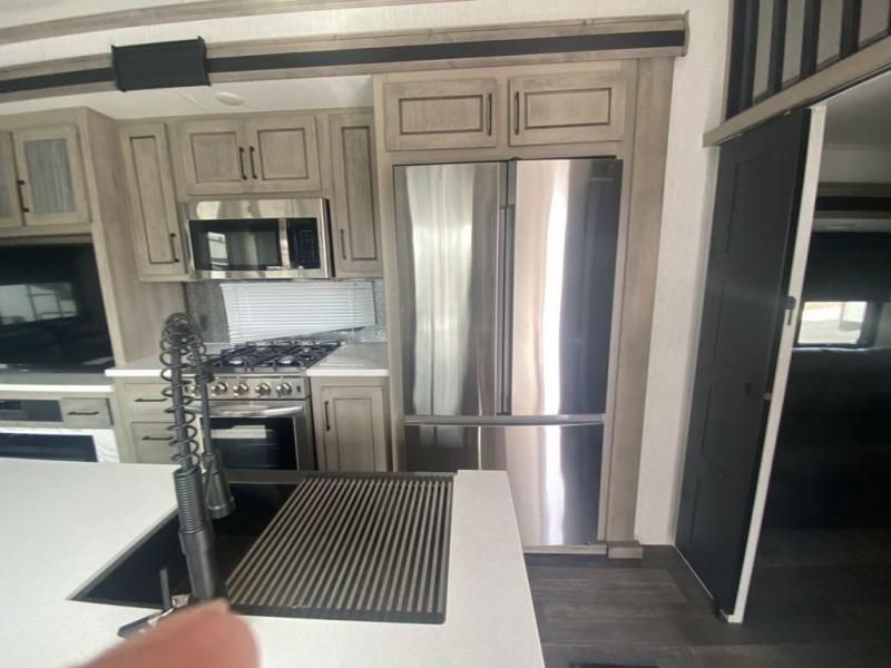 When you travel to see new places and sometimes have to work while away, this fifth wheel gives you a private office with a desk that can also be utilize as a second living area and bedroom thanks to the sofa slide and storage. There is a loft above for more sleeping space and storage that can be accessed using the ladder in the hallway. The double entry bathroom is convenient, and the front bedroom offers a king bed slide, lots of clothing storage, plus a space prepped for a washer/dryer option. The main living and kitchen area is spacious as well with dual slides, and you can relax on the tri-fold sleeper sofa or in the theater seats with heat and massage. There is also a 55" big screen TV and a built-in 40" electric fireplace to add more coziness. The cook will love the stainless steel appliances, the farm style sink, the full-size pantry and being able to dine at the free-standing dinette.