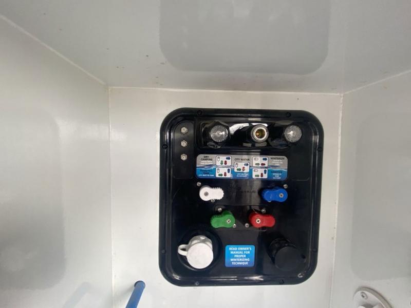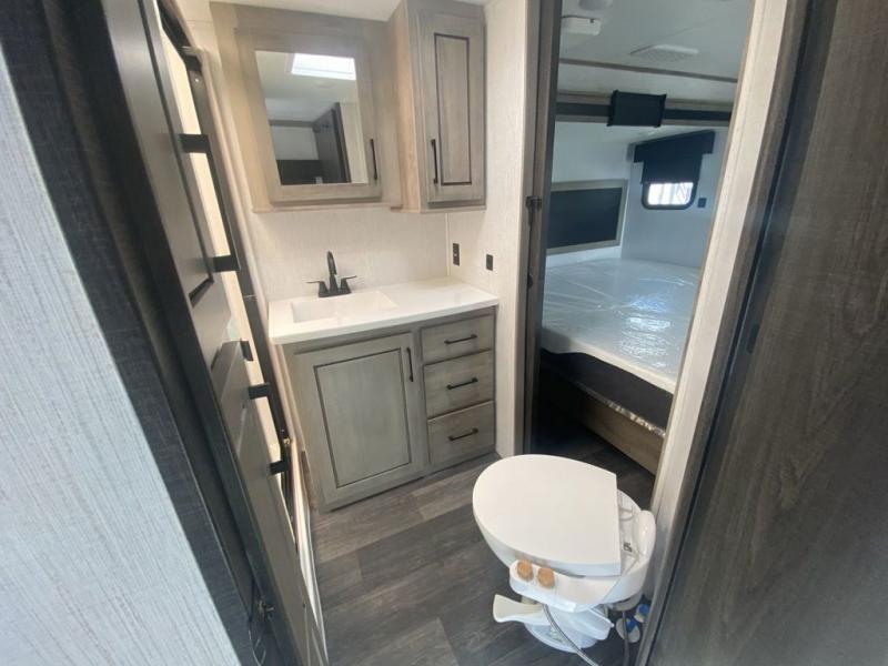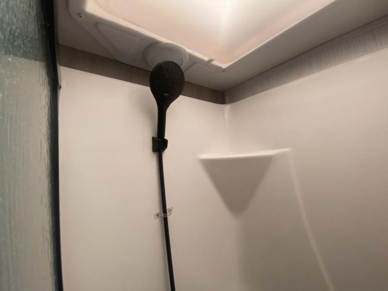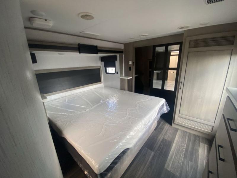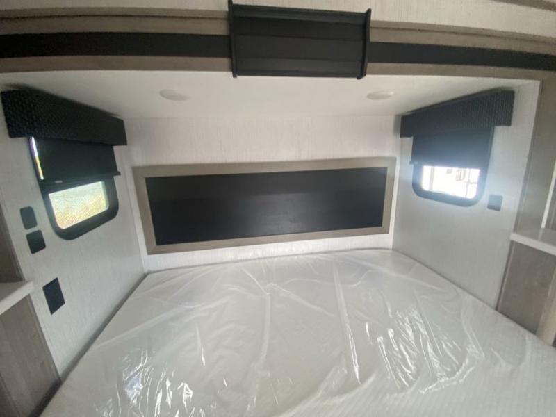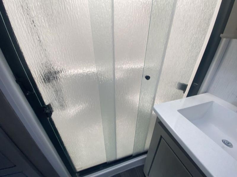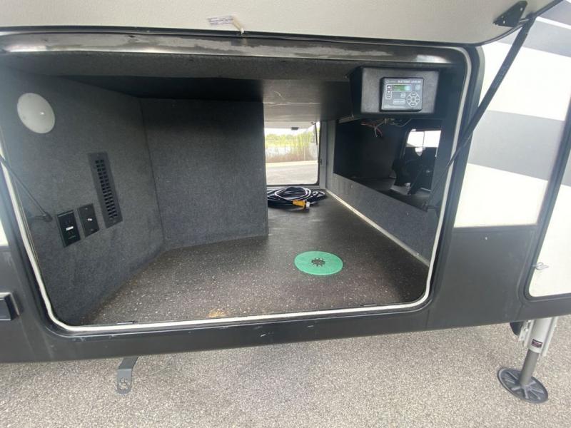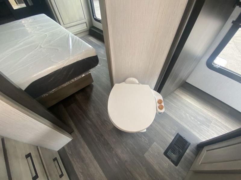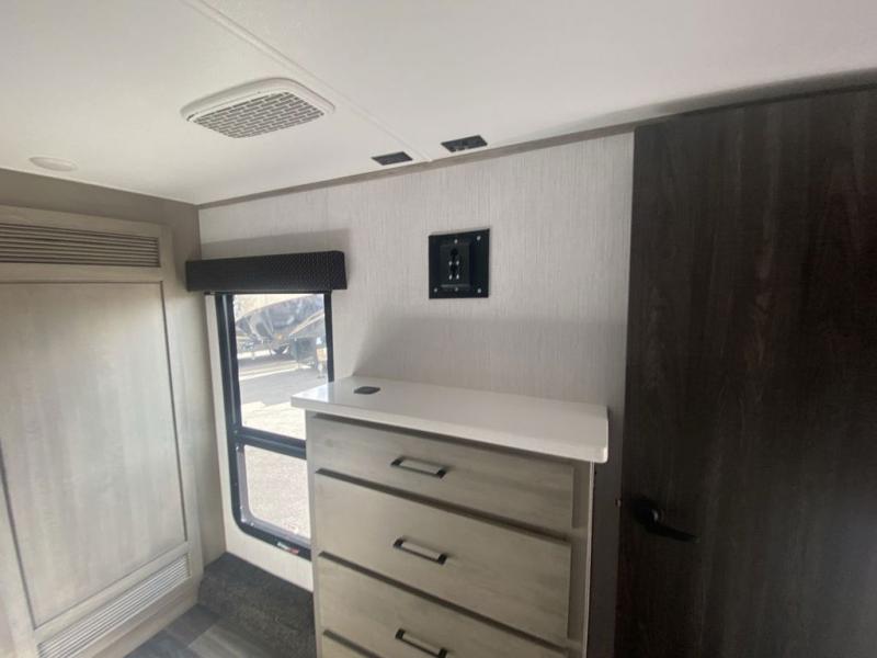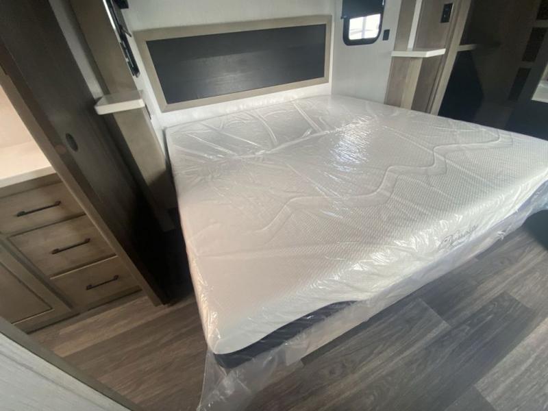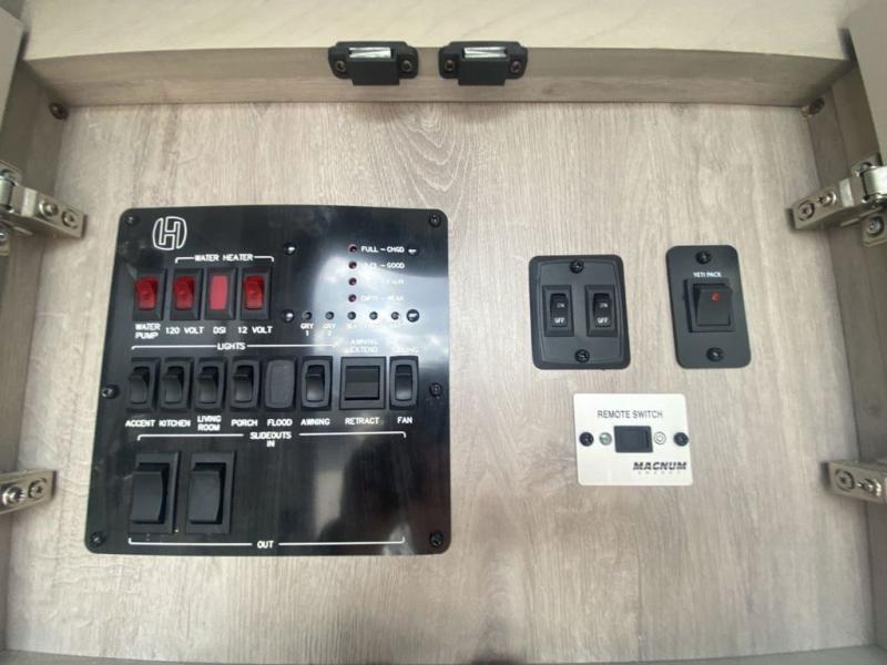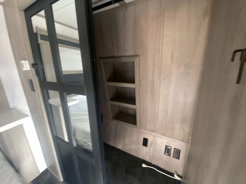 When you travel to see new places and sometimes have to work while away, this fifth wheel gives you a private office with a desk that can also be utilize as a second living area and bedroom thanks to the sofa slide and storage. There is a loft above for more sleeping space and storage that can be accessed using the ladder in the hallway. The double entry bathroom is convenient, and the front bedroom offers a king bed slide, lots of clothing storage, plus a space prepped for a washer/dryer option. The main living and kitchen area is spacious as well with dual slides, and you can relax on the tri-fold sleeper sofa or in the theater seats with heat and massage. There is also a 55" big screen TV and a built-in 40" electric fireplace to add more coziness. The cook will love the stainless steel appliances, the farm style sink, the full-size pantry and being able to dine at the free-standing dinette.