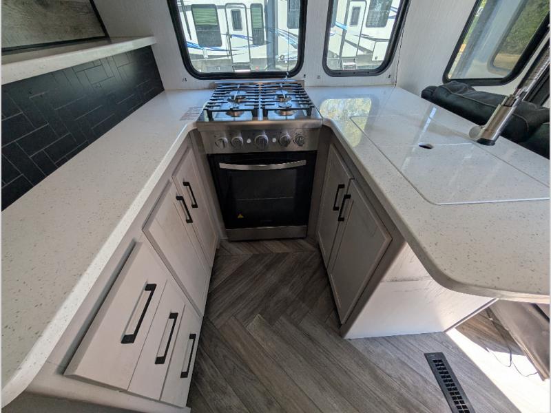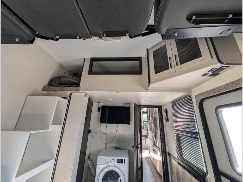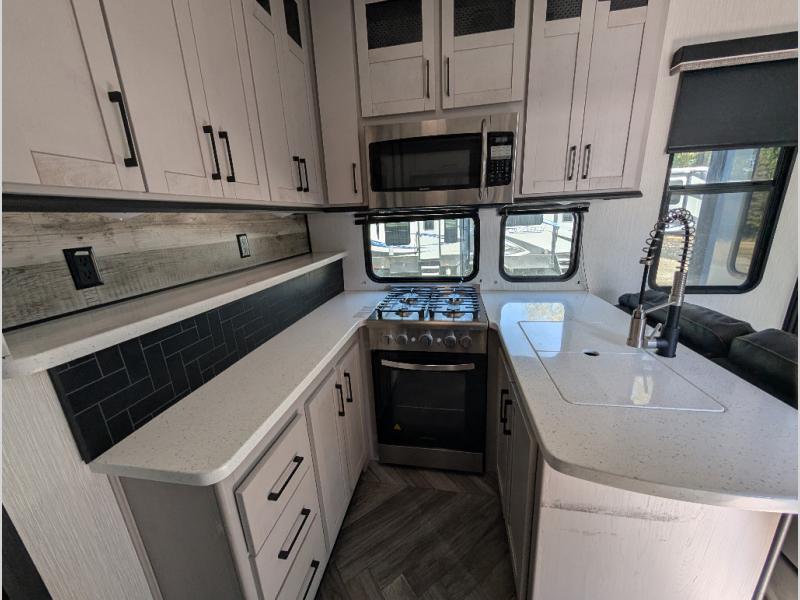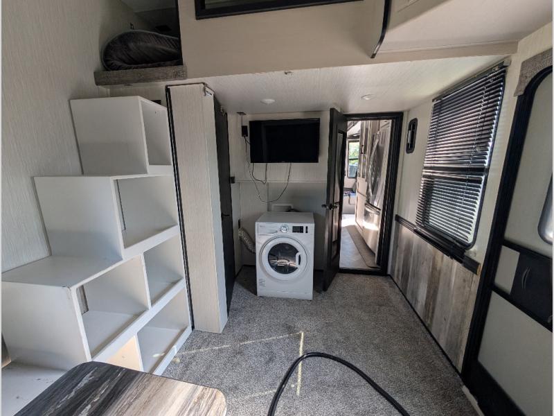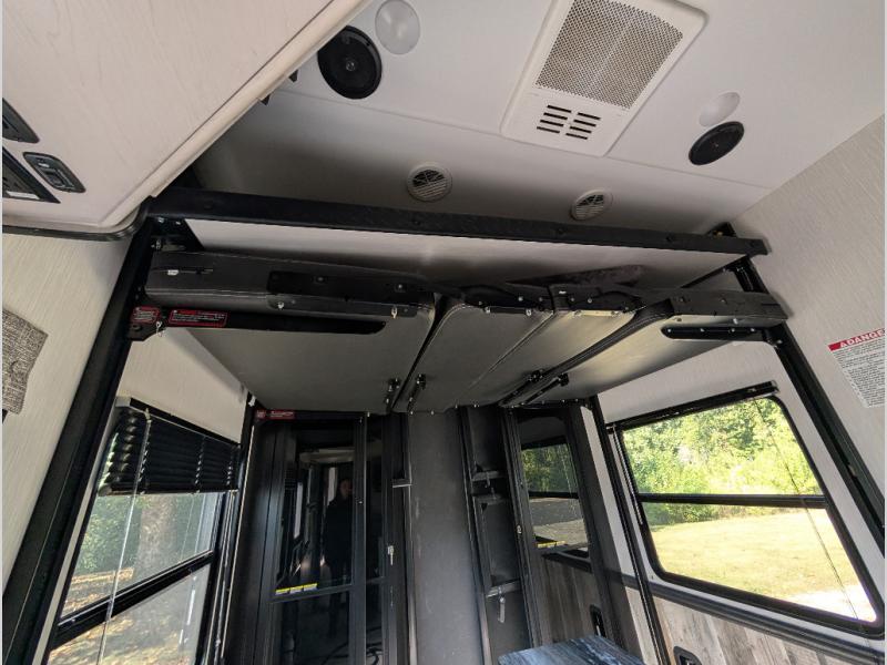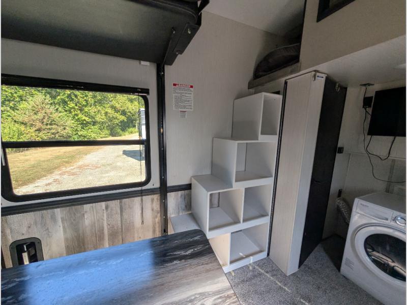 Everyone will have a comfortable place to sit in this toy hauler with the dual opposing theater seating slides and the third theater seating across from the 50" LCD HDTV! The 3,000 lb. weather resistant 8' ramp door makes it easy to load your toys into the 13' garage, and your guest can make this their bedroom at night. Here, you'll find an electric queen bed with a split bench seat/bed underneath, a half bath, plus a loft. There is even washer and dryer prep for wash day! The kitchen includes plenty of countertop space to prepare your best home cooked meals, or you can head outside to cook on the outdoor Grill N Chill three burner griddle combo!